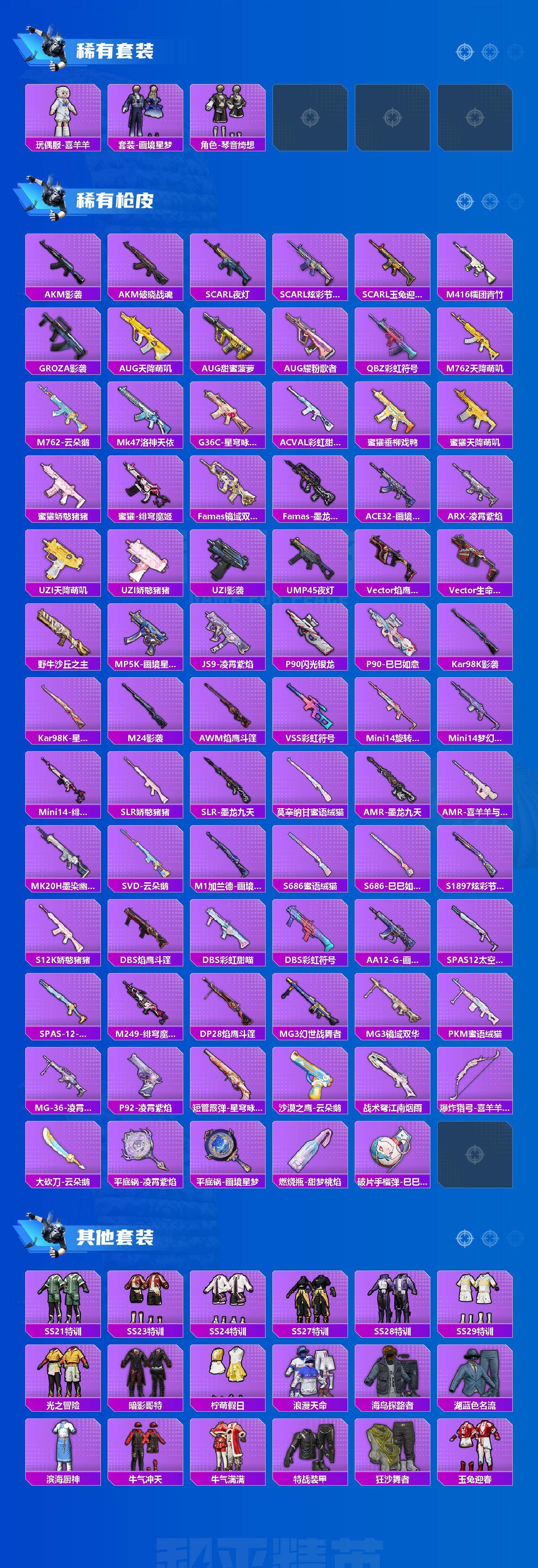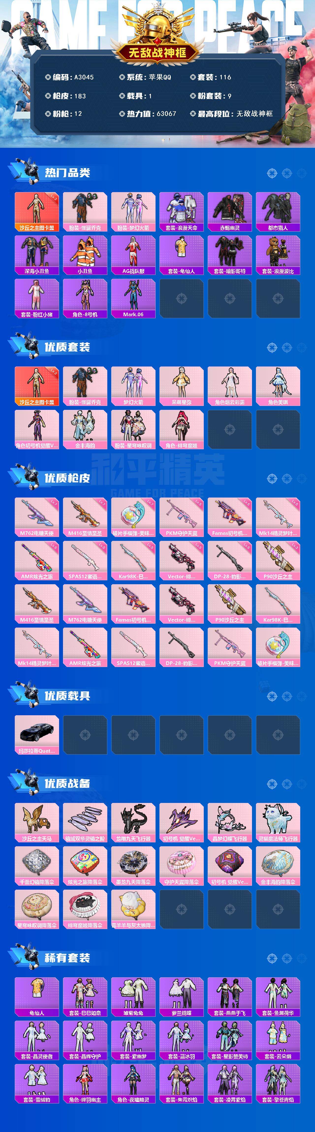 苹果【素材号/沙丘之主-图卡盟(三级)/怪诞乔克/梦幻火箭/赤蝎幽灵/都市猎人/暗影哥特/蓝螳螂/角色-初号机 觉醒Ver.】 手Q-无敌战神框-1神装-9粉装-12特效枪-1载具-9粉色飞行器-63067热力值-10王牌印记-116套装-183枪皮