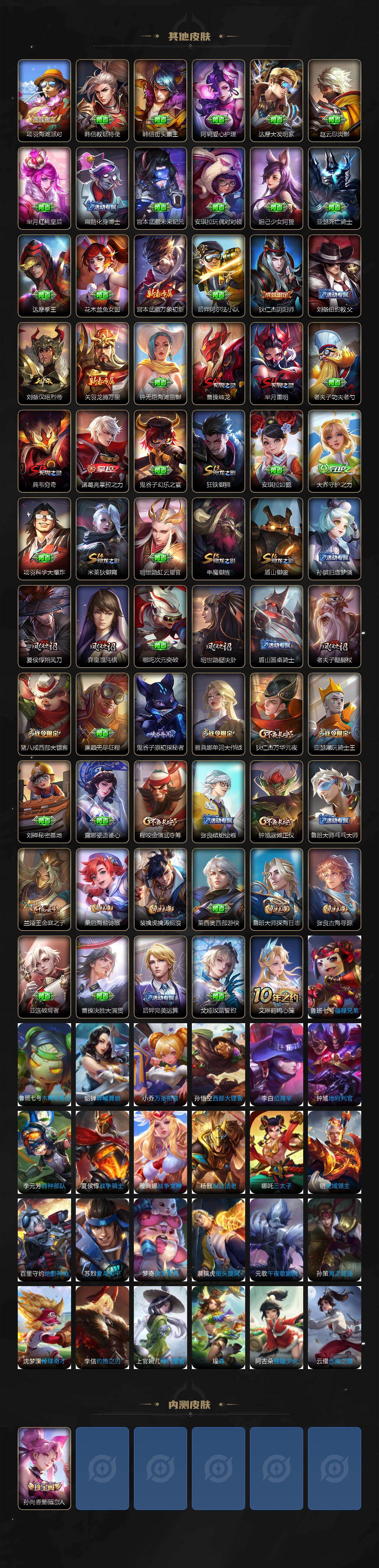【限定皮肤】:狄仁杰阴阳师,赵云皇家上将,孙尚香蔷薇恋人,芈月重明,元歌云间偶戏,夏侯惇朔风刀,曹操烛龙,典韦穷奇,马可波罗暗影游猎,狄仁杰万华元夜,项羽海滩派对,老夫子醍醐杖,程咬金演武夺筹,兰陵王金庭之子,亚瑟潮玩骑士王,孙悟空至尊宝,牛魔御旌,钟馗驱傩正仪,雅典娜单词大作战,蔡文姬繁星吟游,鬼谷子