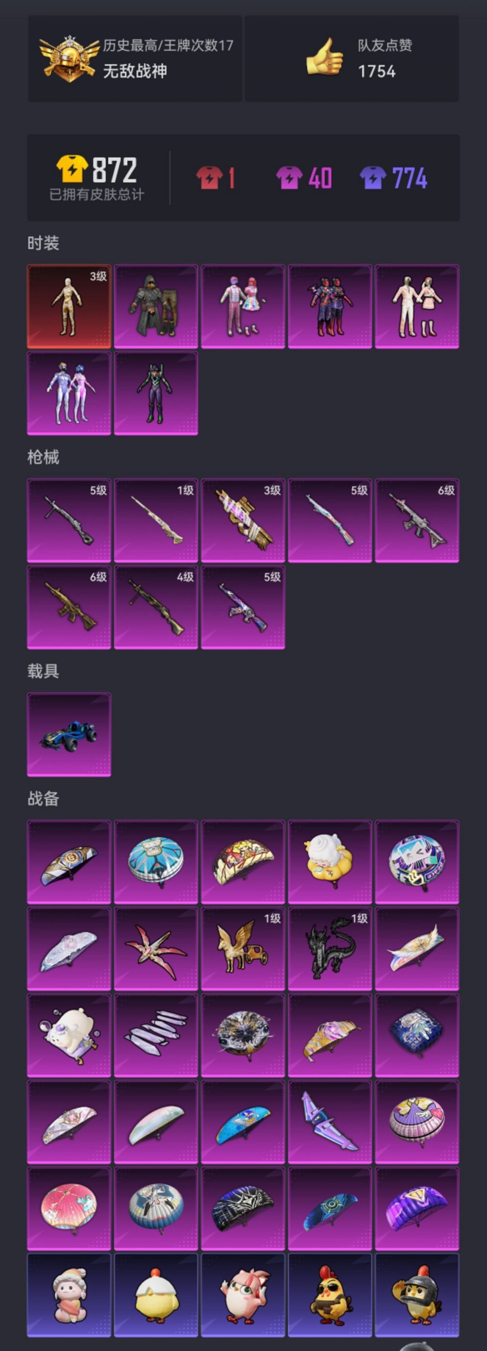 631-【3级图卡盟战神框M4超新星8特效枪6粉装1载具金鞋都市男神小熊背包猫包M4星际漫游身法素材号】、苹果V区-83503热力值-17印记-历史最高段位:无敌战神-176套装-241枪皮、【1红装】、沙丘之主-图卡盟(3级)【1载具】、合金龙骨蓝色【6稀有】、派对舞王、M416-星际漫游、派对舞王(金靴子)、都市猎人、萌熊伴侣背包(小熊背包)、百万伏待背包(猫包)【6粉装】、初号机款机体服(紫螳螂)、梦幻火箭、天使彩虹糖、星之彼岸、第五大道、极限特训【8特效枪】、M416-超新星(6级)、M