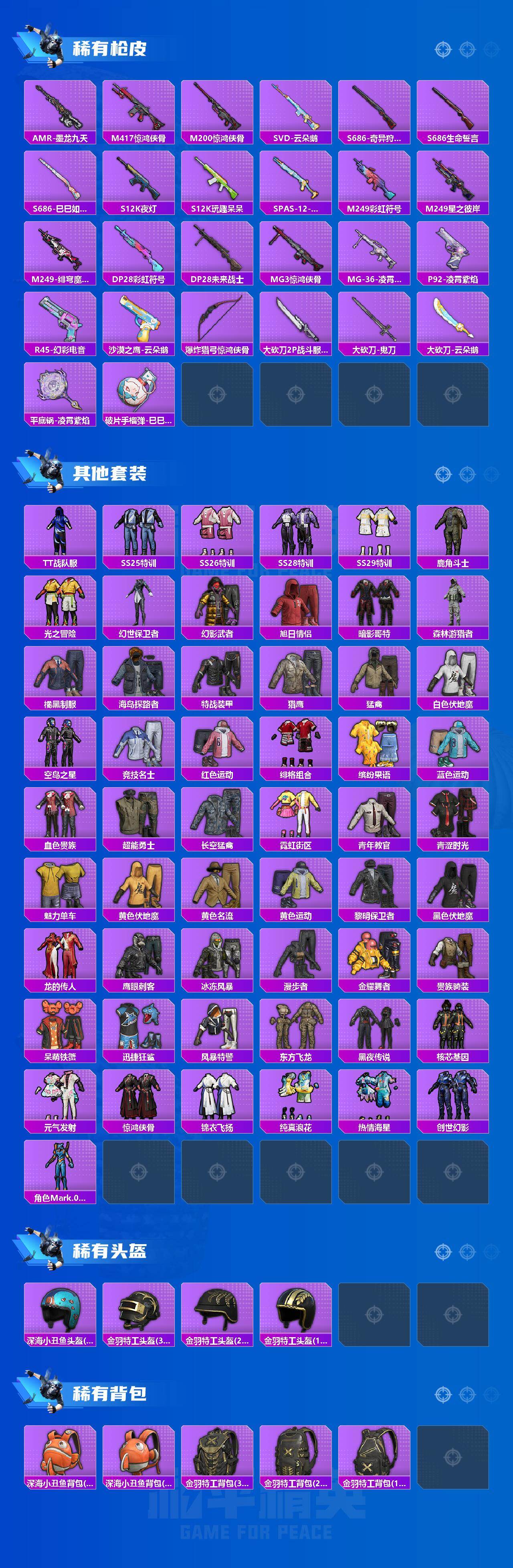 【粉色枪皮等级】:AKM-炫紫旋律(七级),AUG-暖羊咩咩(五级),M762-青锋波束(五级),Kar98K-巳巳如意(五级),M24