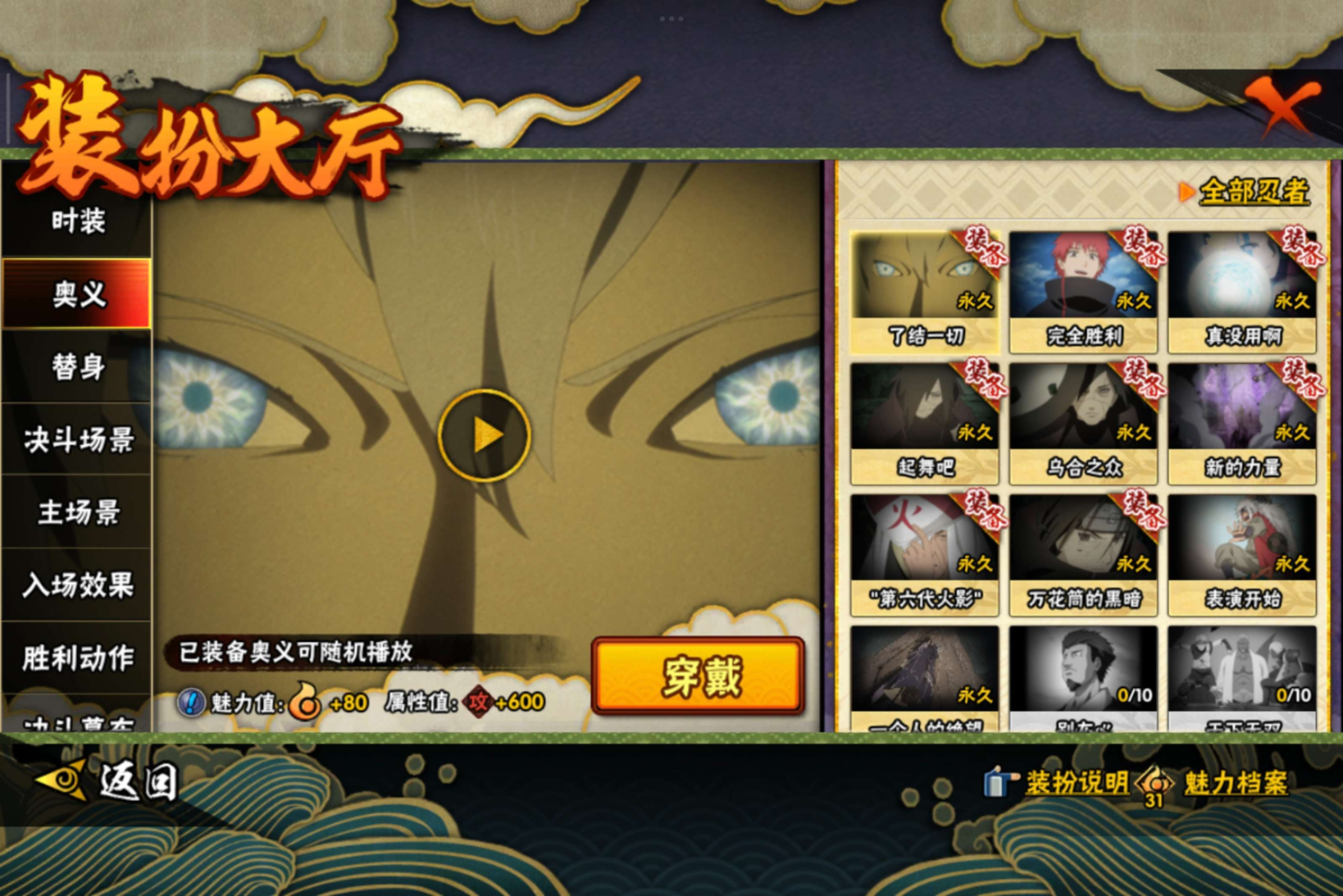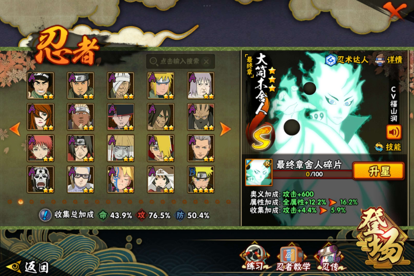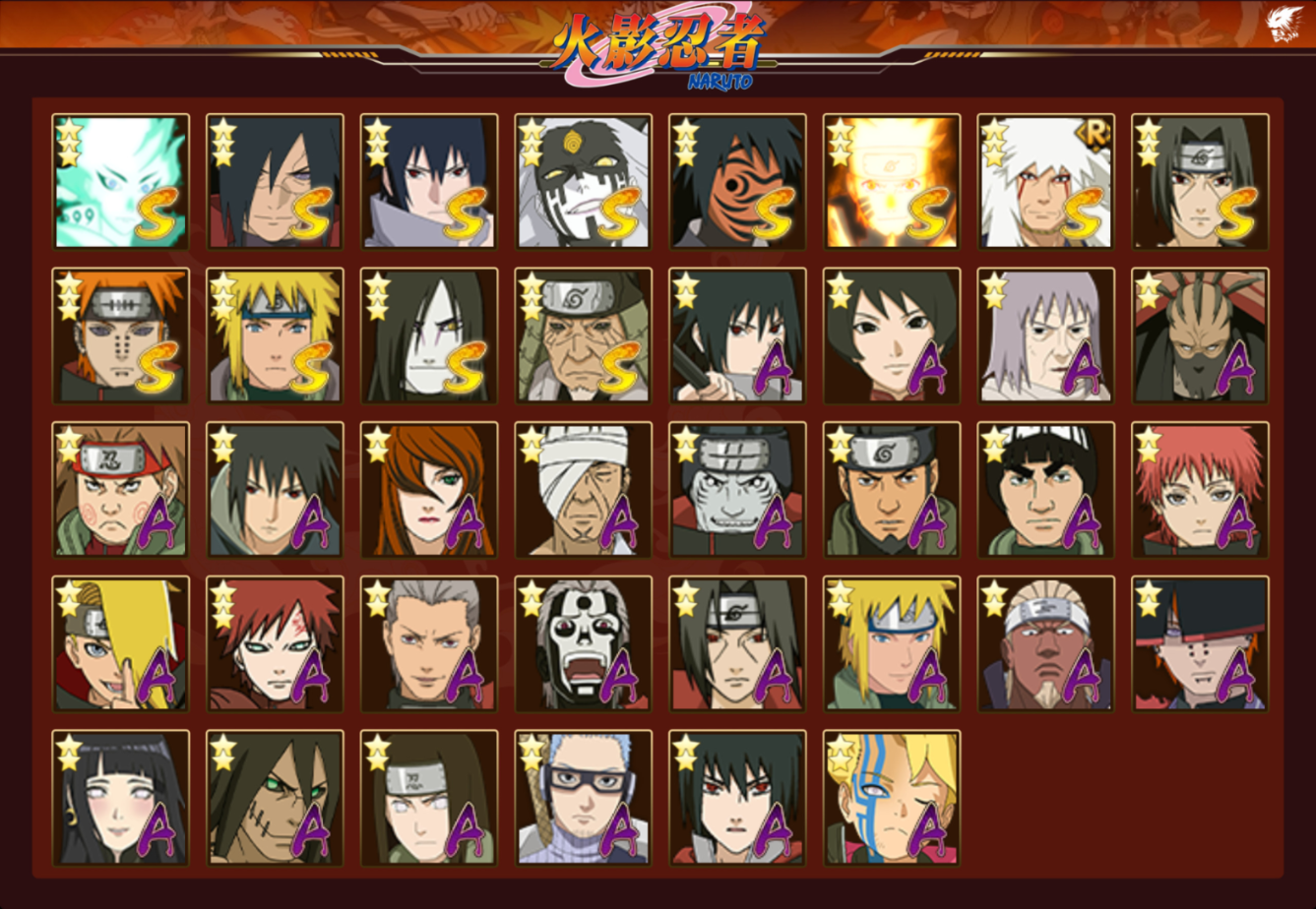 【S级忍者】自来也「传说中的三忍」(3星),大筒木舍人「最终章」(3星),宇智波斑「秽土转生·解」(3星),宇智波佐助「永恒万花筒」(3星),大筒木桃式(3星),神秘面具男「红夜之刃」(3星),漩涡鸣人「九喇嘛连结」(3星),自来也「舞之豪杰」(3星),宇智波鼬「须佐能乎」(3星),佩恩「天道」(3星),波风水门(3星),大蛇