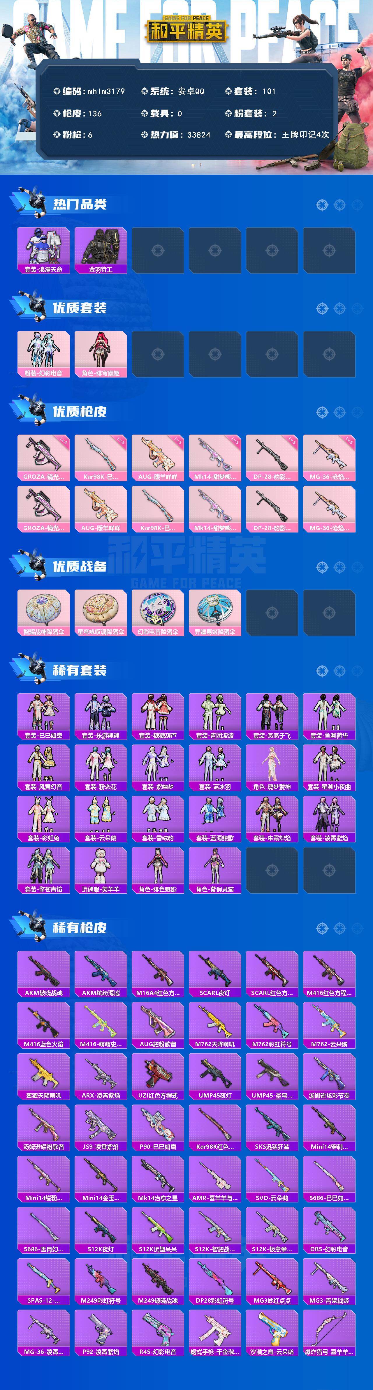 【mhlm3179】安卓 手Q-2粉装-6特效枪-0载具-1粉色飞行器-33824热力值-4王牌印记-101套装-136枪皮