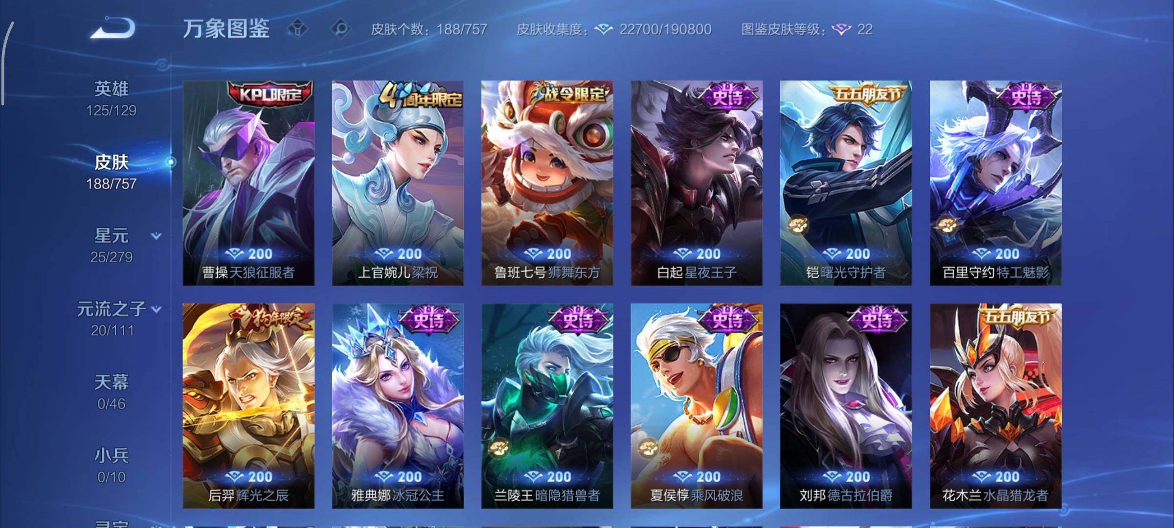 【星元皮肤】:宫本武藏幽冥之眼,孙悟空幽冥火【传说皮肤】:澜愿照九州拓,裴擒虎祥瑞亨通,诸葛亮时雨天司,李信一念神魔,干将莫邪久胜战神,宫本武藏地狱之眼,孙悟