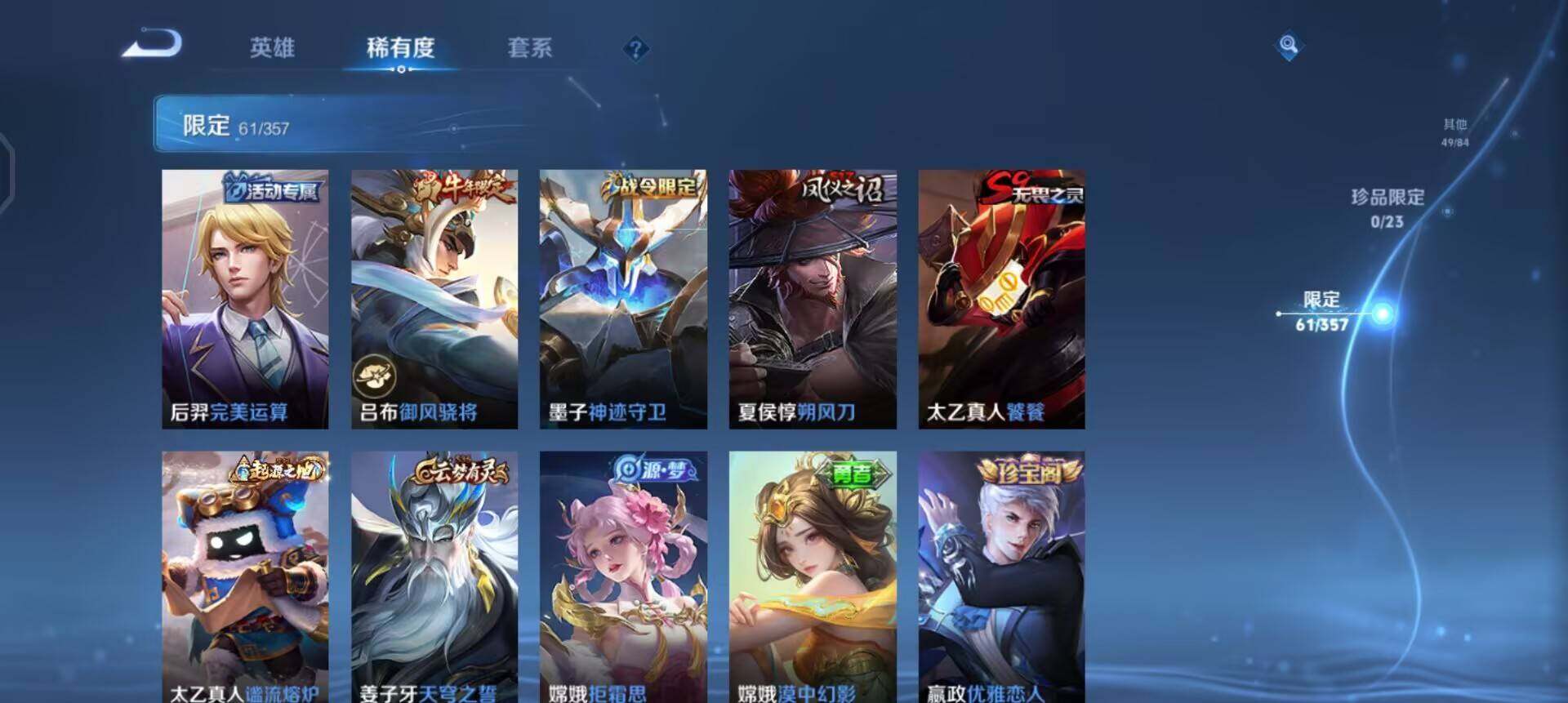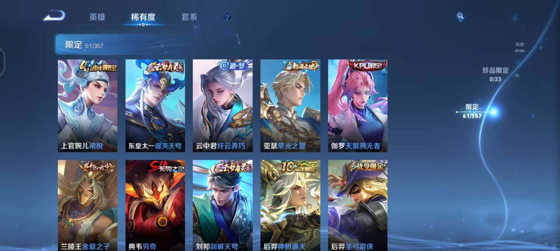 【传说皮肤】:后羿神树通天,桑启鸣野蒿,澜逐花归海,赵云淬星耀世,达摩黄金狮子座,孙悟空地狱火