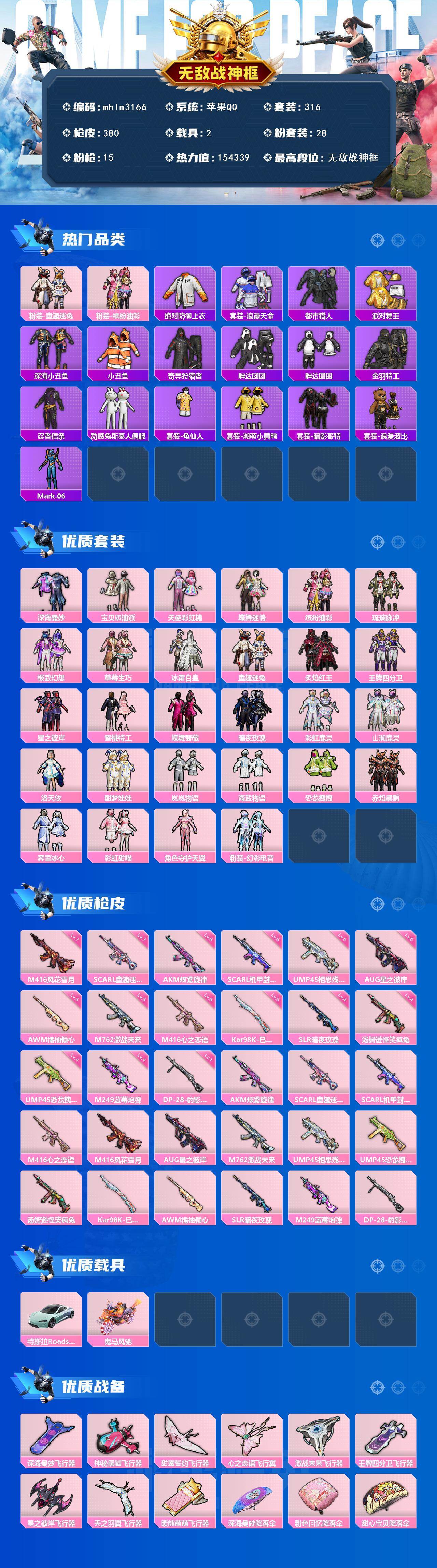 【mhlm3166】苹果 手Q-无敌战神框-28粉装-15特效枪-2载具-9粉色飞行器-154339热力值-23王牌印记-316套装-380枪皮