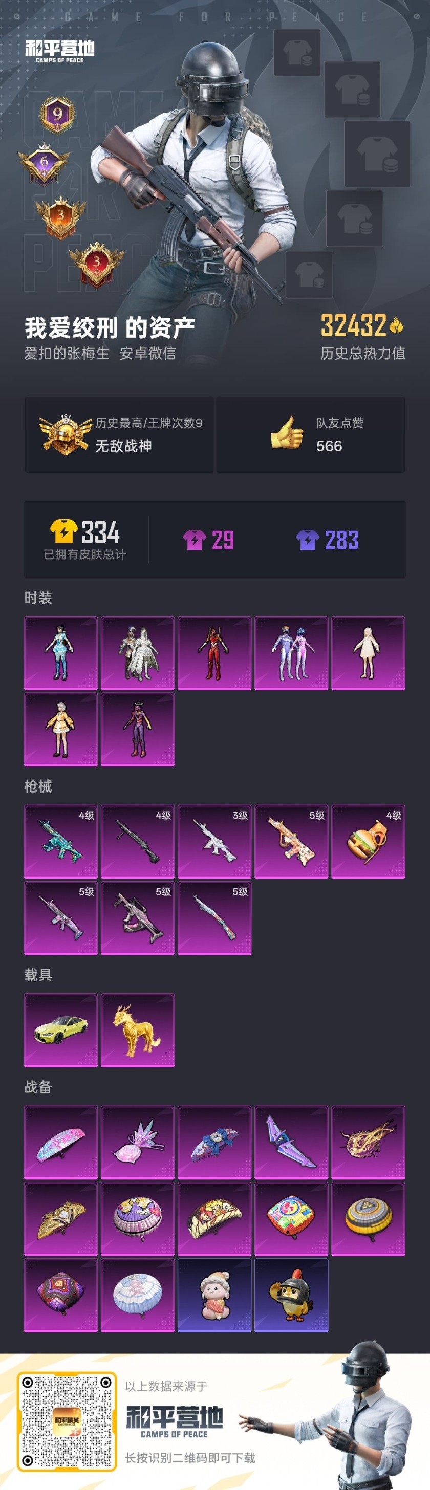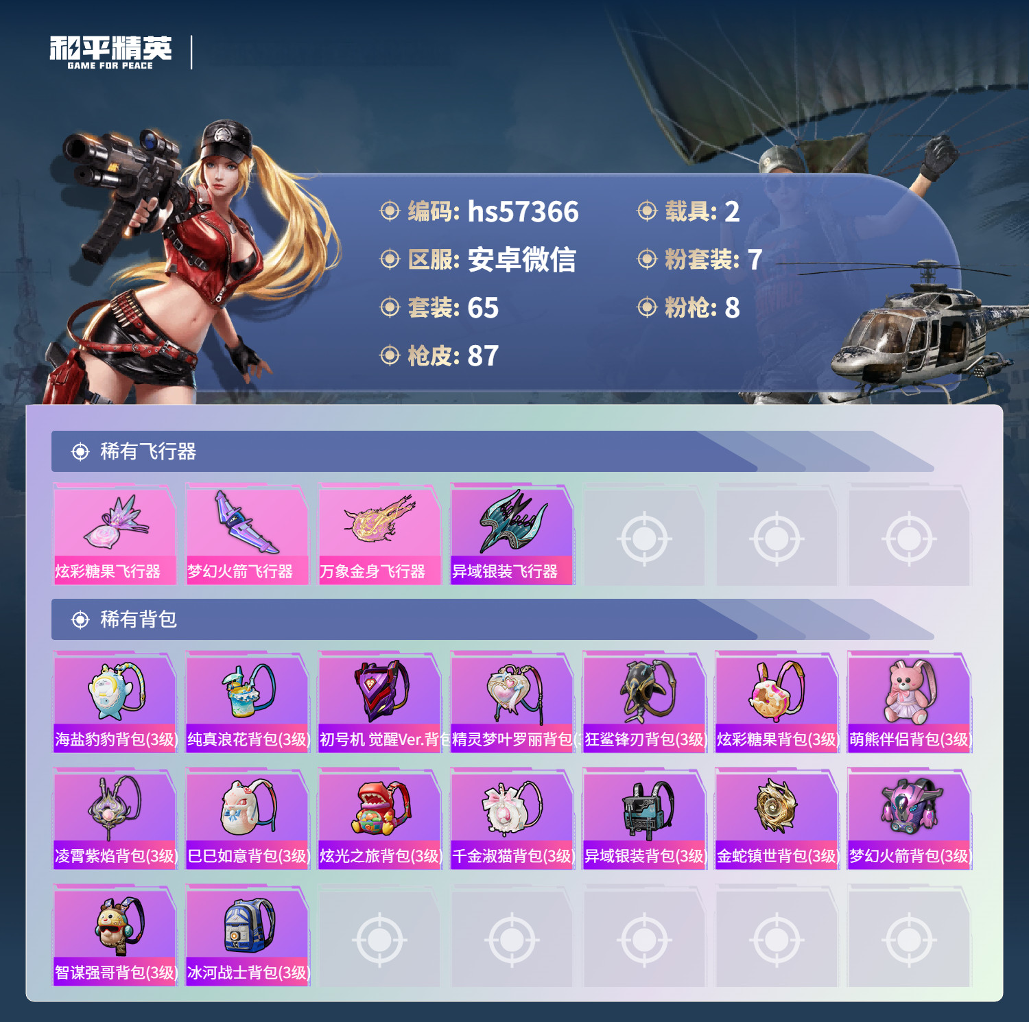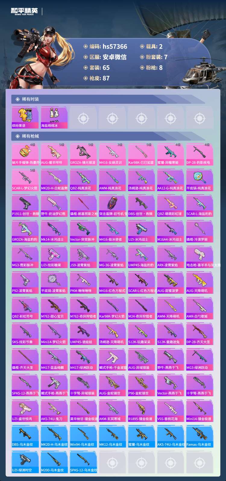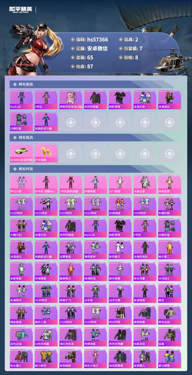 hs57366 安卓微-9王牌印记-有战神框-7粉装-8特效枪-2载具-32432热力值-65套装