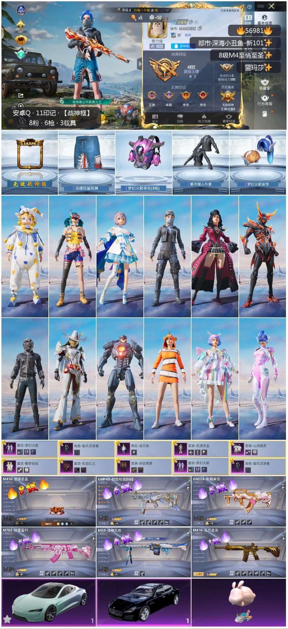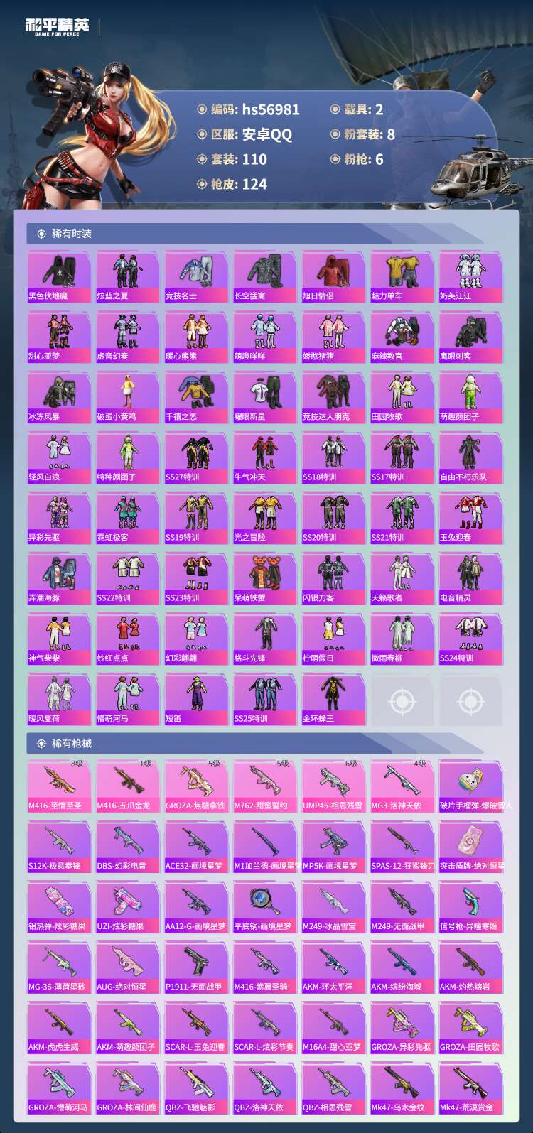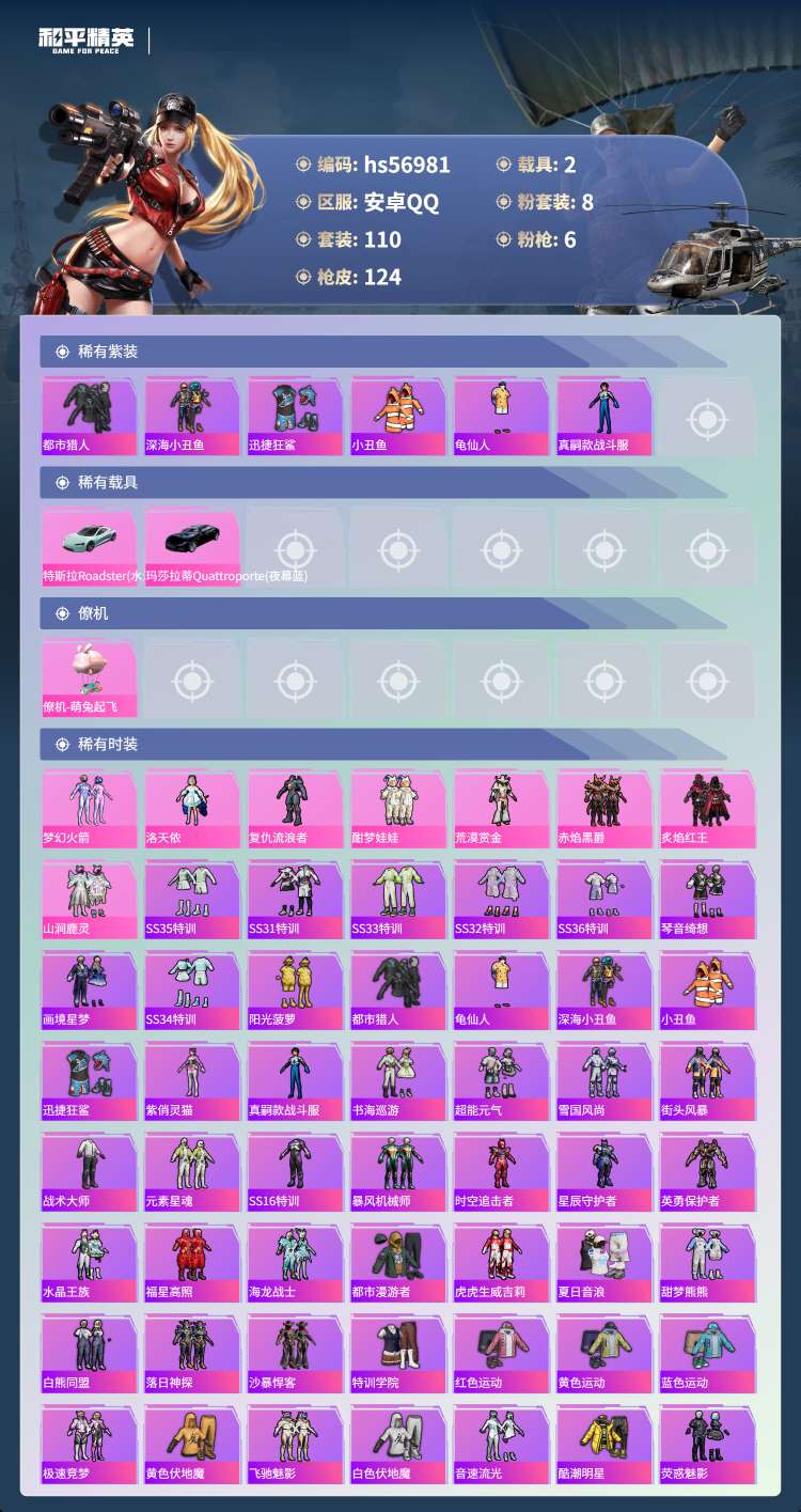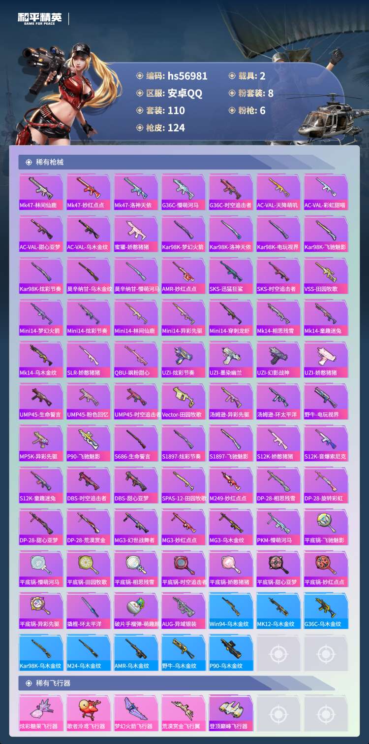 hs56981 安卓手Q-11王牌印记-有战神框-8粉装-6特效枪-2载具-52452热力值-110