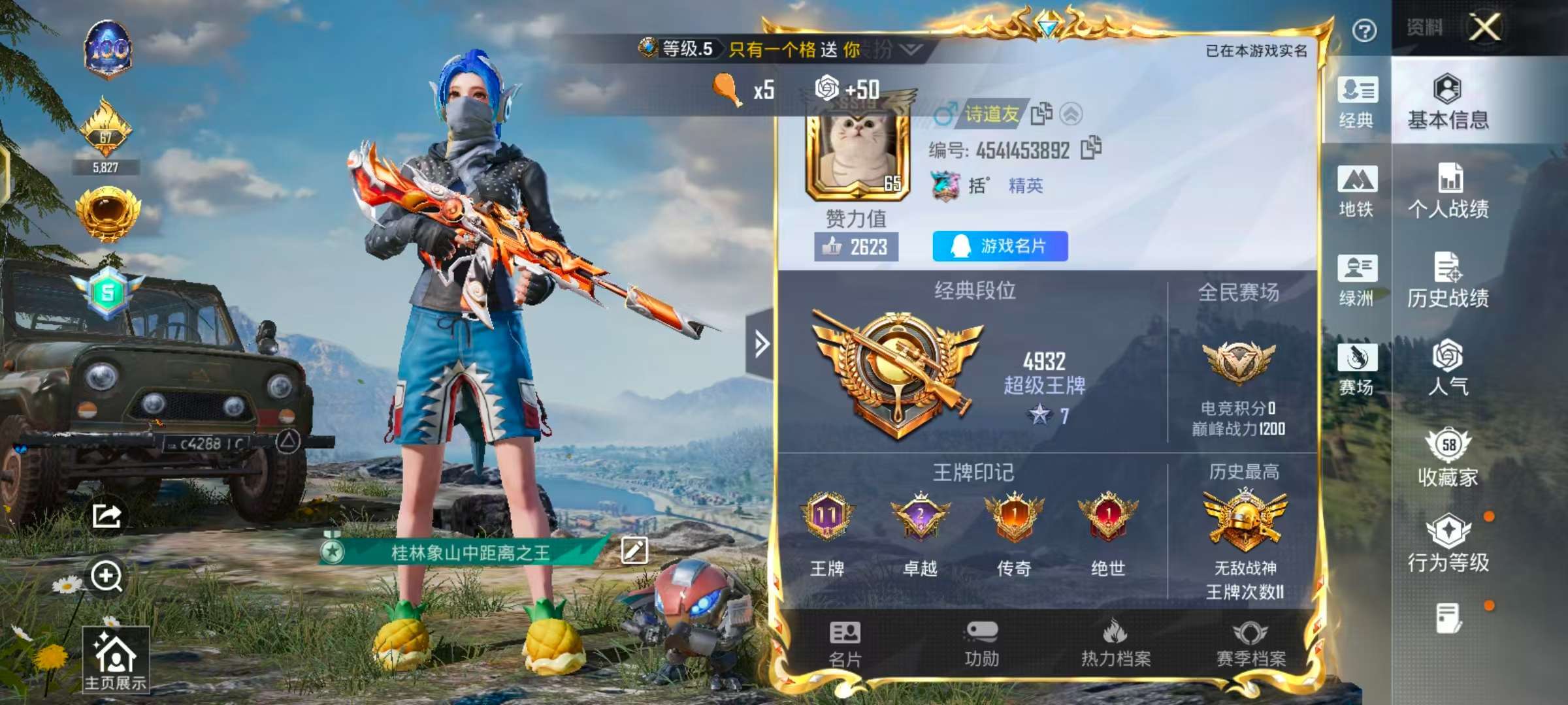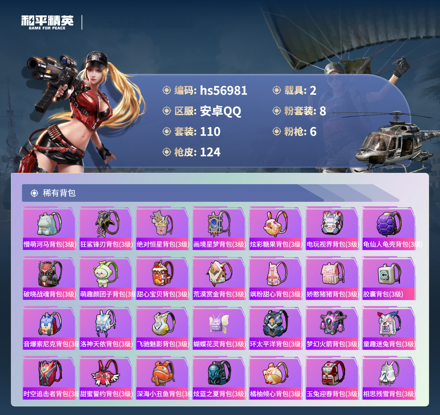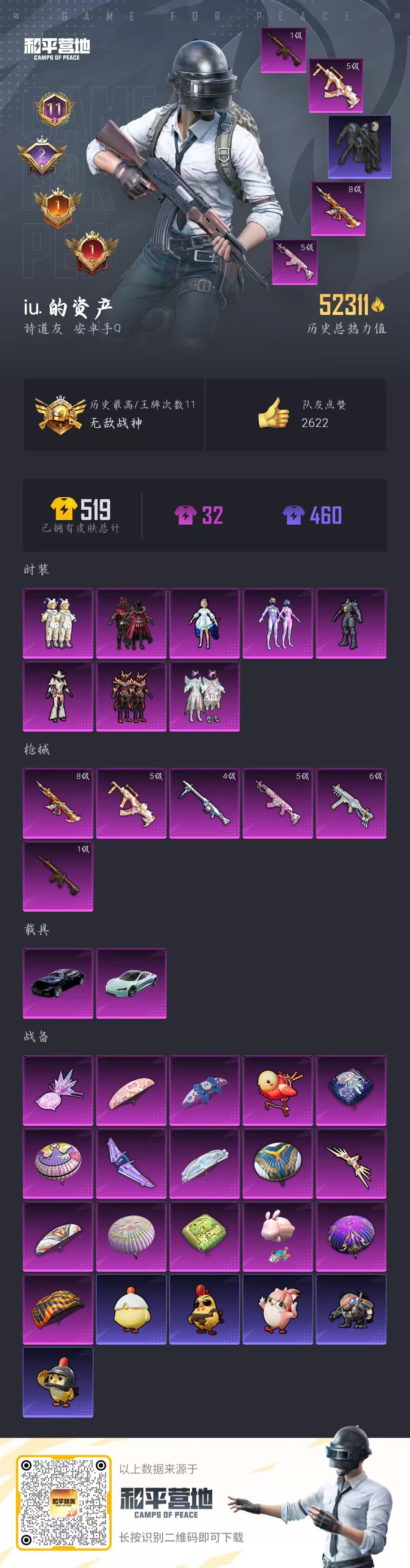 hs56981 安卓手Q-11王牌印记-有战神框-8粉装-6特效枪-2载具-52452热力值-110