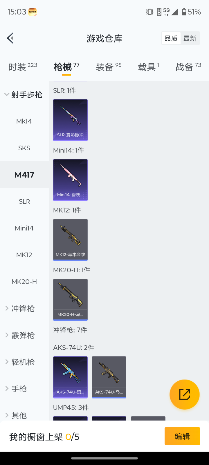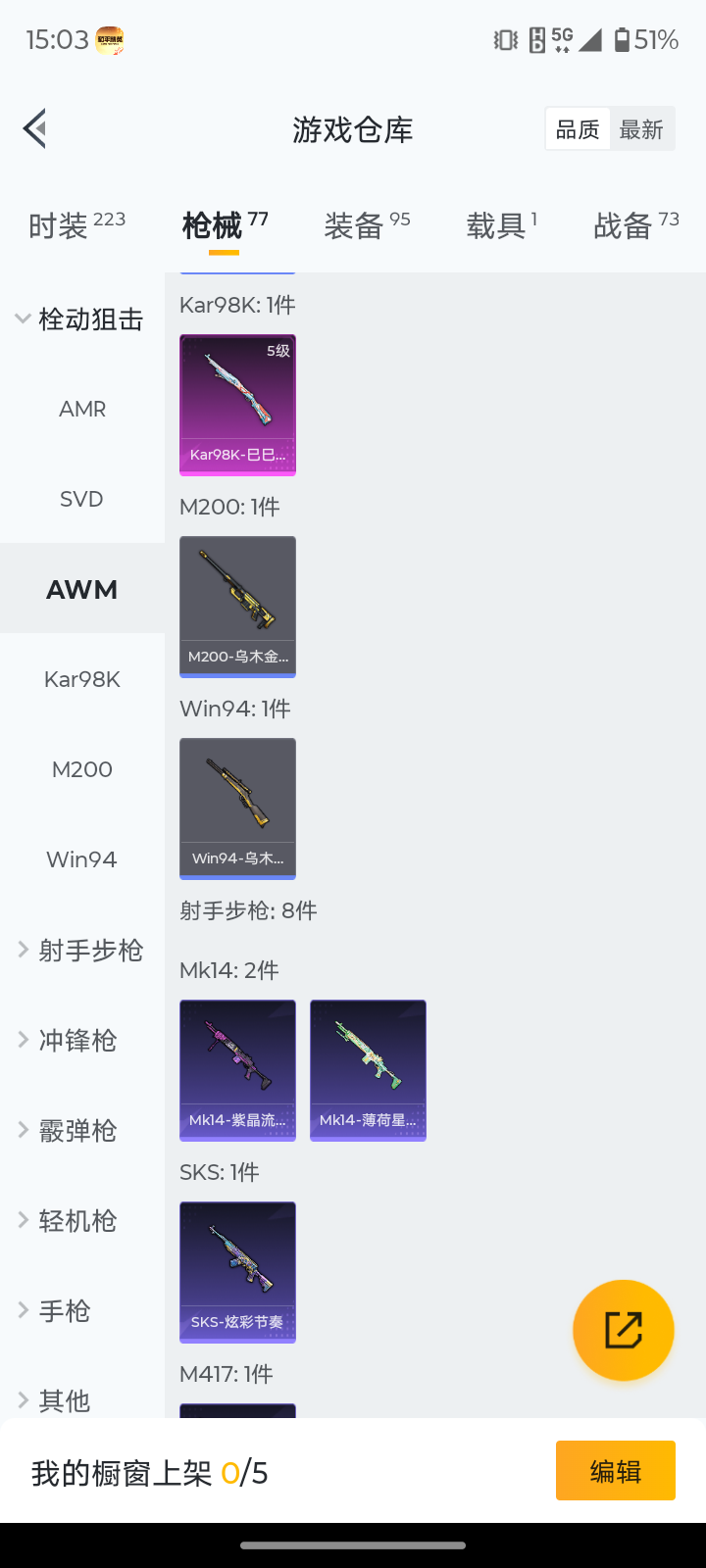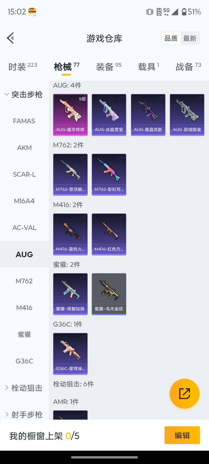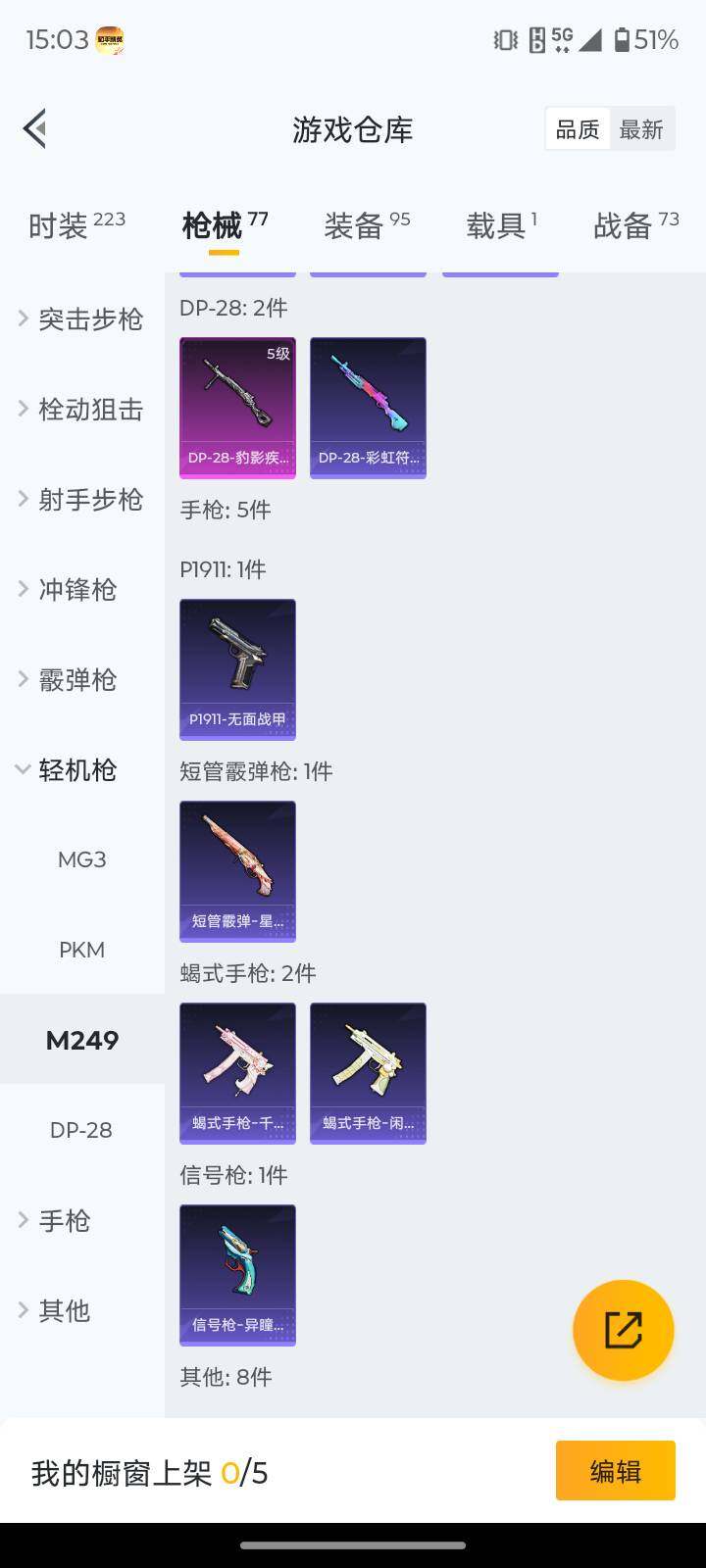 【粉色枪皮等级】:AUG-暖羊咩咩(五级),Kar98K-巳巳如意(五级),DP-28-豹影疾电(五级)