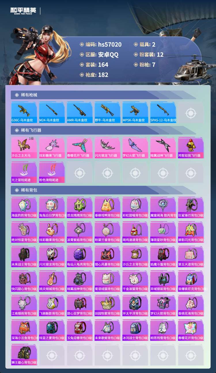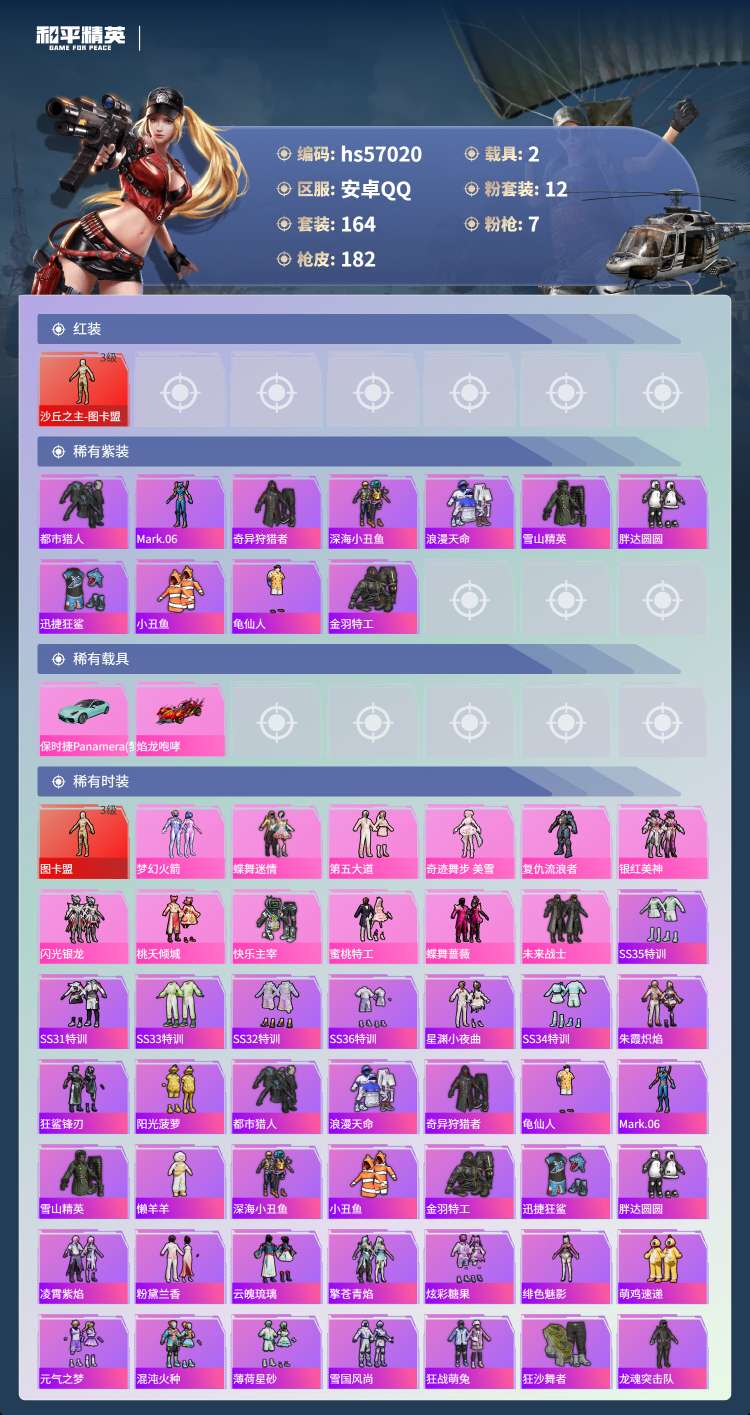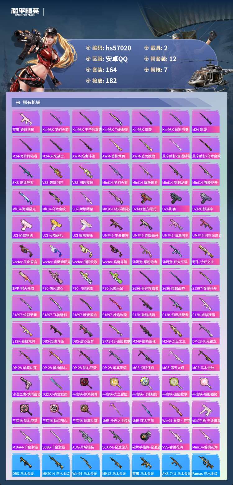 hs57020 安卓手Q-11王牌印记-1红装-12粉装-7特效枪-2载具-69655热力值-164