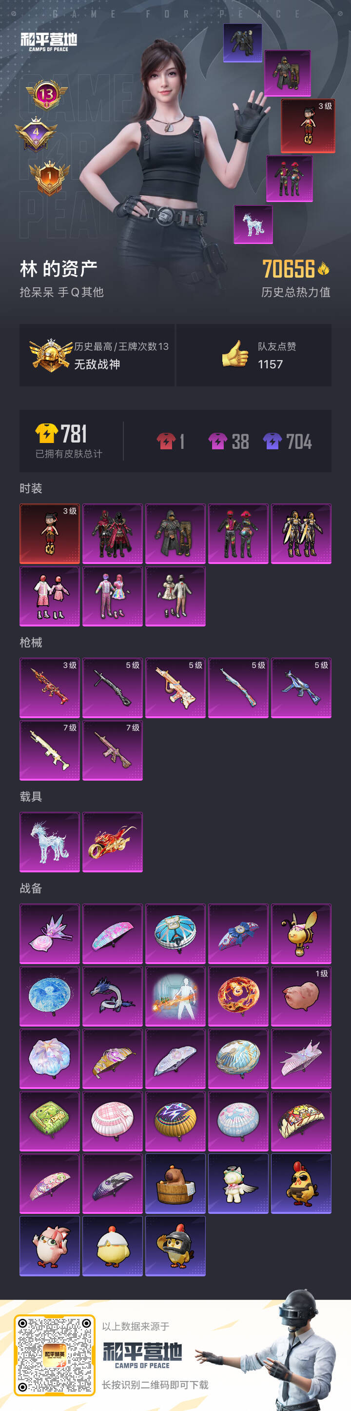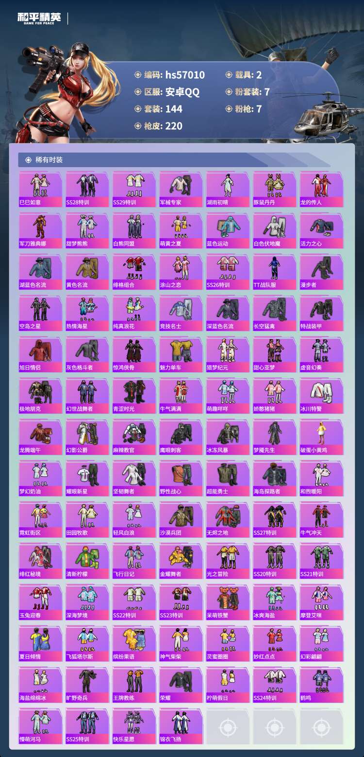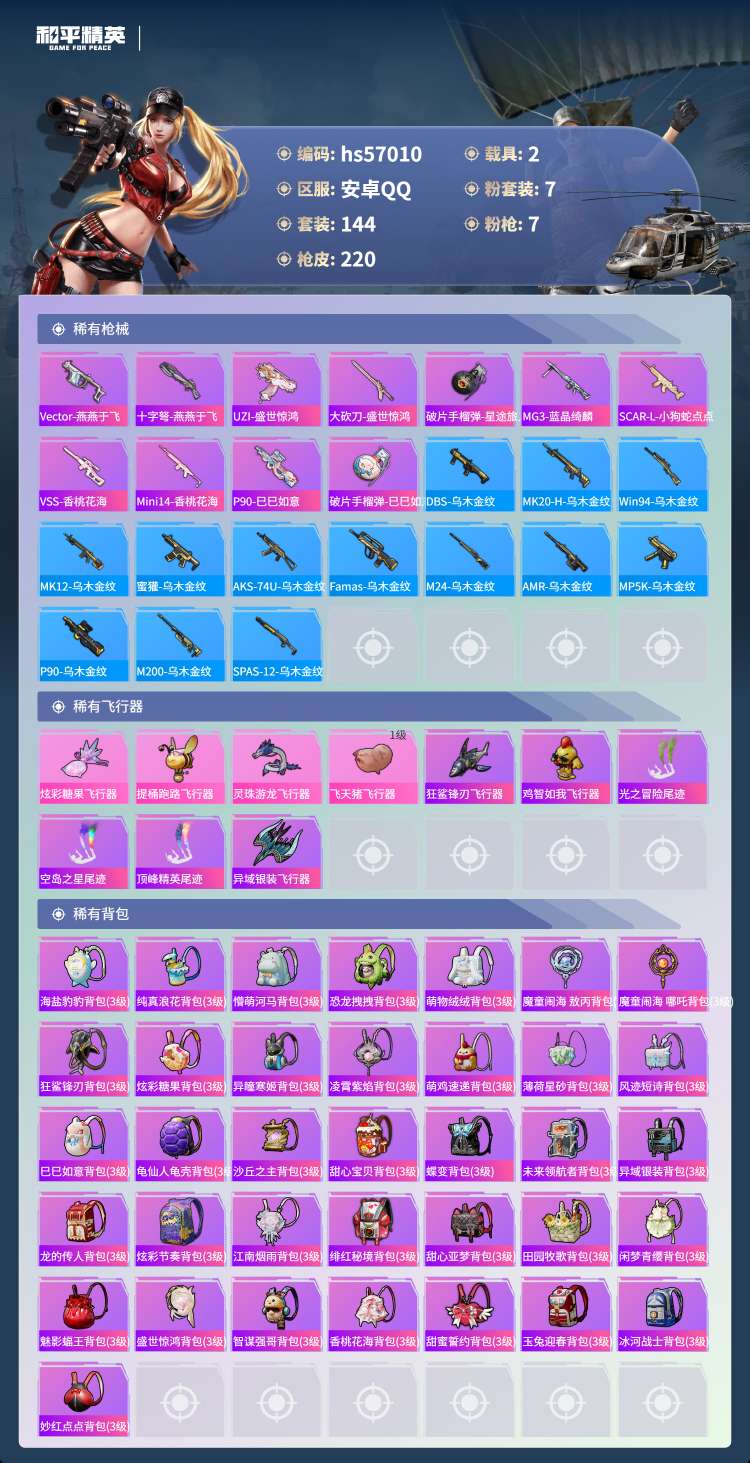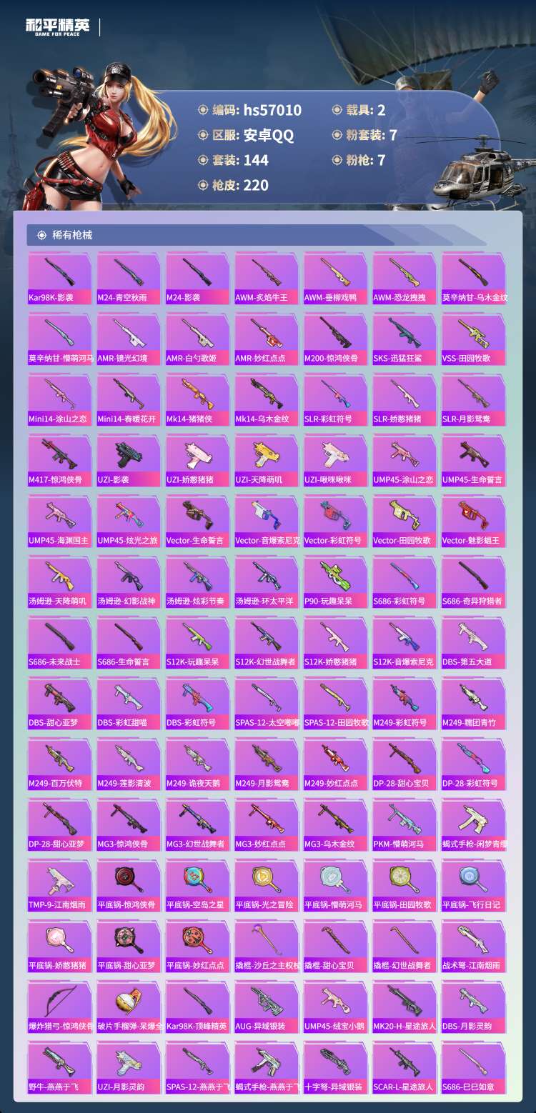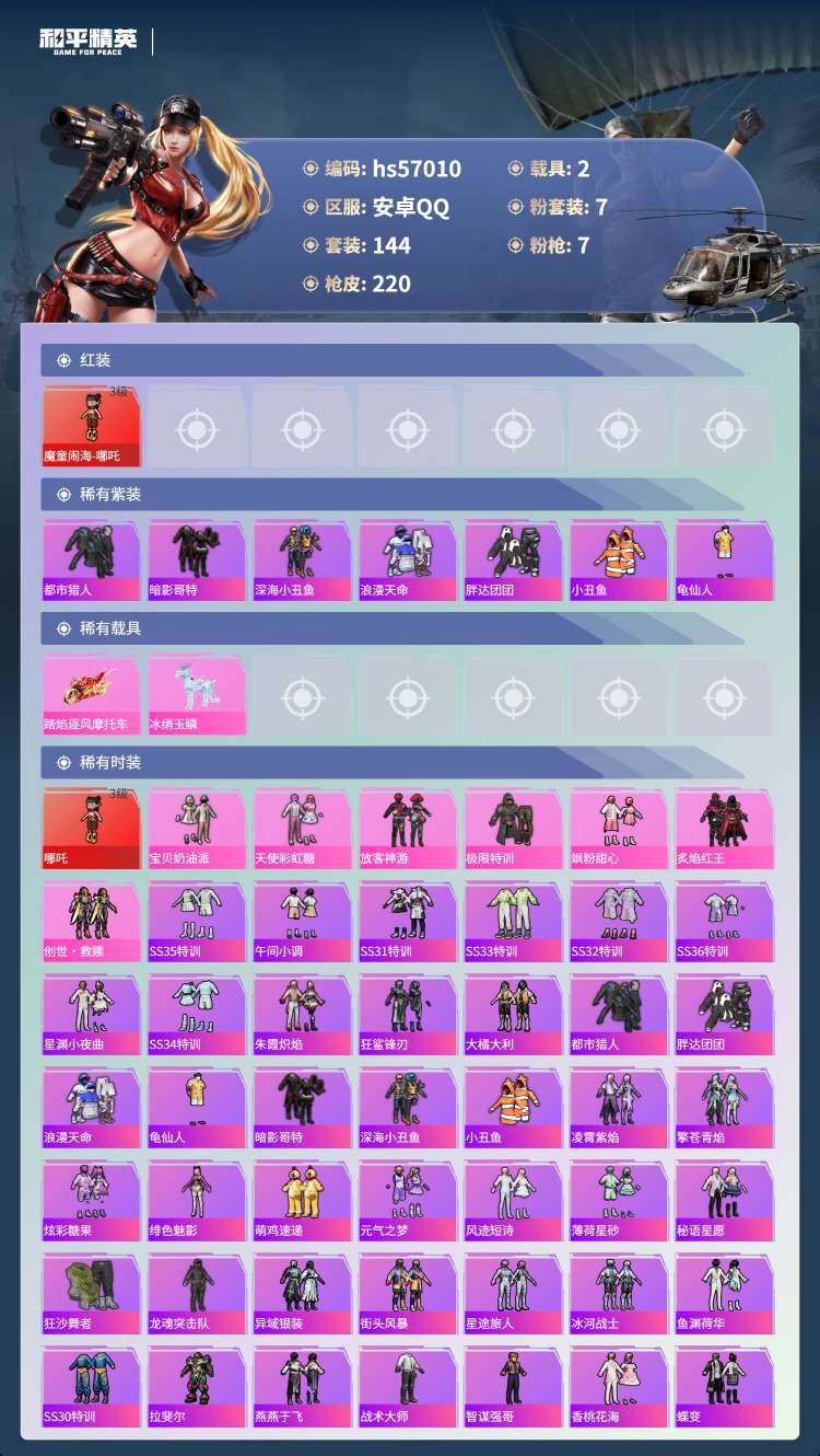 hs57010 安卓手Q-13王牌印记-有战神框-1红装-7粉装-7特效枪-2载具-70656热力值