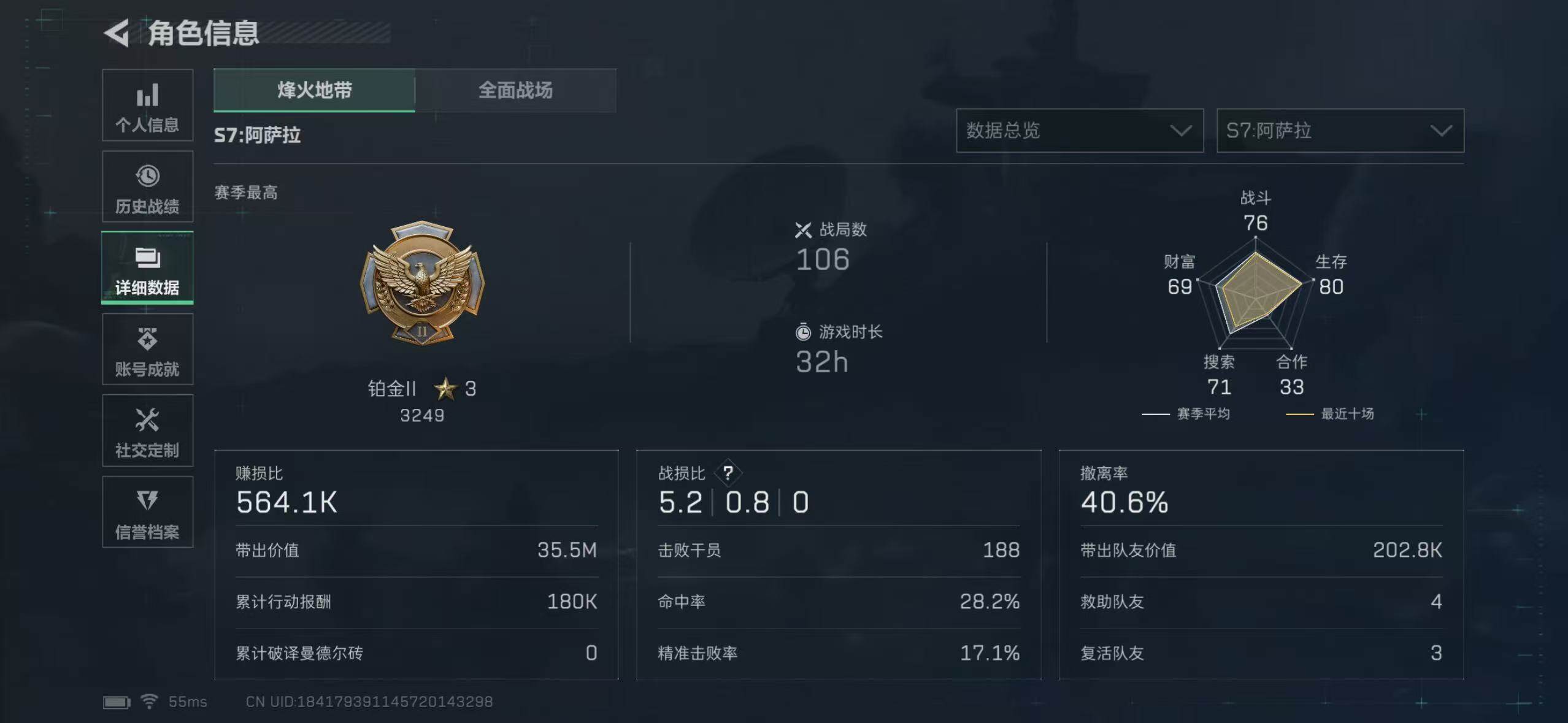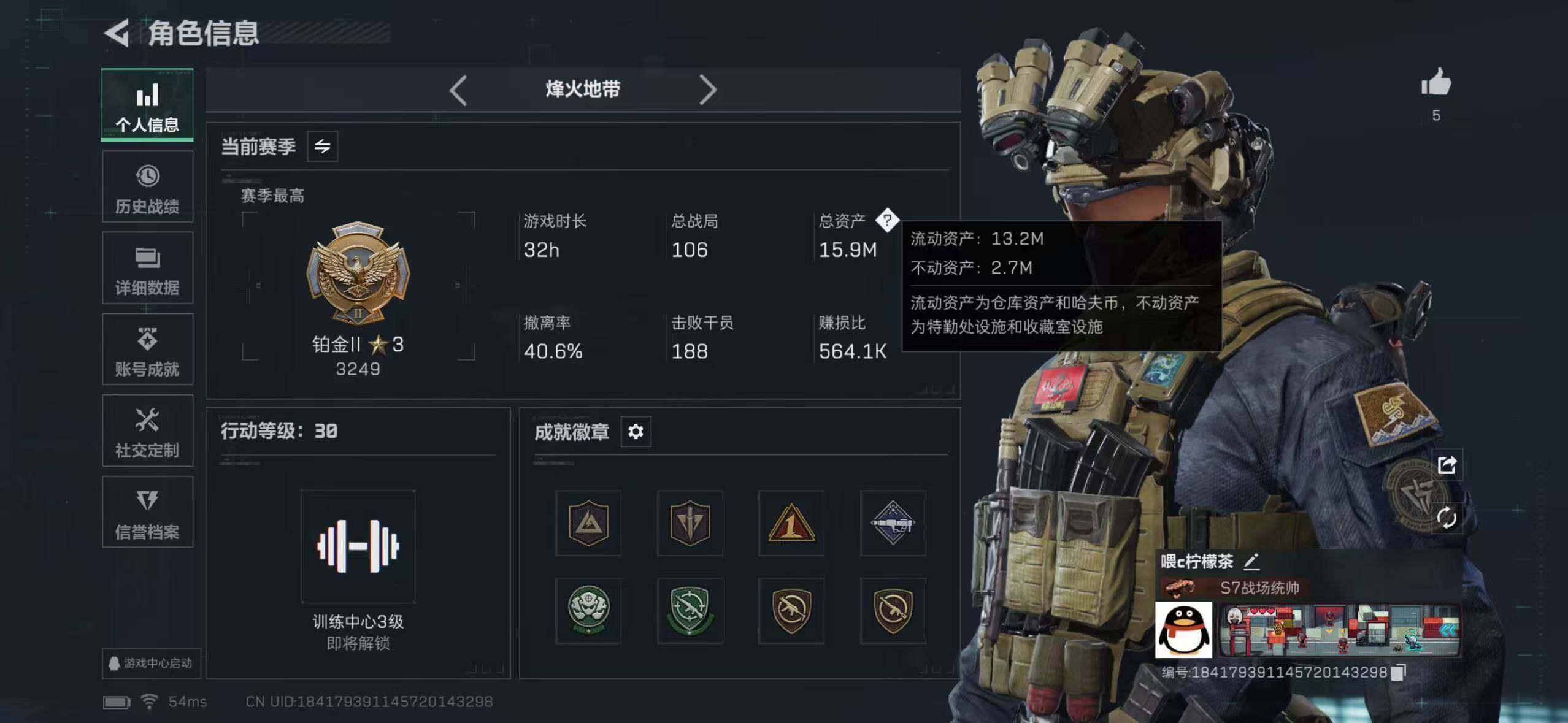 15m总资产-83k哈伏币-30烽火等级-铂金-50战场等级