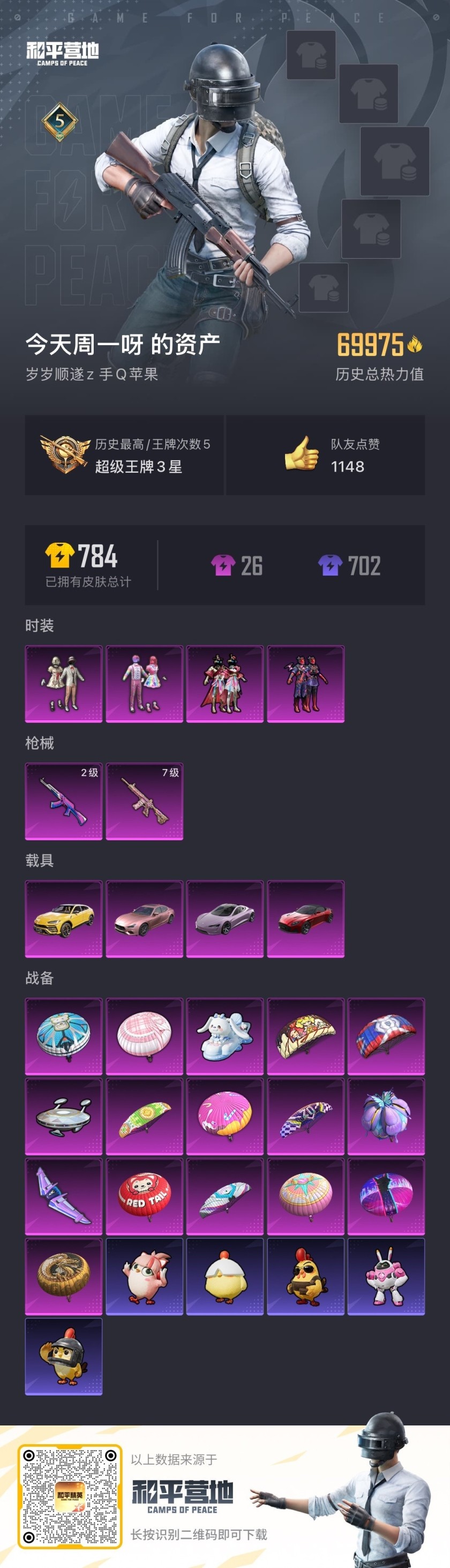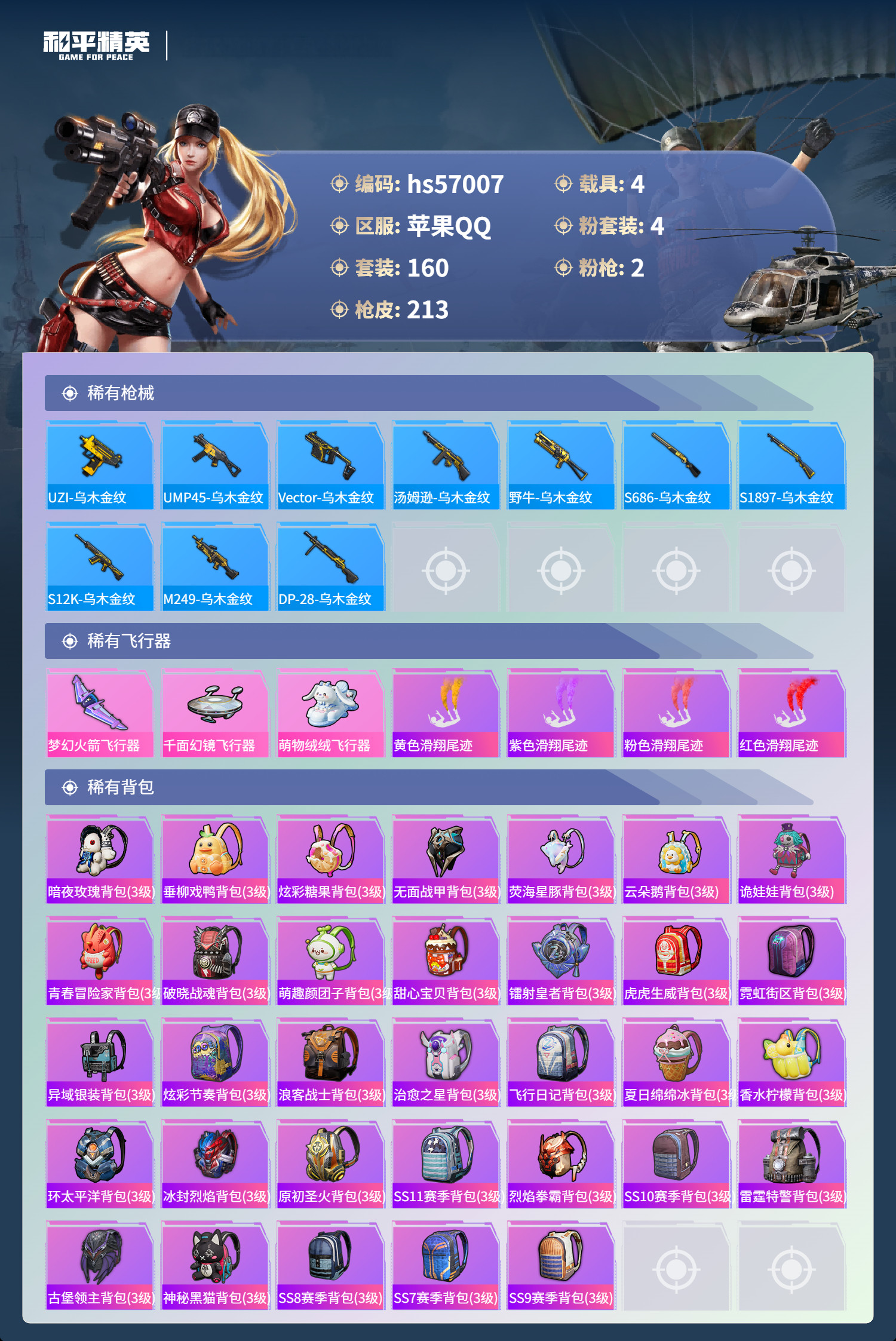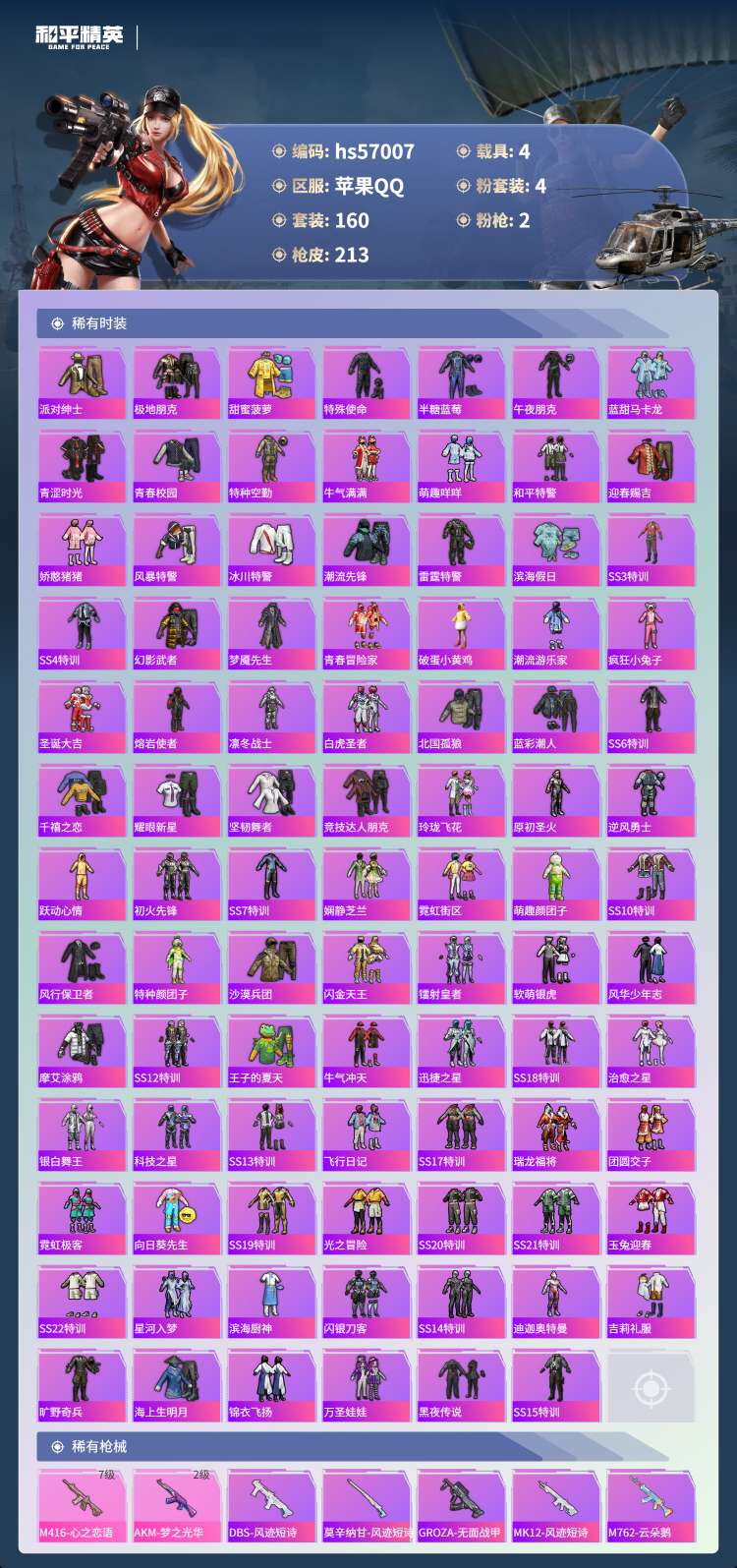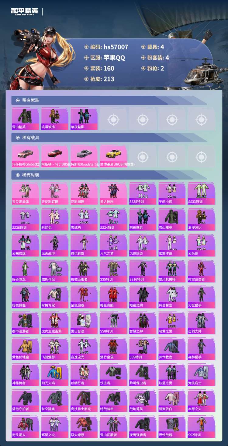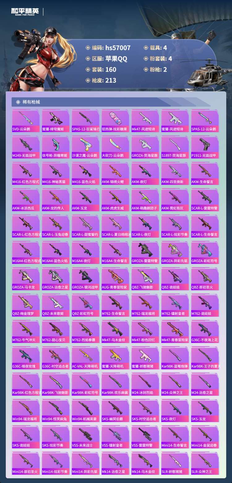hs57007 苹果手Q-5王牌印记-4粉装-2特效枪-4载具-69975热力值-160套装-213
