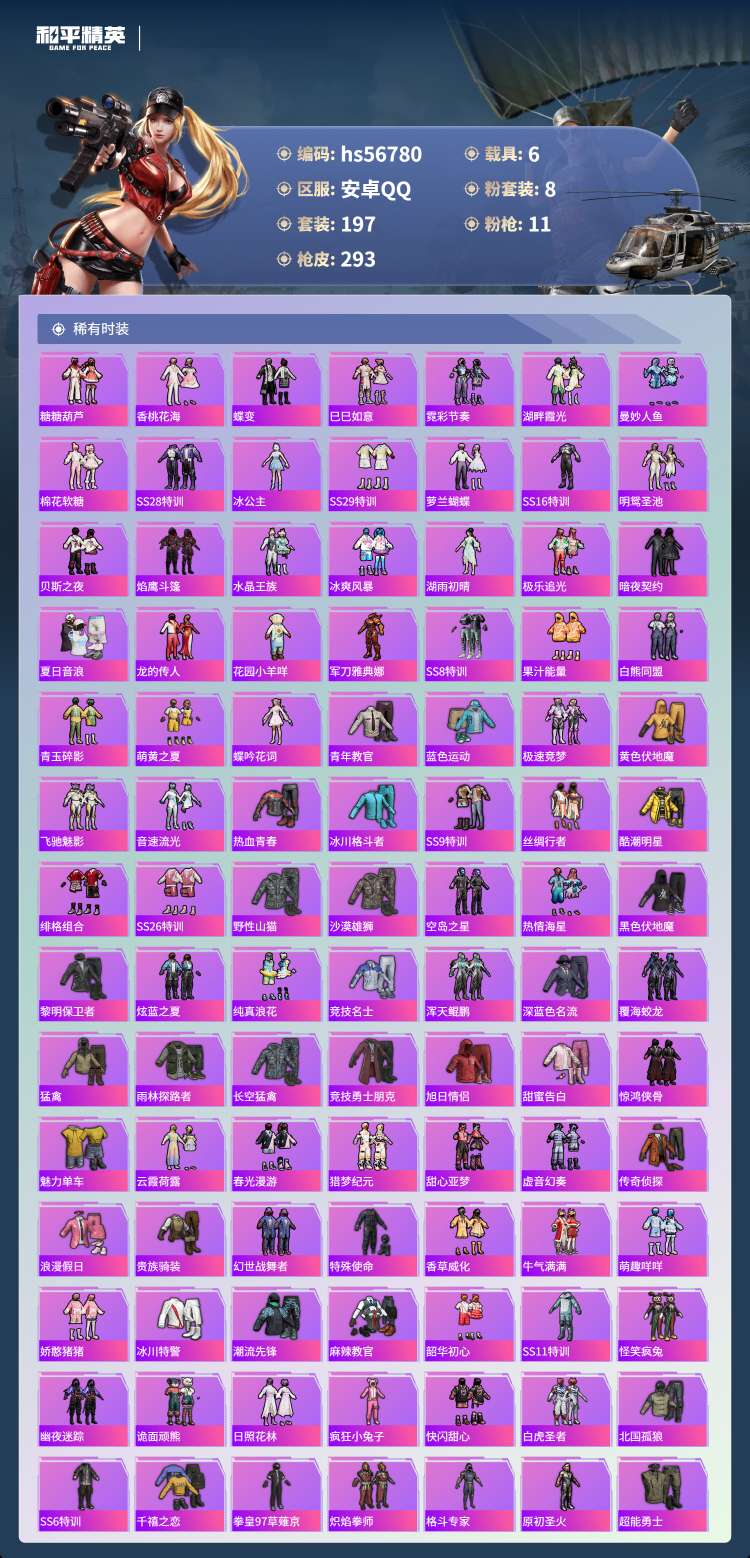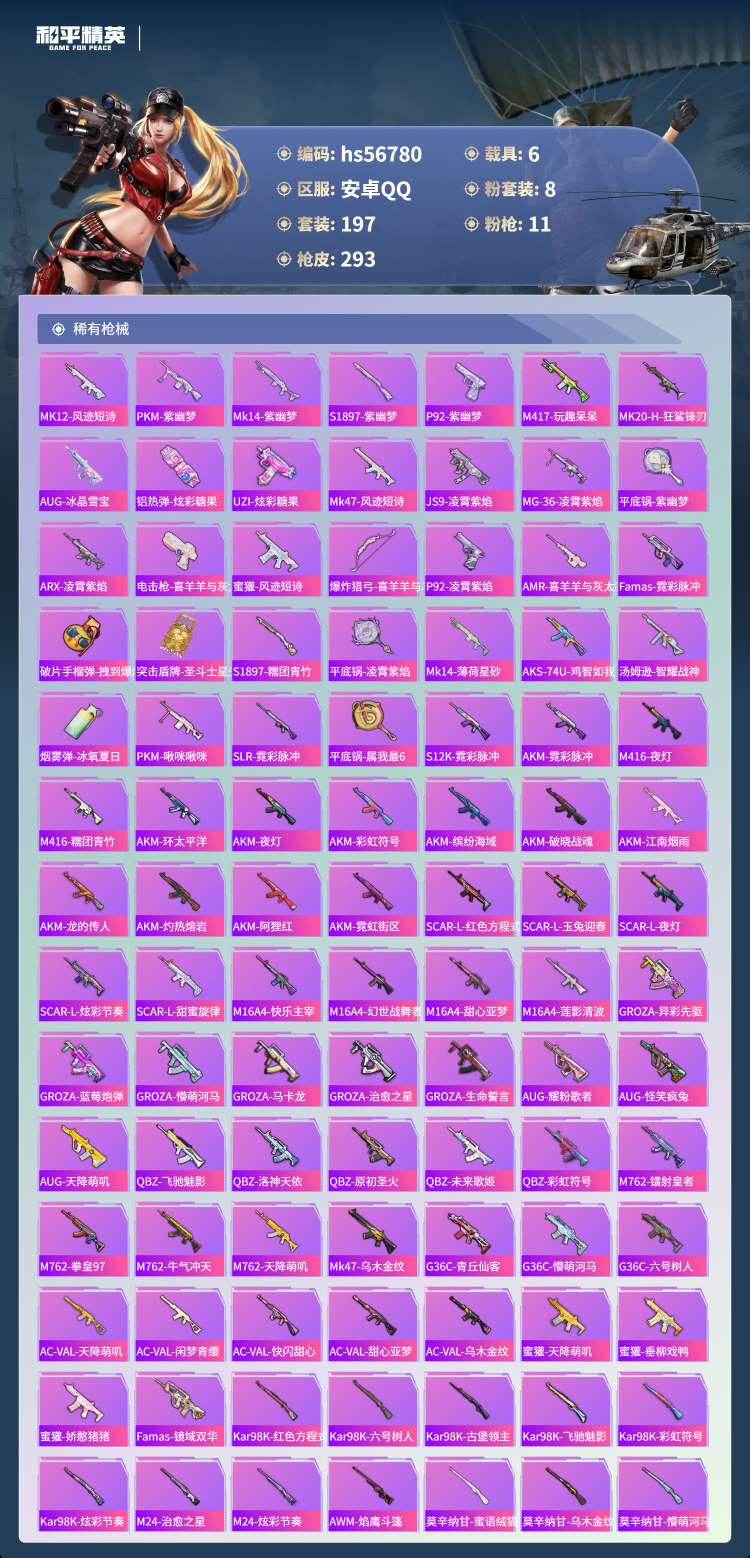 hs56780 安卓手Q-18王牌印记-1红装-8粉装-11特效枪-6载具-109401热力值-19