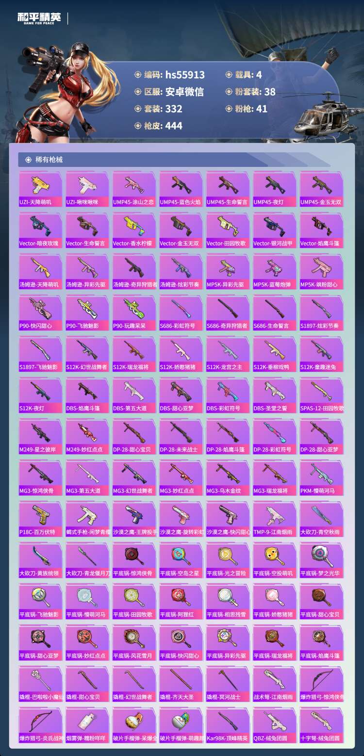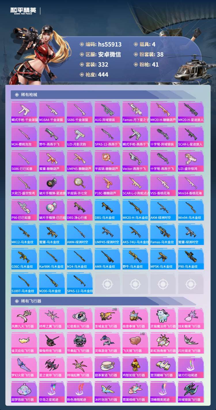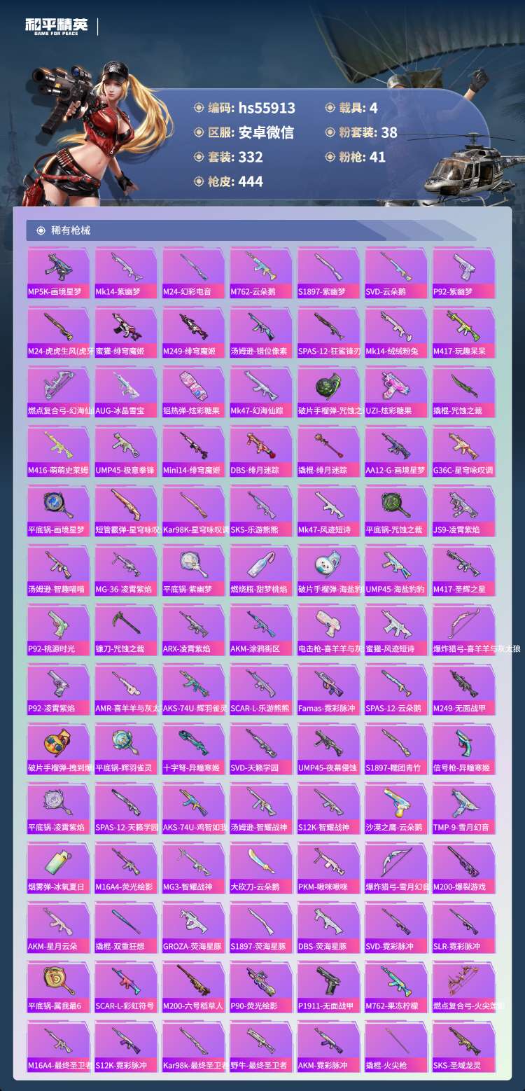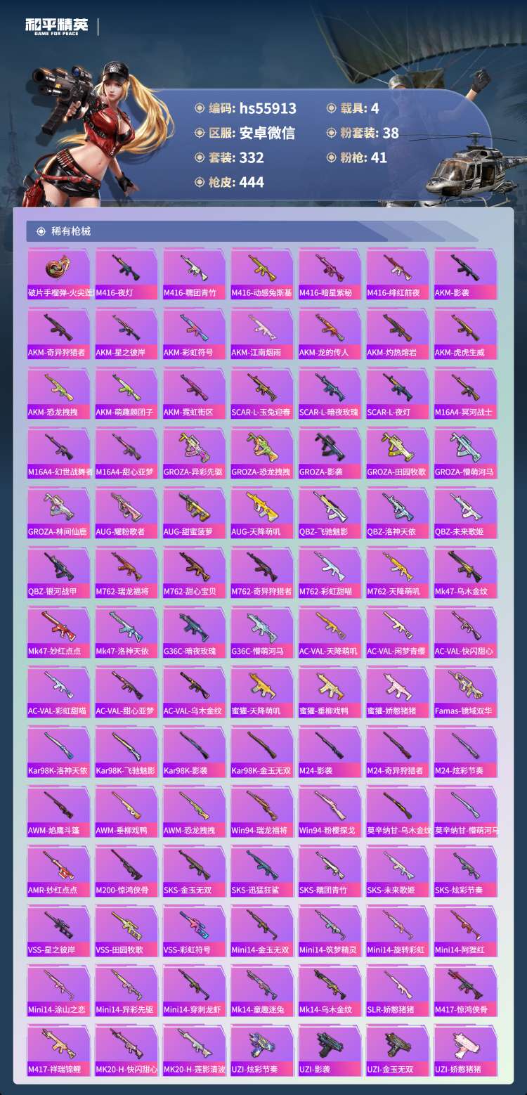 hs55913 安卓微-19王牌印记-38粉装-41特效枪-4载具-177406热力值-332套装