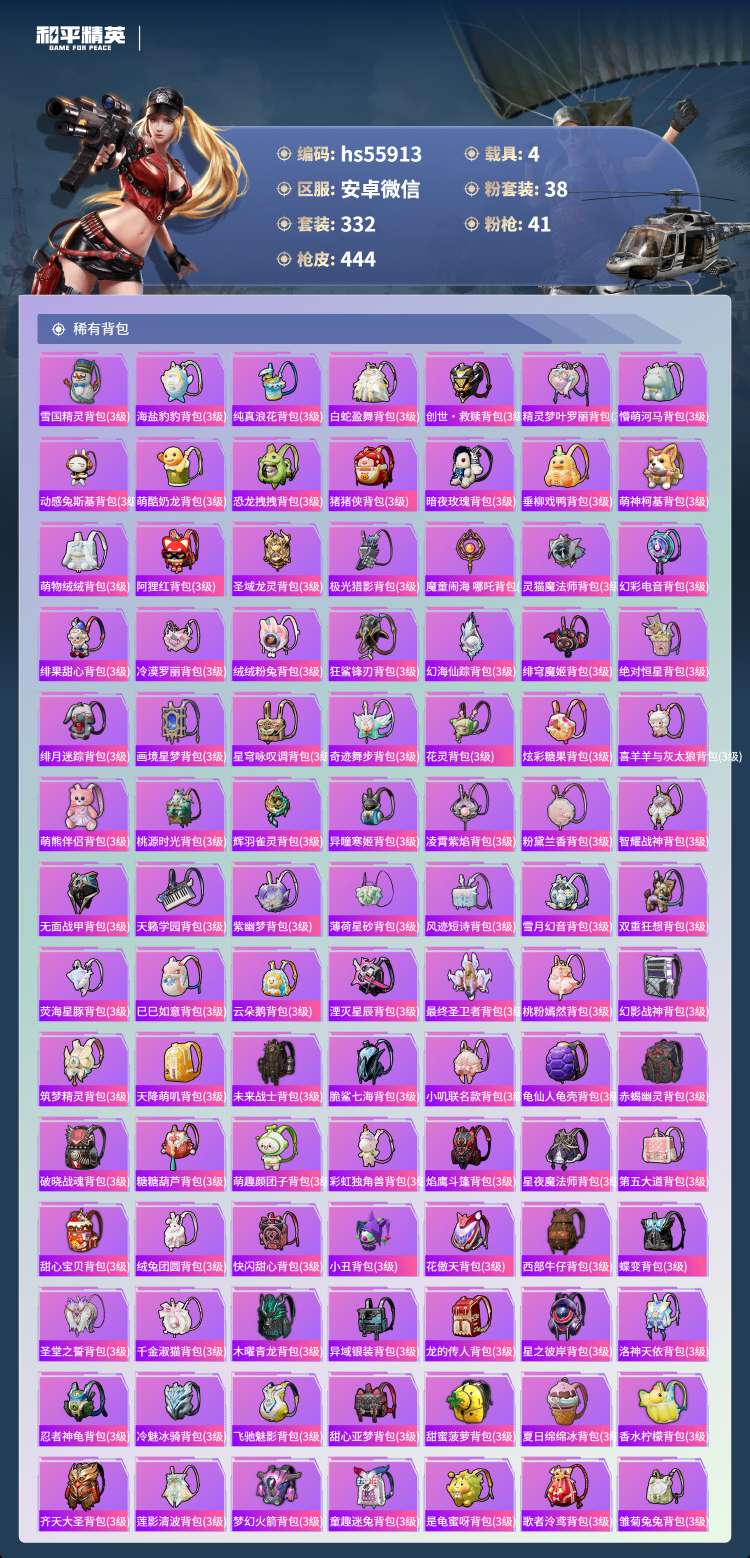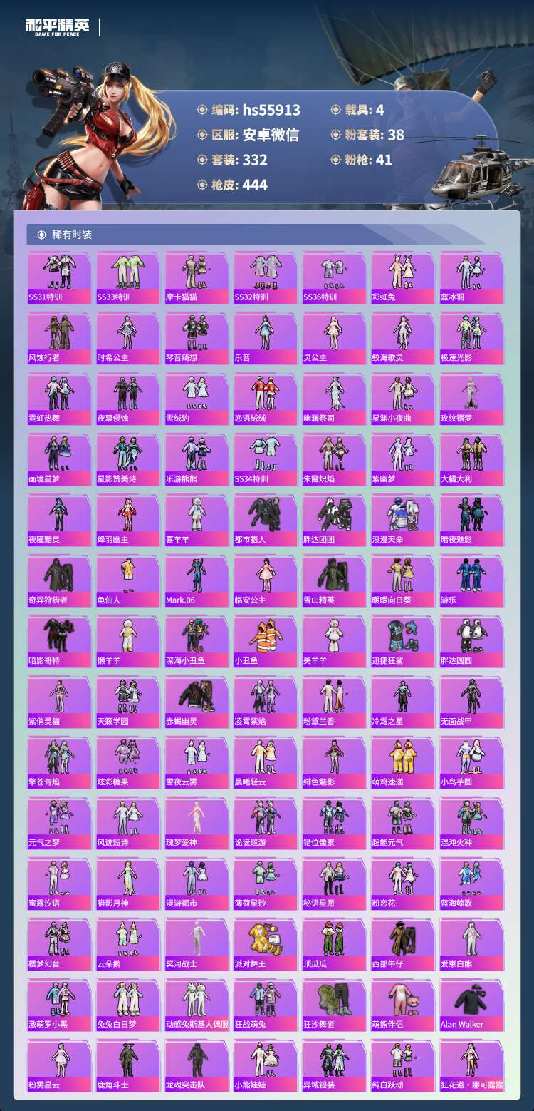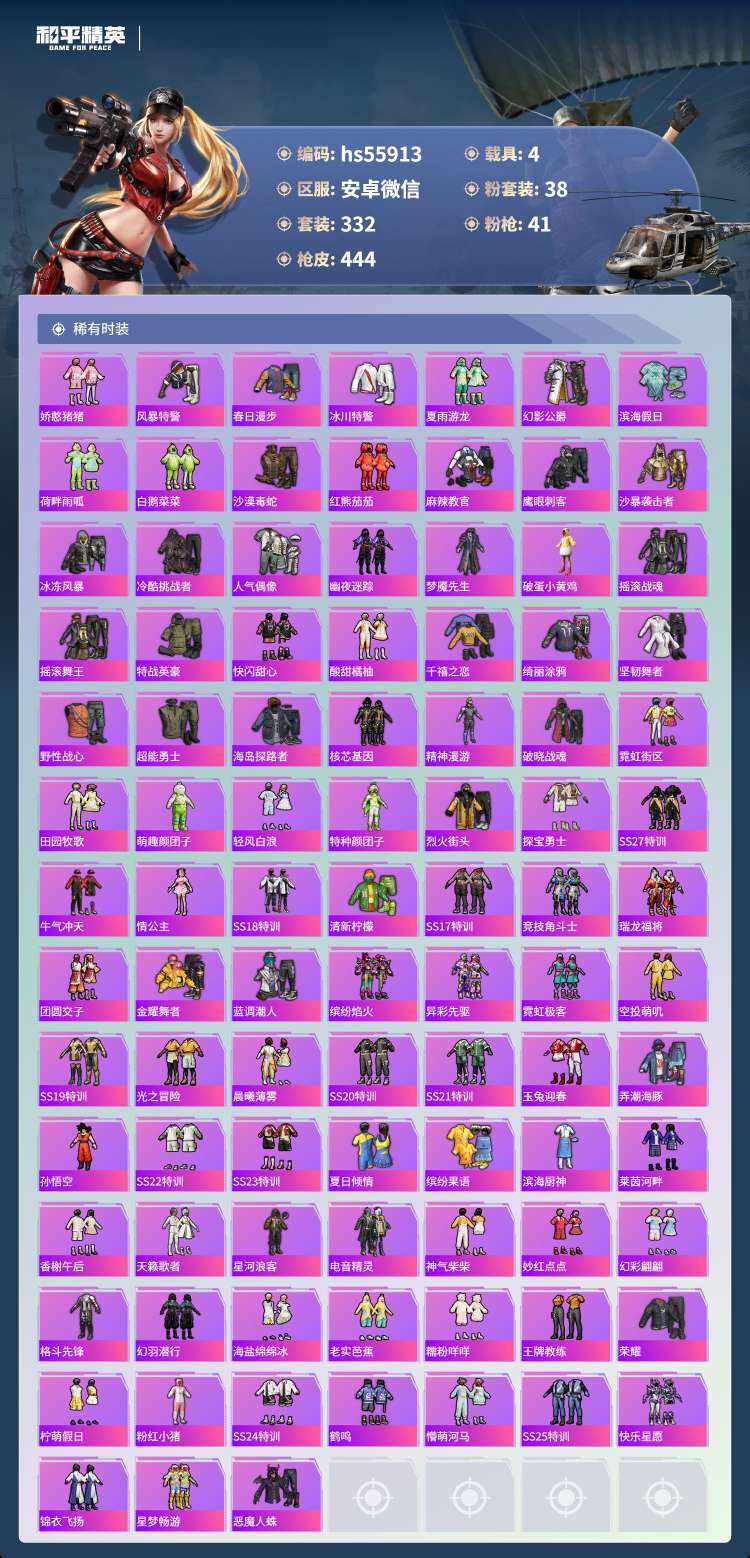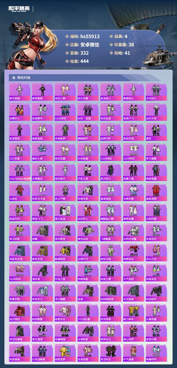 hs55913 安卓微-19王牌印记-38粉装-41特效枪-4载具-177406热力值-332套装