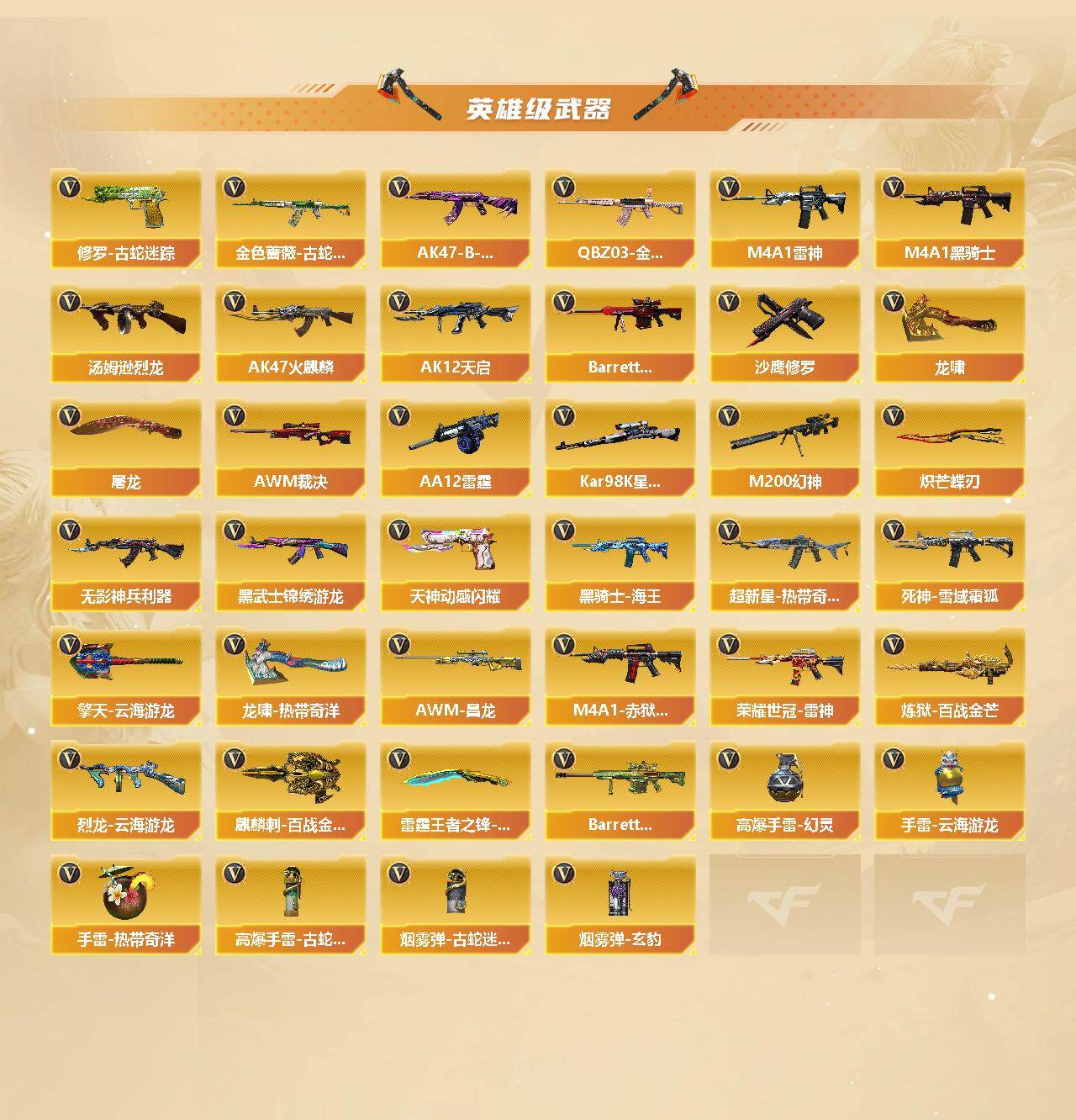 【热门武器】:传说幽冥,QBZ03-金色蔷薇,M200-幻神,金色蔷薇-古蛇迷踪,修罗-古蛇迷踪,死亡之眼,荣耀世冠-雷神,Kar98K-星神,M4A1-黑骑士,汤姆逊-烈龙*2,羊驼玩偶*2,沙鹰-修罗*5,炽芒蝶刃,炽芒蝶刃-荣耀世冠白鲨2023 皮肤