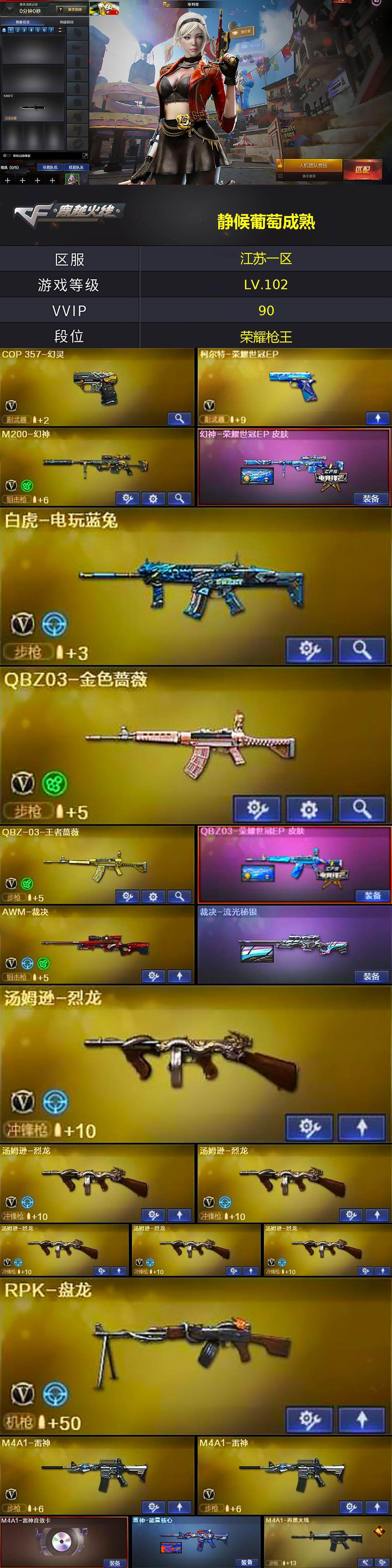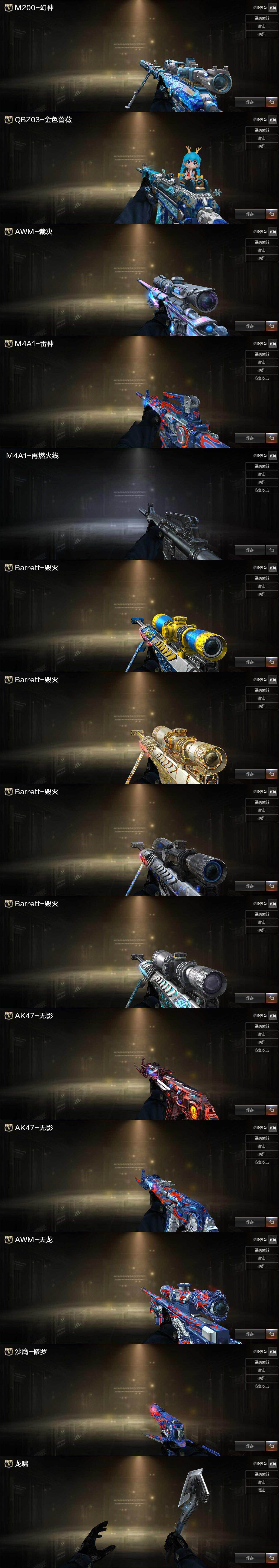 【热门武器】:QBZ03-金色蔷薇,M4A1-青龙,M200-幻神,死亡之眼,白虎-电玩蓝兔,牛牛-AK47,M4A1-黑骑士*3,汤姆逊-烈龙*6,RPK-盘龙,加特林-炼狱,COP 357-幻灵,沙鹰-修罗*2