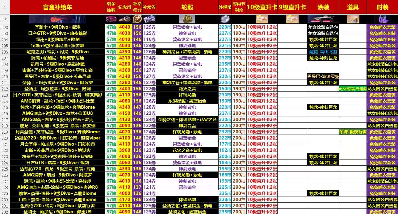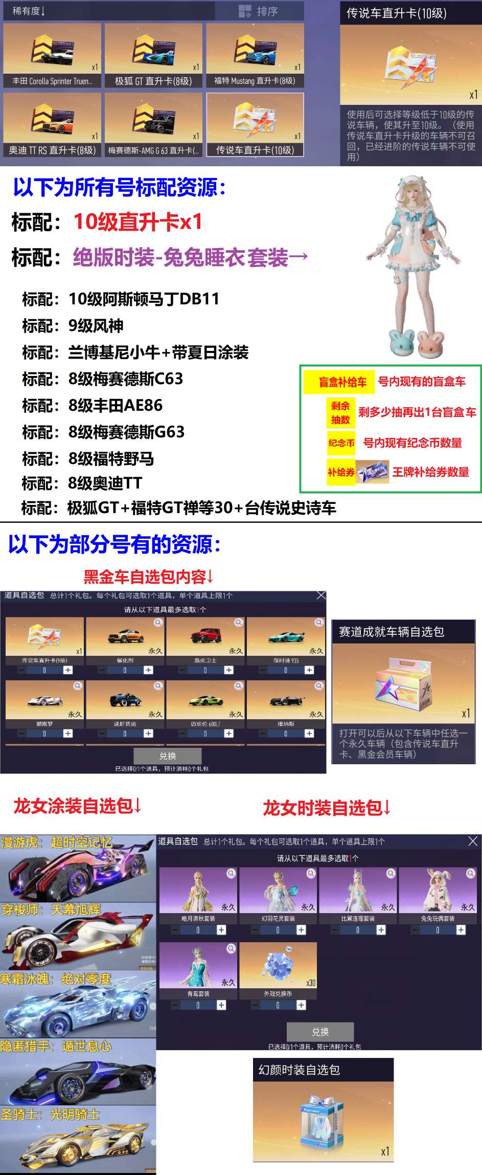 一行一个号,拍前先咨询我,绿色是王牌补给剩余多少抽出车,紫字是补给券数量,黄红字是纪念币数量