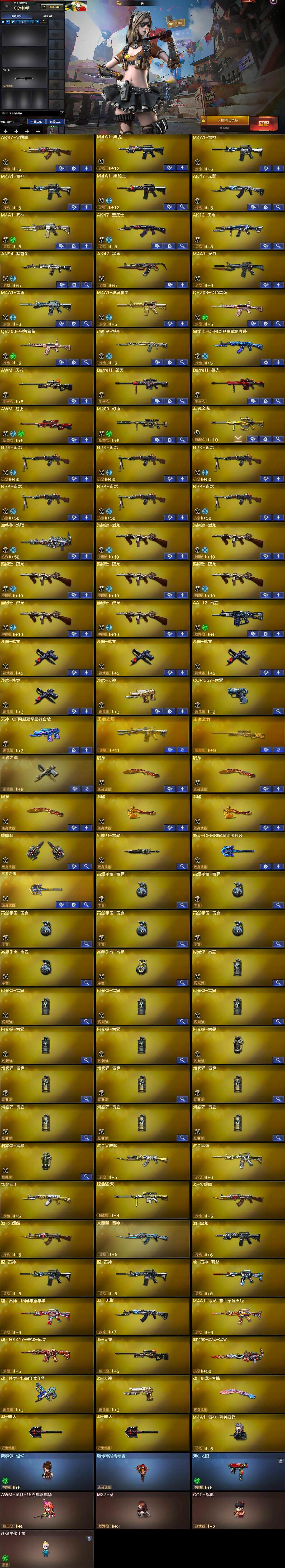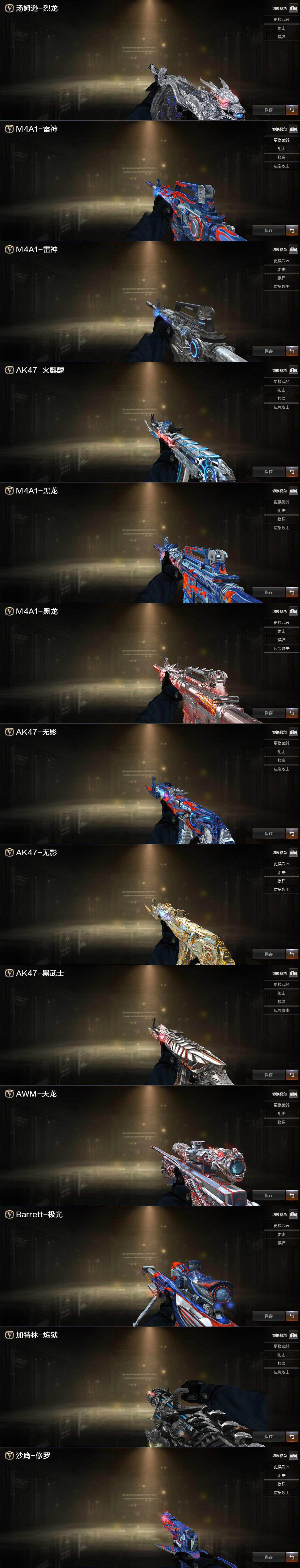 【热门武器】:QBZ03-金色蔷薇*2,M200-幻神,死亡之眼,金色小号,M4A1-黑骑士,汤姆逊-烈龙*7,RPK-盘龙*6,加特林-炼狱,斯泰尔-蝴蝶,沙鹰-修罗*4
