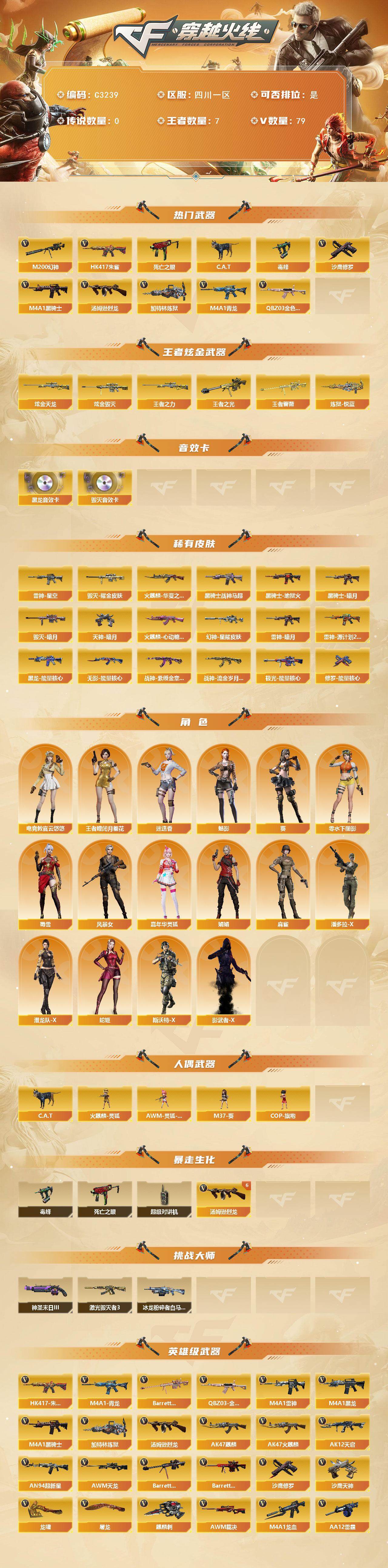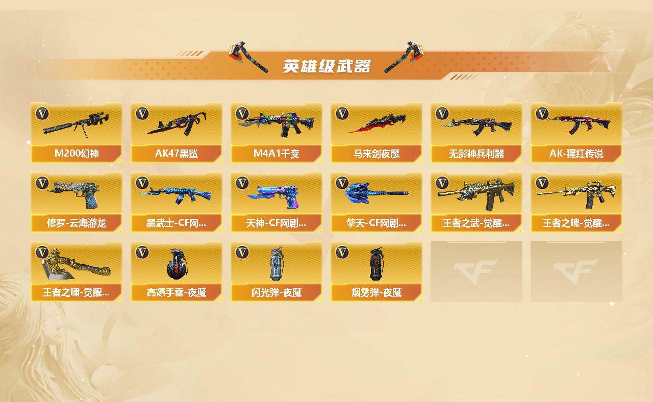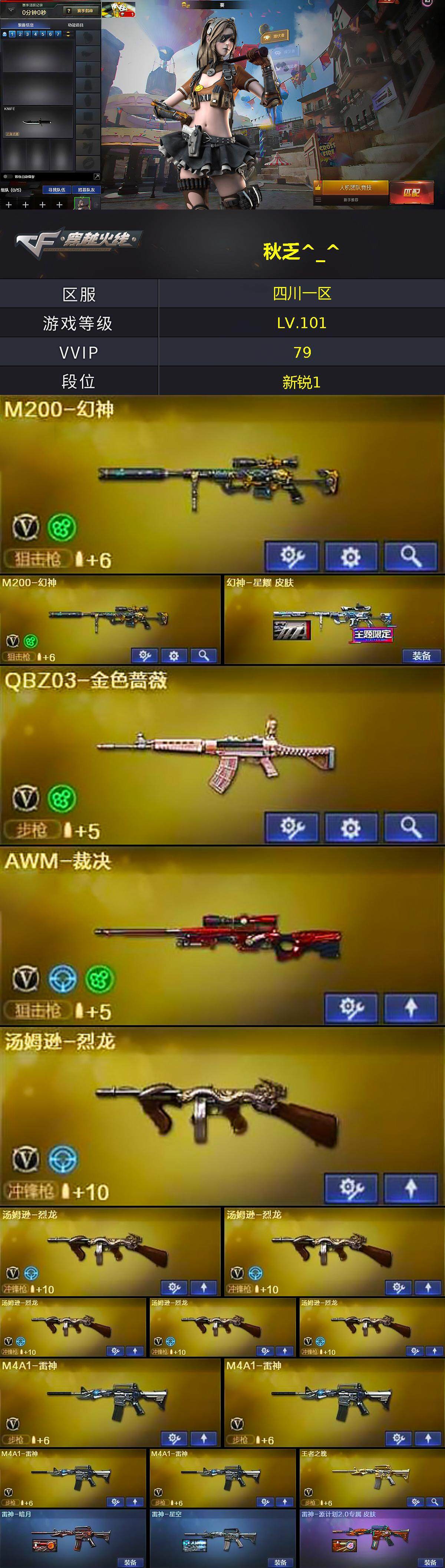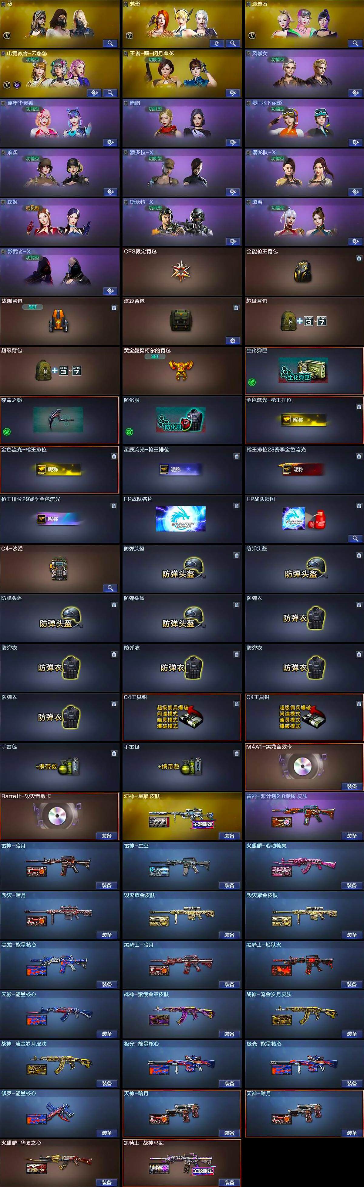 【热门武器】:QBZ03-金色蔷薇,HK417-朱雀,M4A1-青龙,M200-幻神*2,死亡之眼,C.A.T,毒蜂,M4A1-黑骑士*4,汤姆逊-烈龙*6,加特林-炼狱,沙鹰-修罗*3