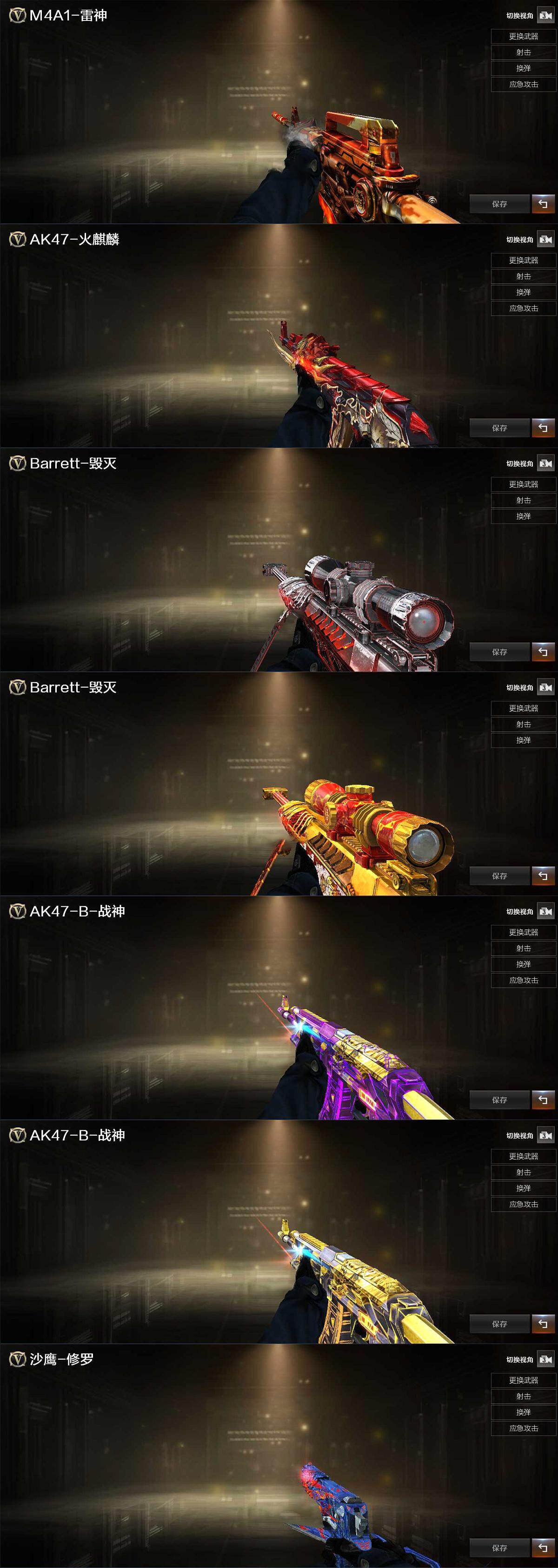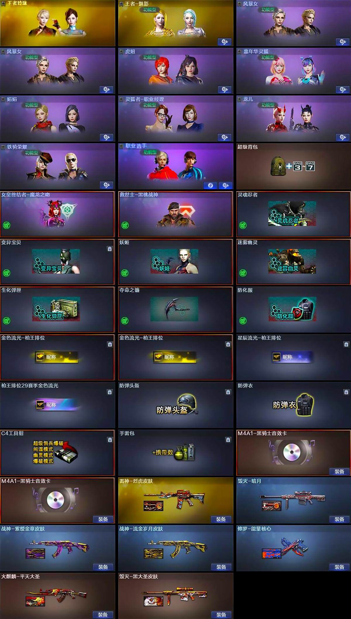 【皮肤】:雷神-烈虎皮肤,火麒麟-平天大圣,毁灭-暗月,毁灭-黑大圣皮肤,战神-紫绶金章皮肤,战神-流金岁月皮肤,AK47-B-常胜将军-曹操,AK47-B-常胜将军-刘备,AK47-B-常胜将军-孙权,修罗-能量核心