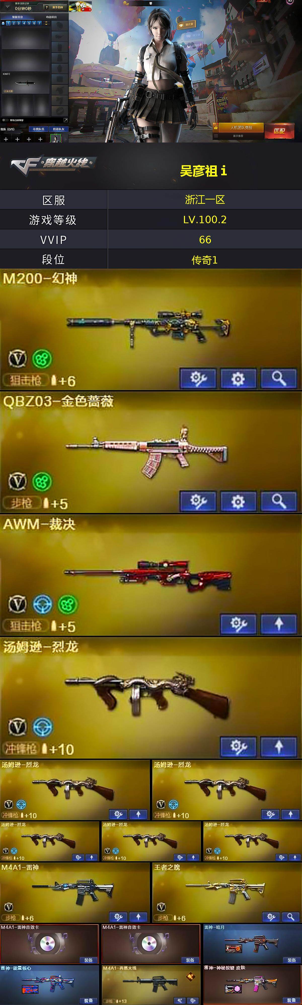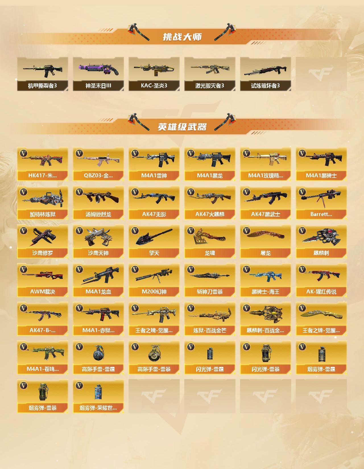 【热门武器】:QBZ03-金色蔷薇,HK417-朱雀,M200-幻神,死亡之眼,C.A.T,M4A1-黑骑士*3,汤姆逊-烈龙*6,加特林-炼狱,沙鹰-修罗*2