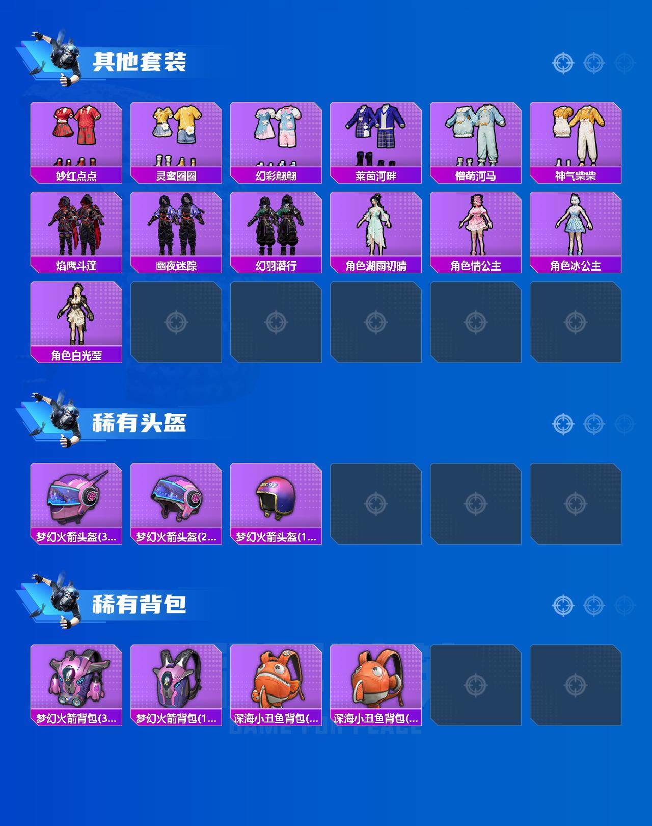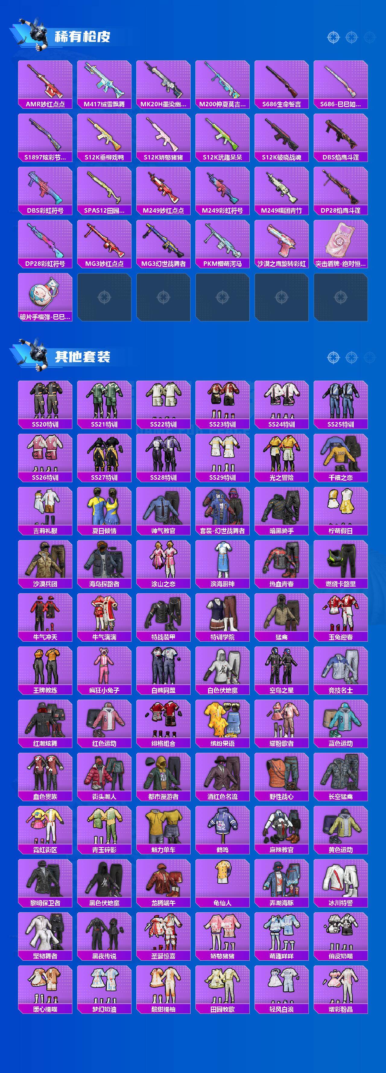 【粉色枪皮等级】:SCAR-L-锦绣绵绵(五级),M416-五爪金龙(七级),M416-电玩时刻(五级),GROZA-镜光银凌(五级),AUG-暖羊咩咩(五级),Kar98K-巳巳如意(五级),Mk14-精灵梦叶罗丽(六级)