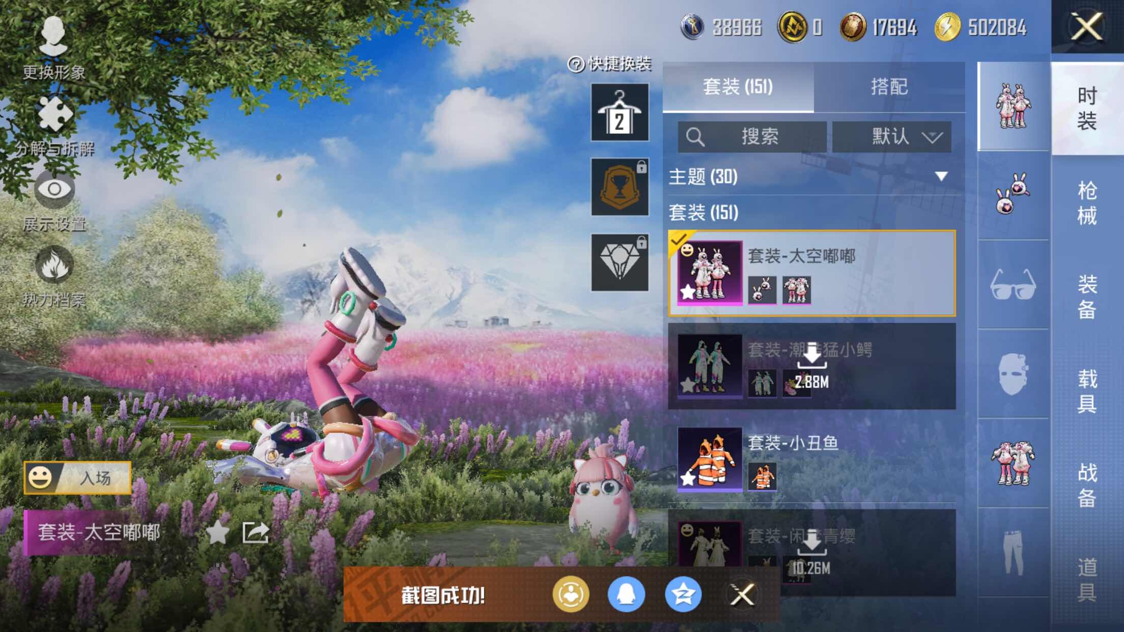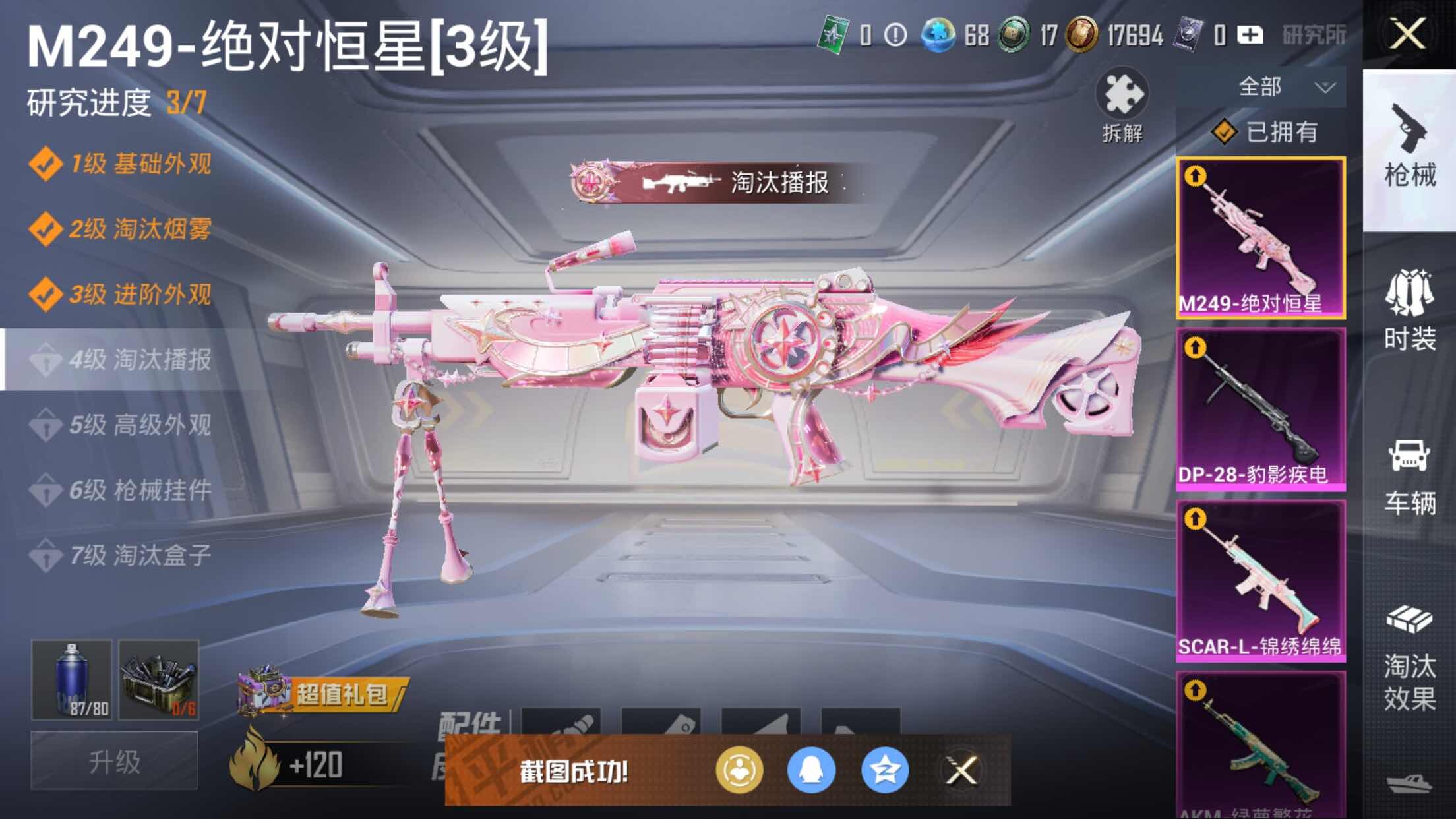 【粉色枪皮等级】:AKM-绿萝繁花(五级),SCAR-L-锦绣绵绵(五级),M416-五爪金龙(七级),M249-绝对恒星(三级),DP-