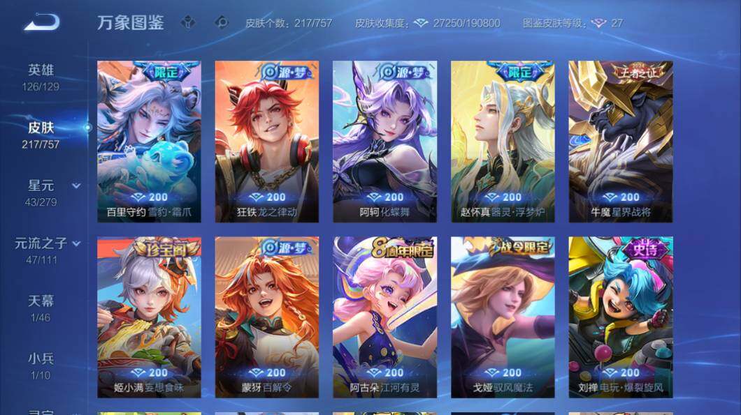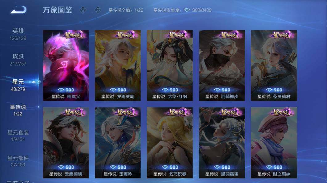 【传说皮肤】:澜愿照九州拓,虞姬愿照岁时盈,李信山海炽霜斩,诸葛亮时雨天司,曜云鹰飞将,李信一念神魔,花木兰冠军飞将,孙悟空地狱火
