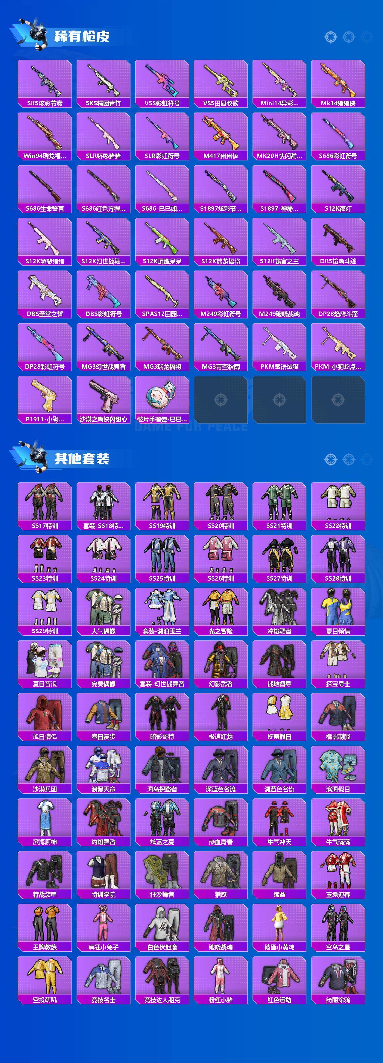 【粉色枪皮等级】:AUG-暖羊咩咩(五级),Kar98K-巳巳如意(五级),DP-28-圣堂之誓(七级),DP-28-豹影疾电(五级)