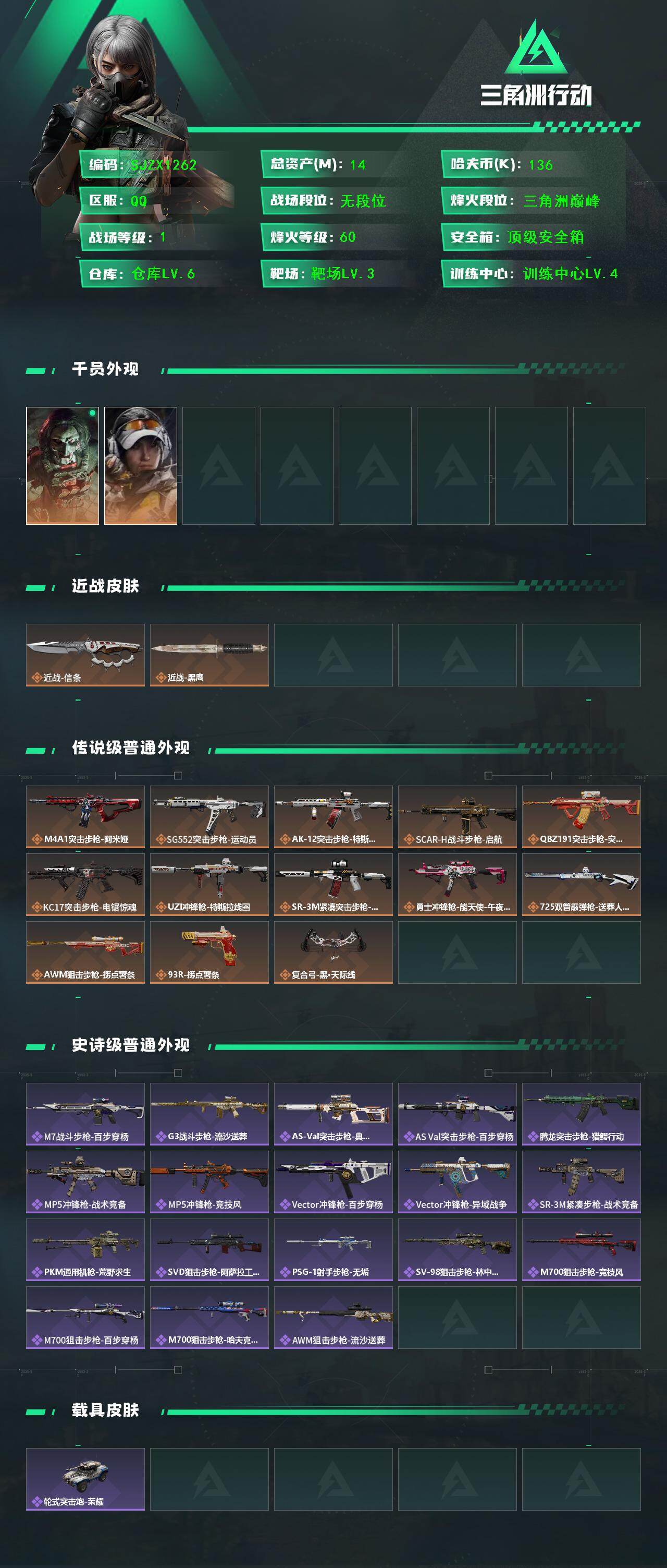 【SJZX1262】总资产(M):14M/哈夫币(K):136K/哈夫币(K):136K/传说枪皮数:13/全面战场等级:1_段位:无段位/烽火地带等级:60_段位:三角洲巅峰/红狼-电锯惊魂/露娜-金牌射手/近战-信条/近战-黑鹰/M4A1突击步枪-阿米娅/SG552突击步枪-运动员/AK-12突击步枪-特斯拉线圈/SCAR-H战斗步枪-启航/腾龙突击步枪-捞点薯条/KC17突击步枪-电锯惊魂/UZI冲锋枪-特斯拉线圈/SR-3M紧凑突击步枪-特斯拉线圈/勇士冲锋枪-能天使-午夜邮差/725双