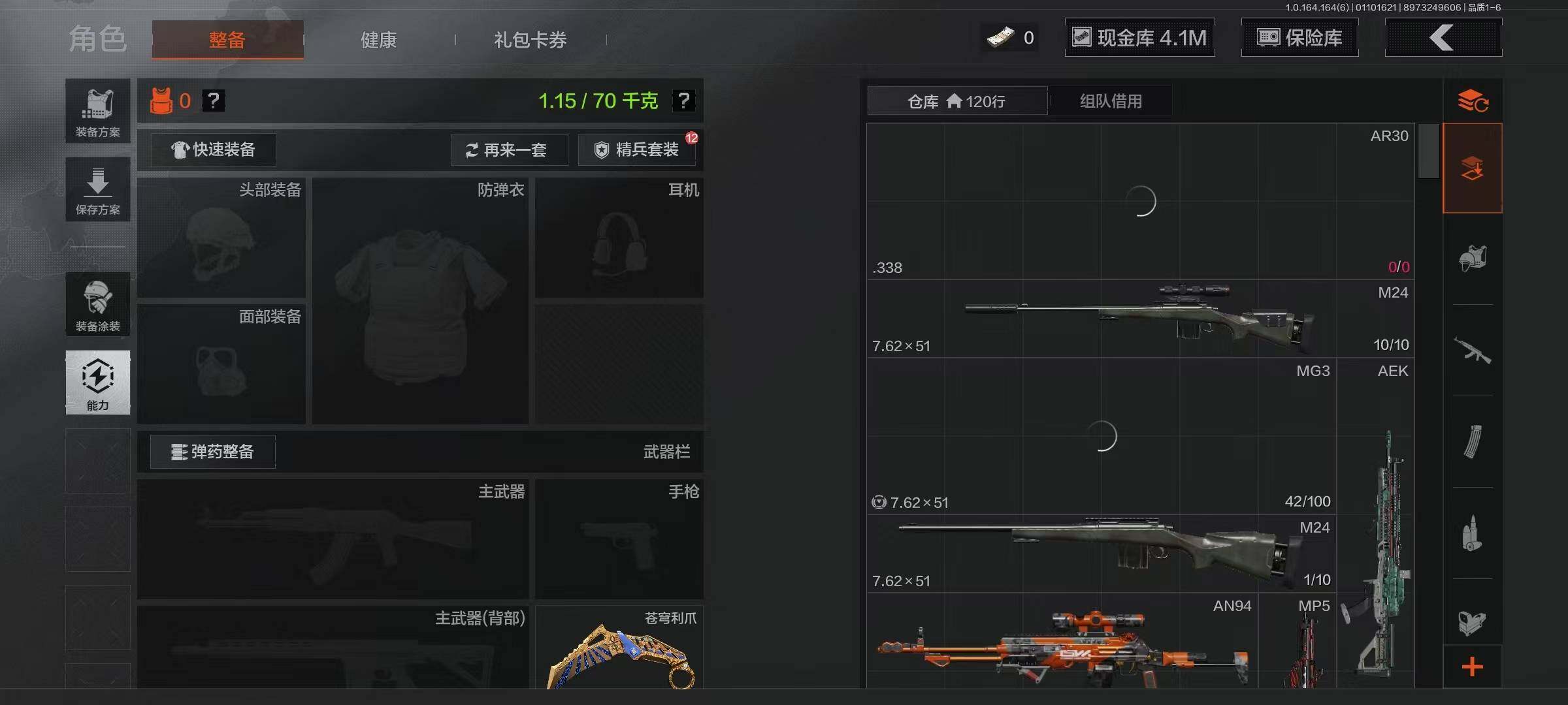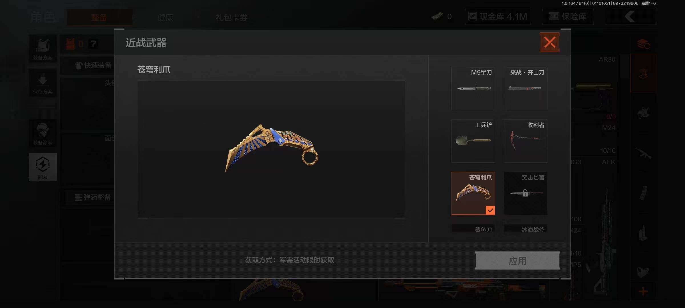 【AQZG927】等级:30/段位:专家/仓库价值(百万):14.4/柯恩币:4117411/苍穹利爪/收割者/工兵铲/来战开山刀/告丧夜曲AR57/旗帜AEK/利齿风暴MPX/旧王圣谕VSS