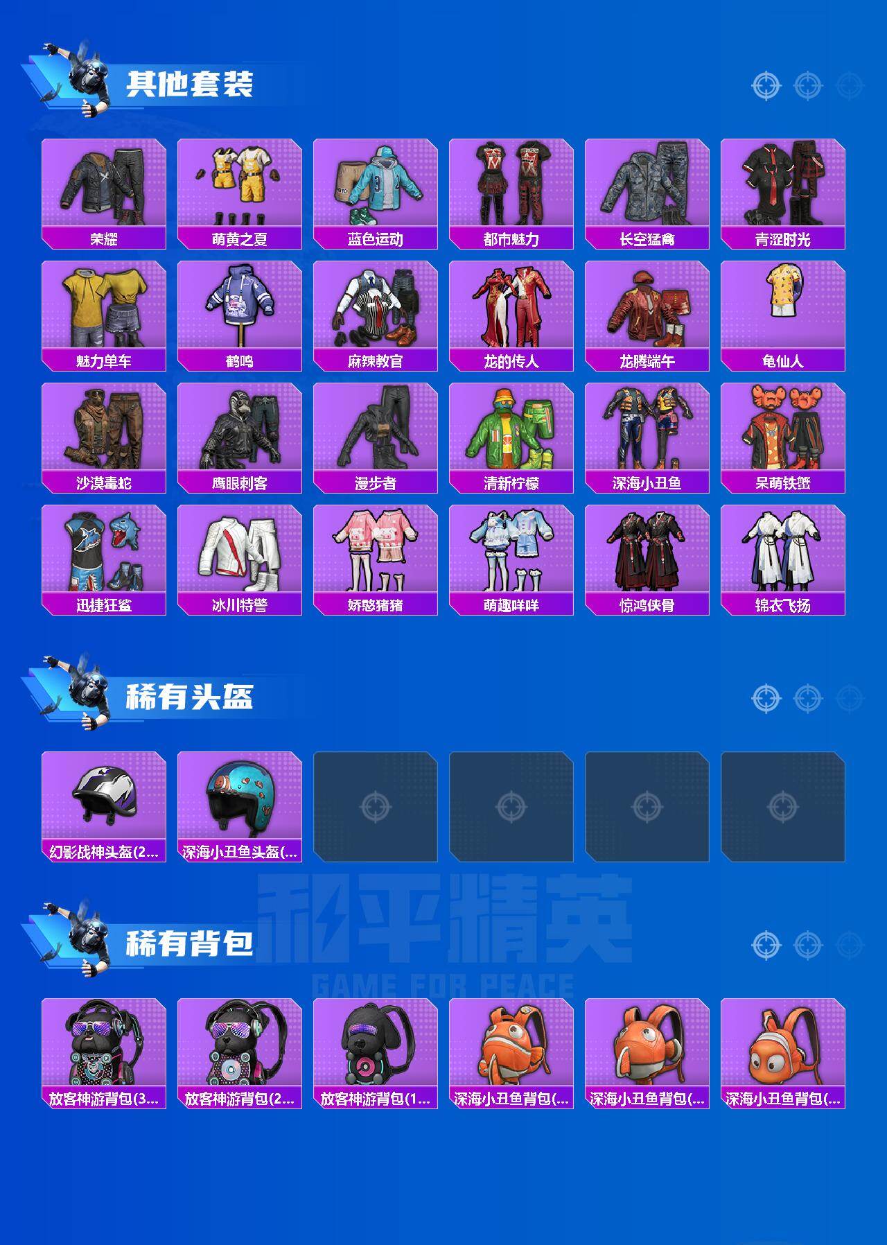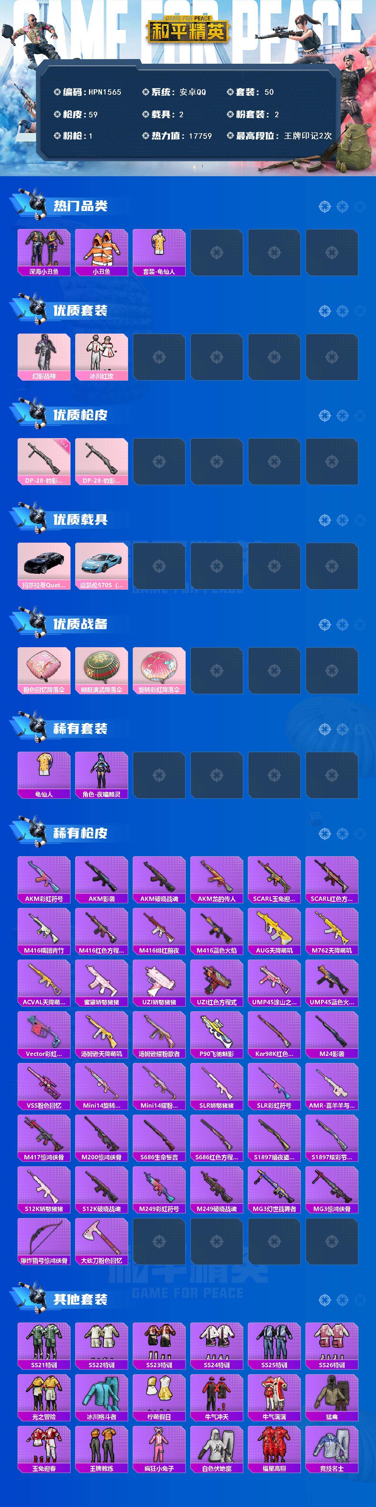 【HPN1565】50套装/枪械1/装备53/载具2/战备48/王牌印记2/热力值17759/二级DP-28-豹影疾电/深海小丑鱼/小丑鱼/套装-龟仙人/幻影战神/冰川红玫/玛莎拉蒂Quattroporte(夜幕蓝)/迈凯伦570S(天际蓝)/DP-28-豹影疾电/粉色回忆降落伞/翩跹演武降落伞/旋转彩虹降落伞/龟仙人/角色-夜瞳黯灵/AKM-彩虹符号/AKM-影袭/AKM-破晓战魂/AKM-龙的传人/SCAR-L-玉兔迎春/SCAR-L-红色方程式/M416-糯团青竹/M416-红色方程式/M