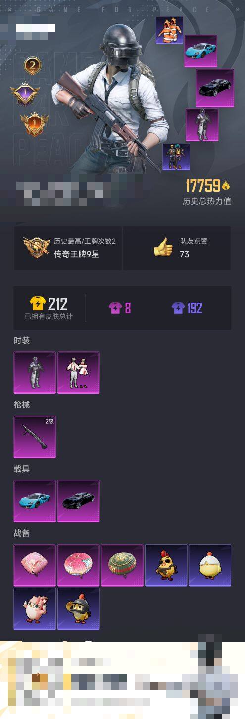 50套装/枪械1/装备53/载具2/战备48/王牌印记2/热力值17759