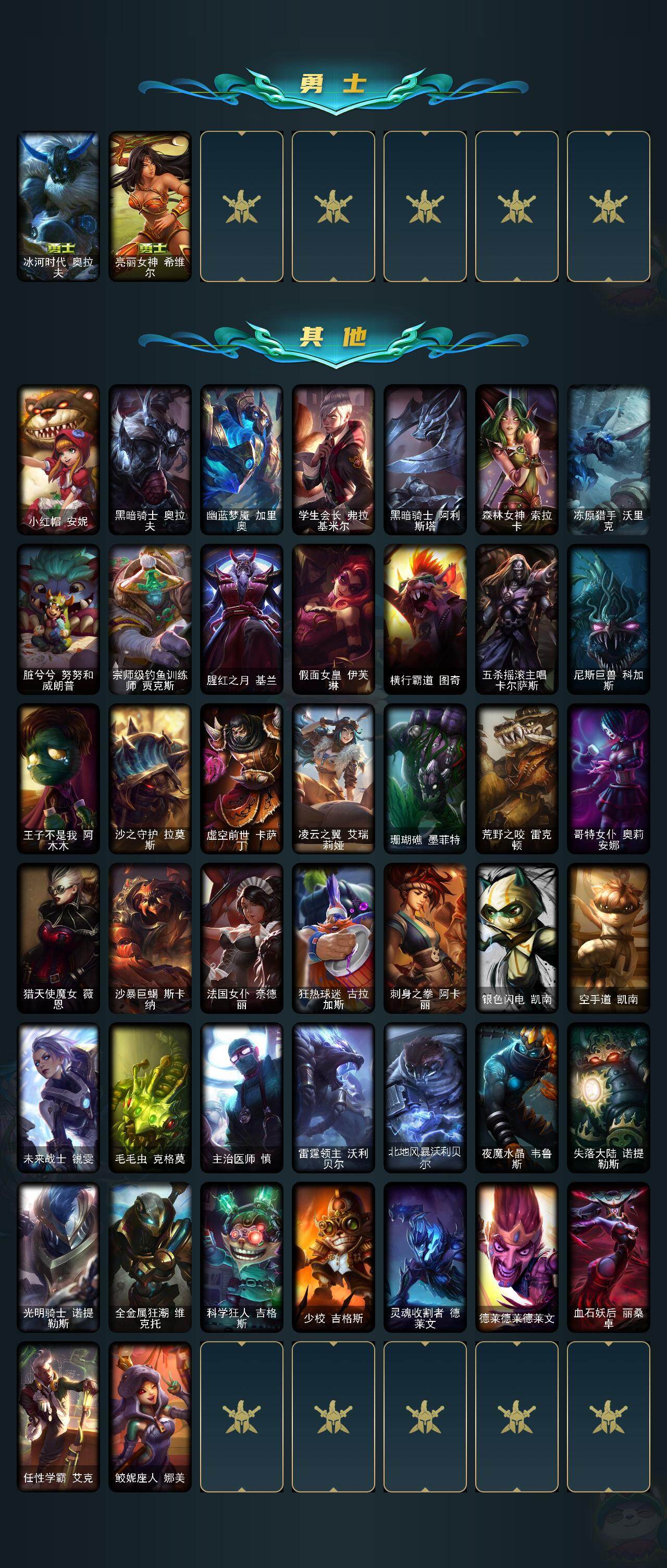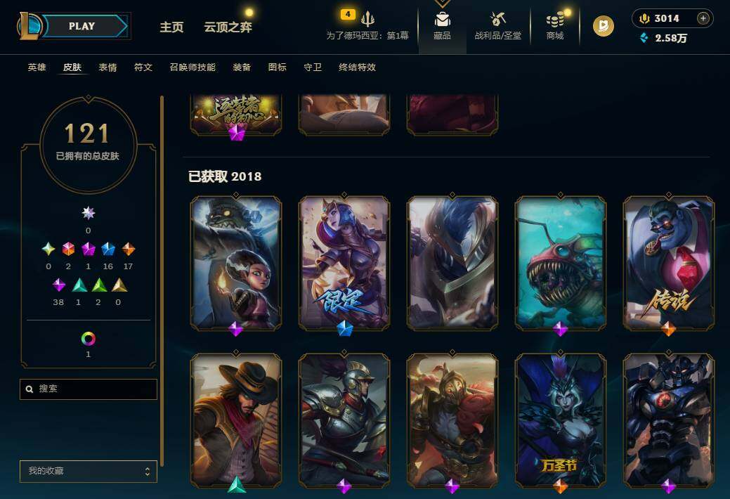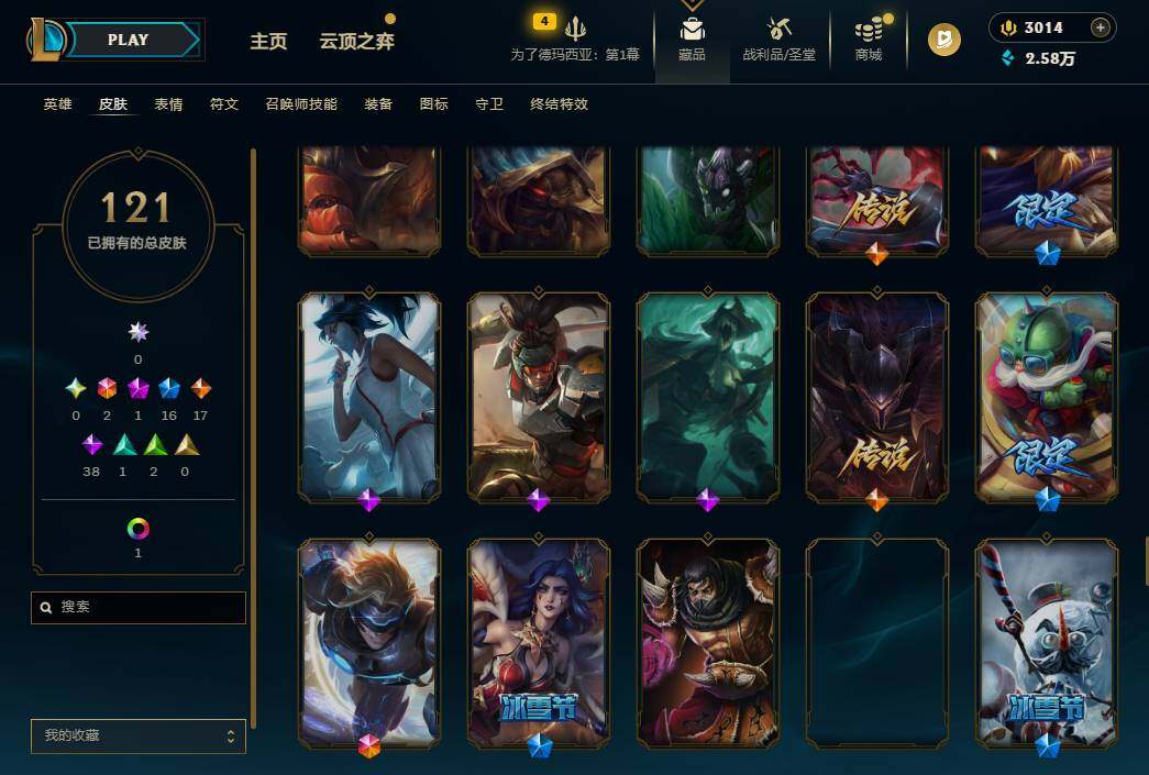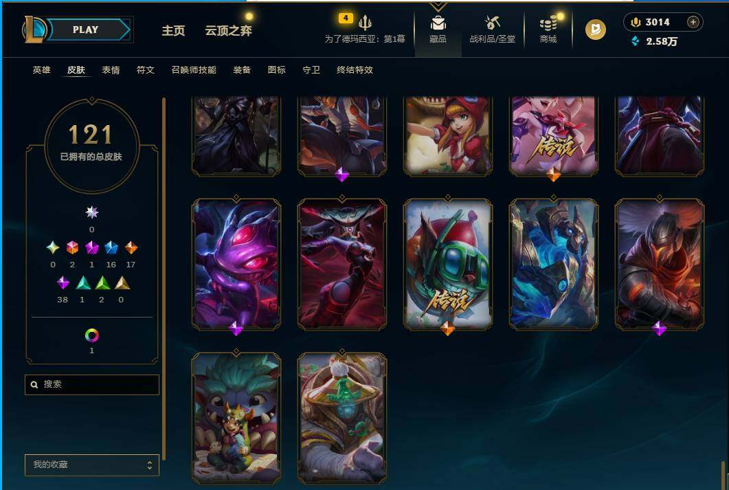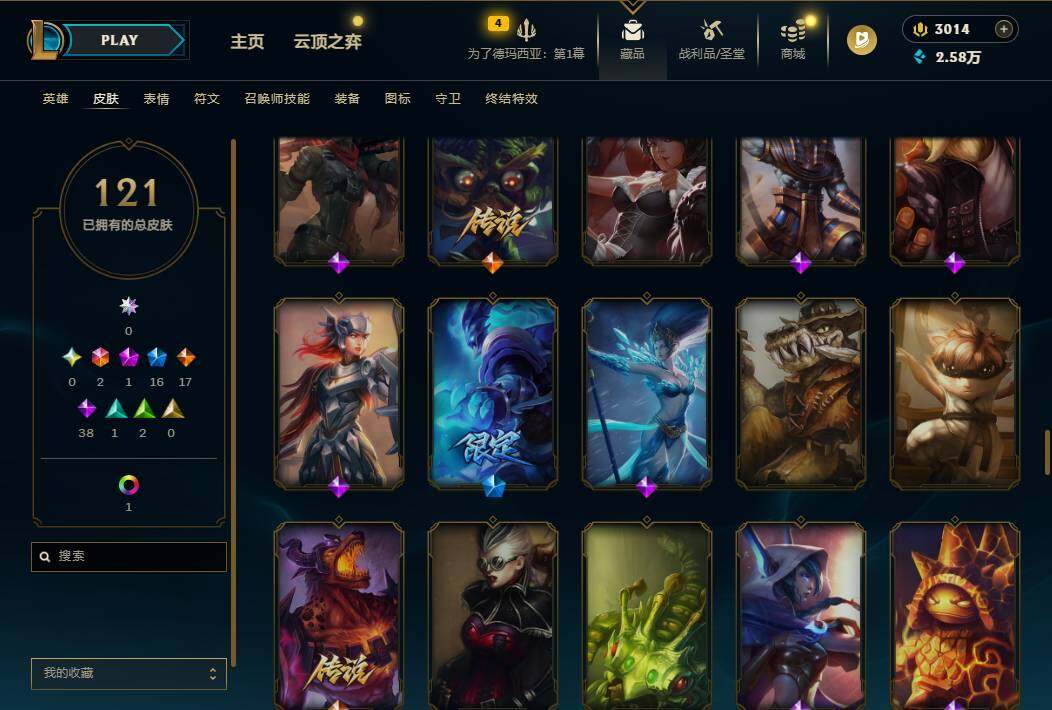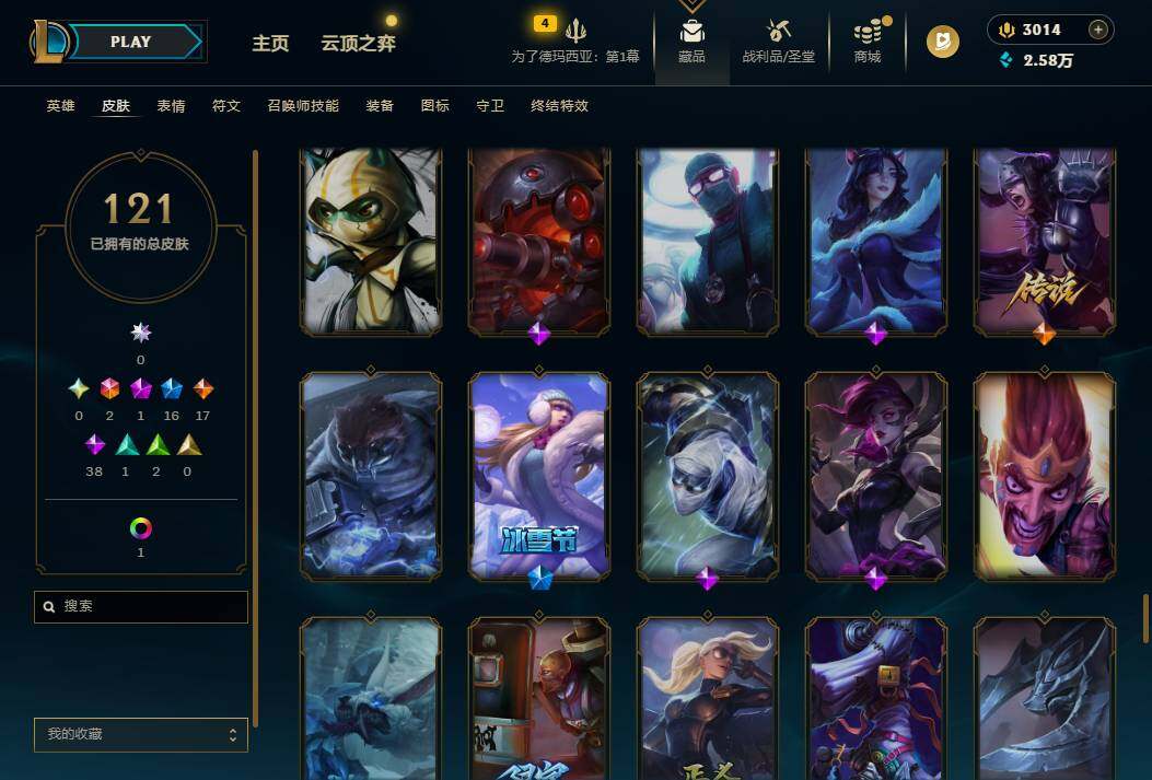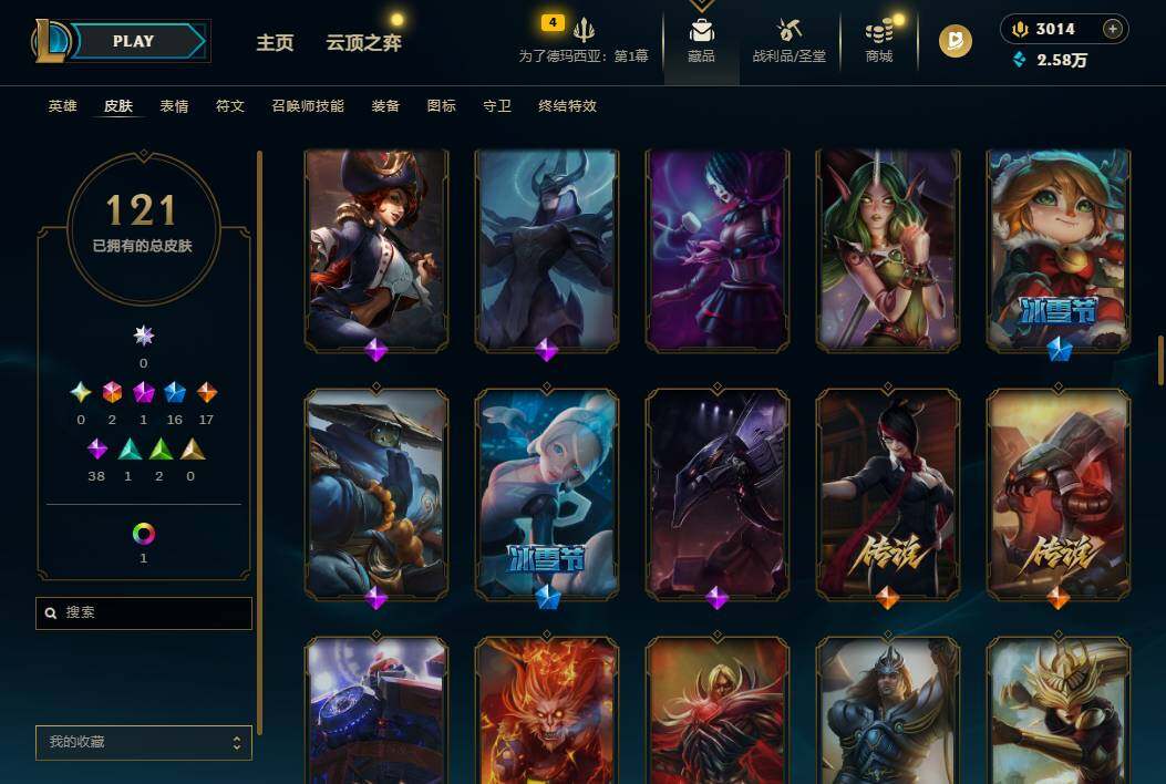 160英雄/121皮肤/2终极/1神话/16限定/1炫彩/17传说/38史诗