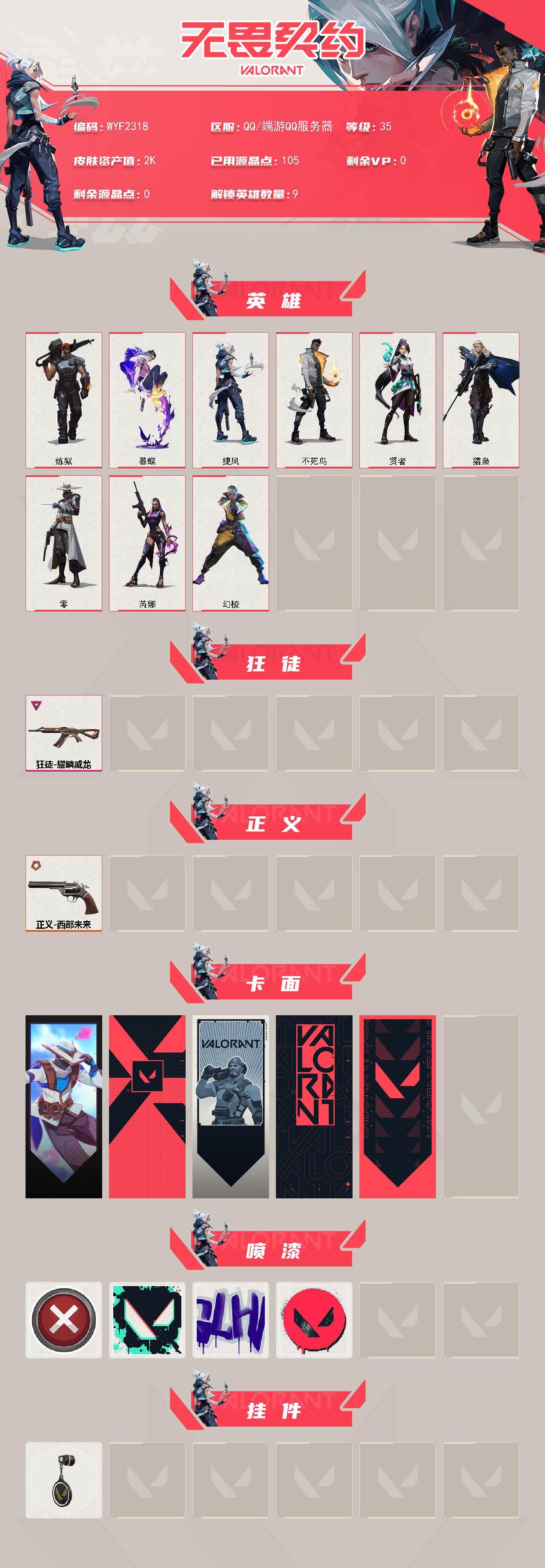【WYF2318】终极*1/卓越*1/皮肤*2/等级*35/段位:黑铁/幻棱/炼狱/暮蝶/捷风/不死鸟/贤者/猎枭/零/芮娜/狂徒-耀鳞威龙/正义-西部未来/无畏契约GO!第一卷:零 卡面/代号红色 卡面/新兵报到 卡面/V契约 卡面/无畏契约 卡面/买装还是存钱 喷漆/胜利属于无畏契约 喷漆/GLHF 喷漆/无畏契约 喷漆/无畏契约 纪念币 挂饰