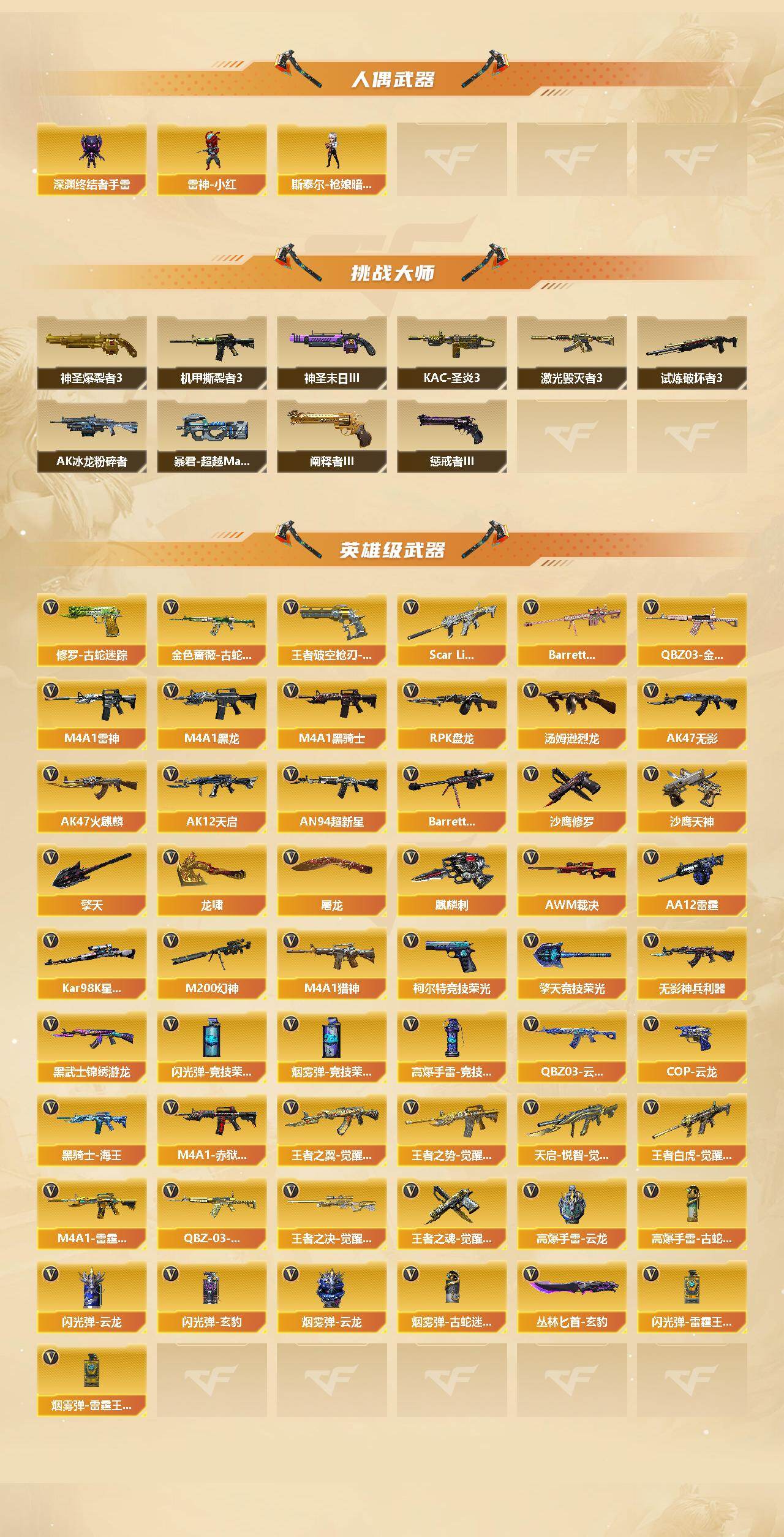【热门武器】:传说幽冥,QBZ03-金色蔷薇,Scar Light-白虎,M200-幻神,金色蔷薇-古蛇迷踪,修罗-古蛇迷踪,Kar98K-星神,M4A1-黑骑士*3,汤姆逊-烈龙*3,RPK-盘龙*2,雷神-小红,沙鹰-修罗*2