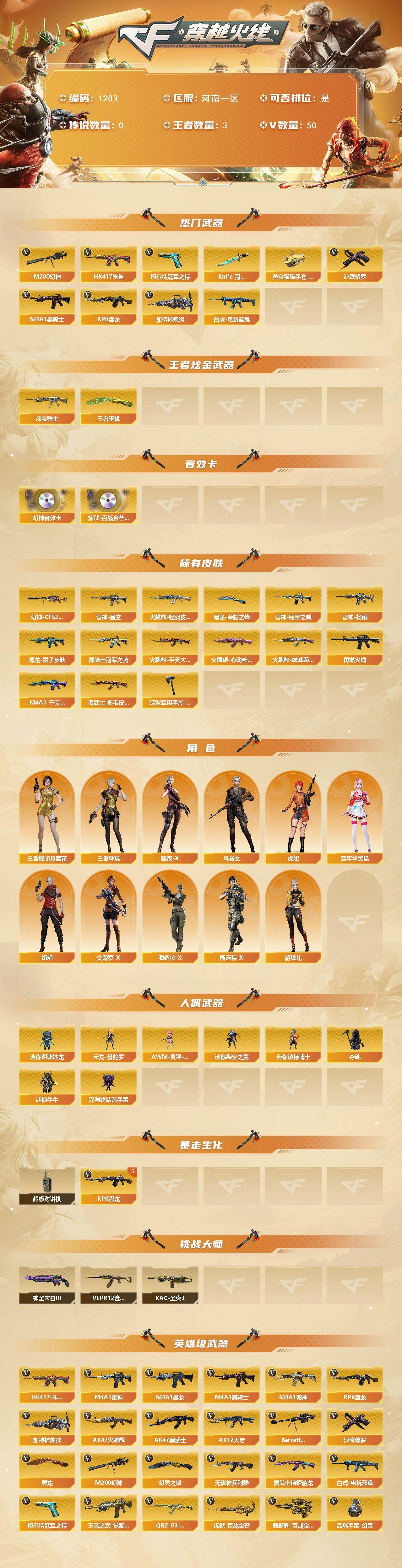 河南一区-50V-3王者-1炫金【热门武器】:HK417-朱雀,M200-幻