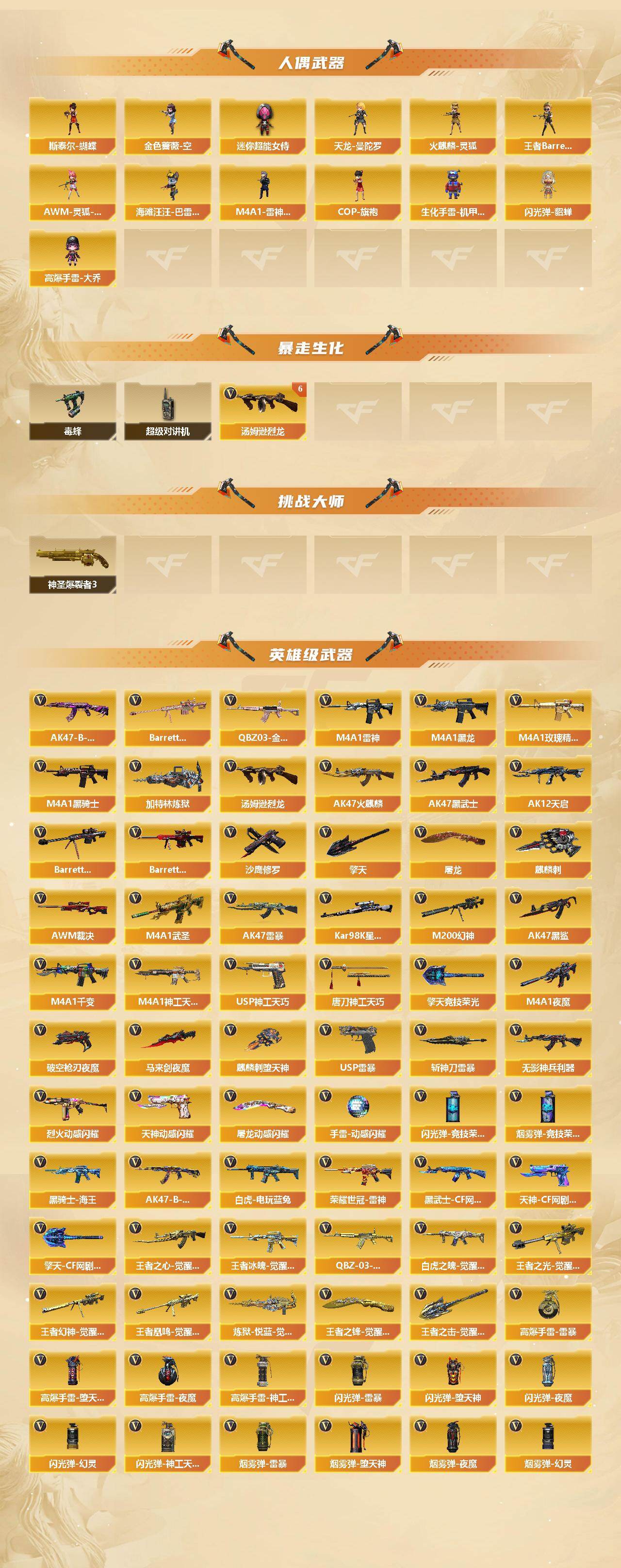 【热门武器】:QBZ03-金色蔷薇,M200-幻神,荣耀世冠-雷神,白虎-电玩蓝兔,Kar98K-星神,毒蜂*2,M4A1-黑骑士*3,汤姆逊-烈龙*6,加特林-炼狱,金色蔷薇-空,斯泰尔-蝴蝶,USP-雷暴,沙鹰-修罗*4,金刚伞
