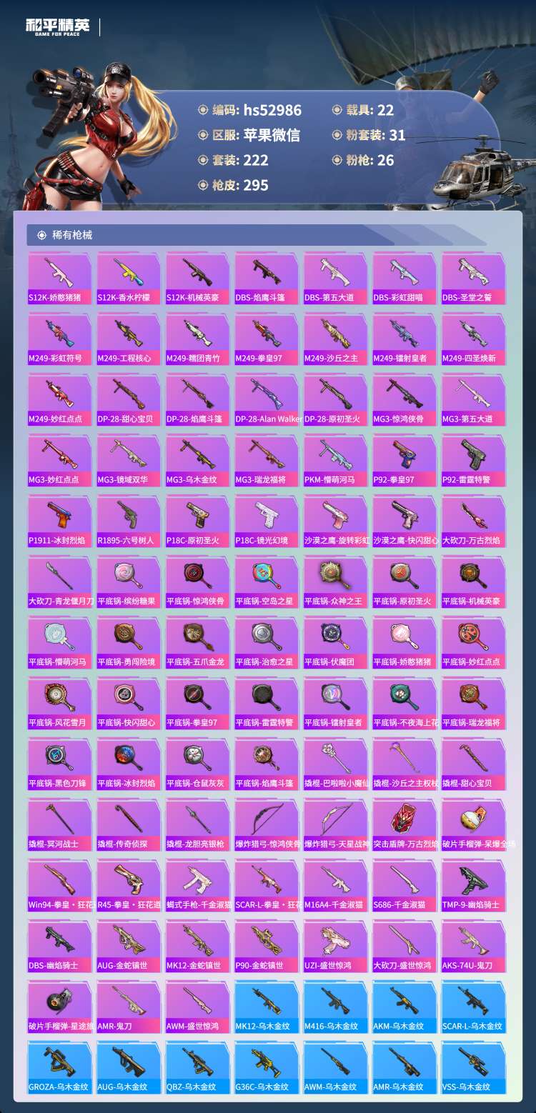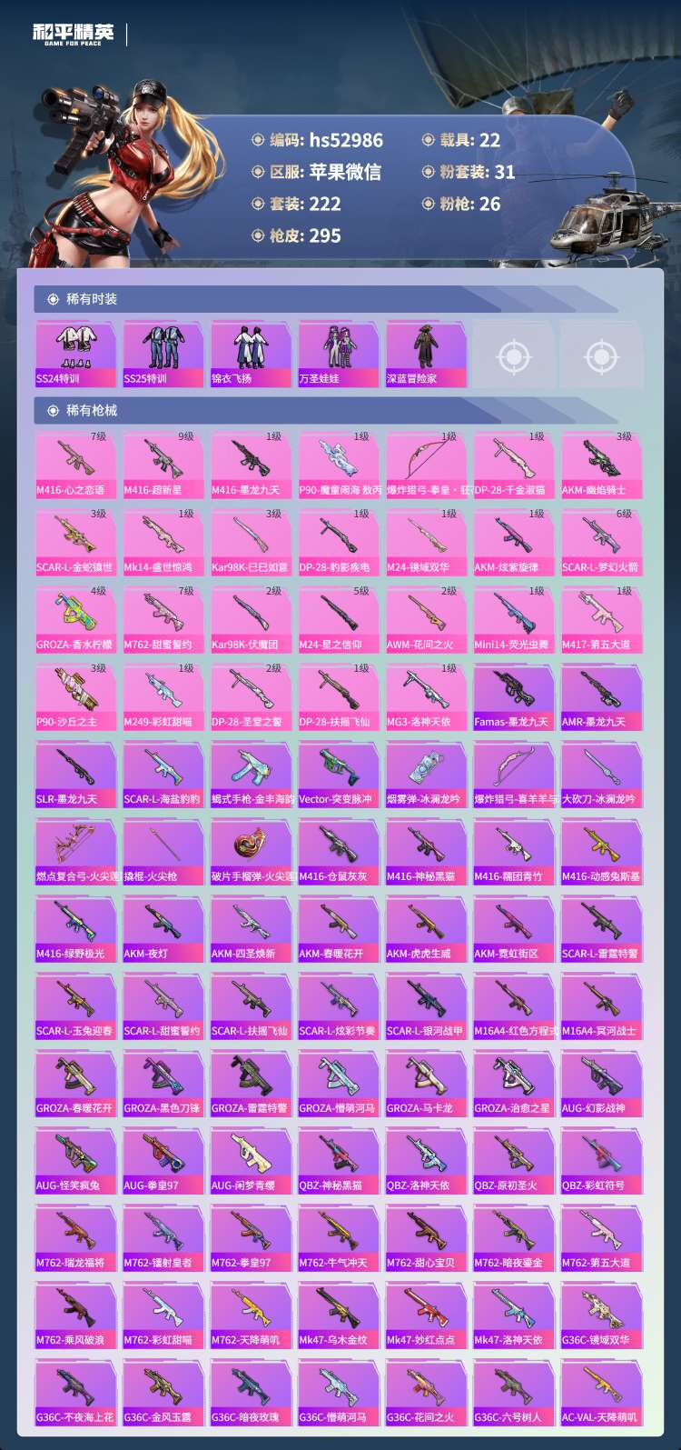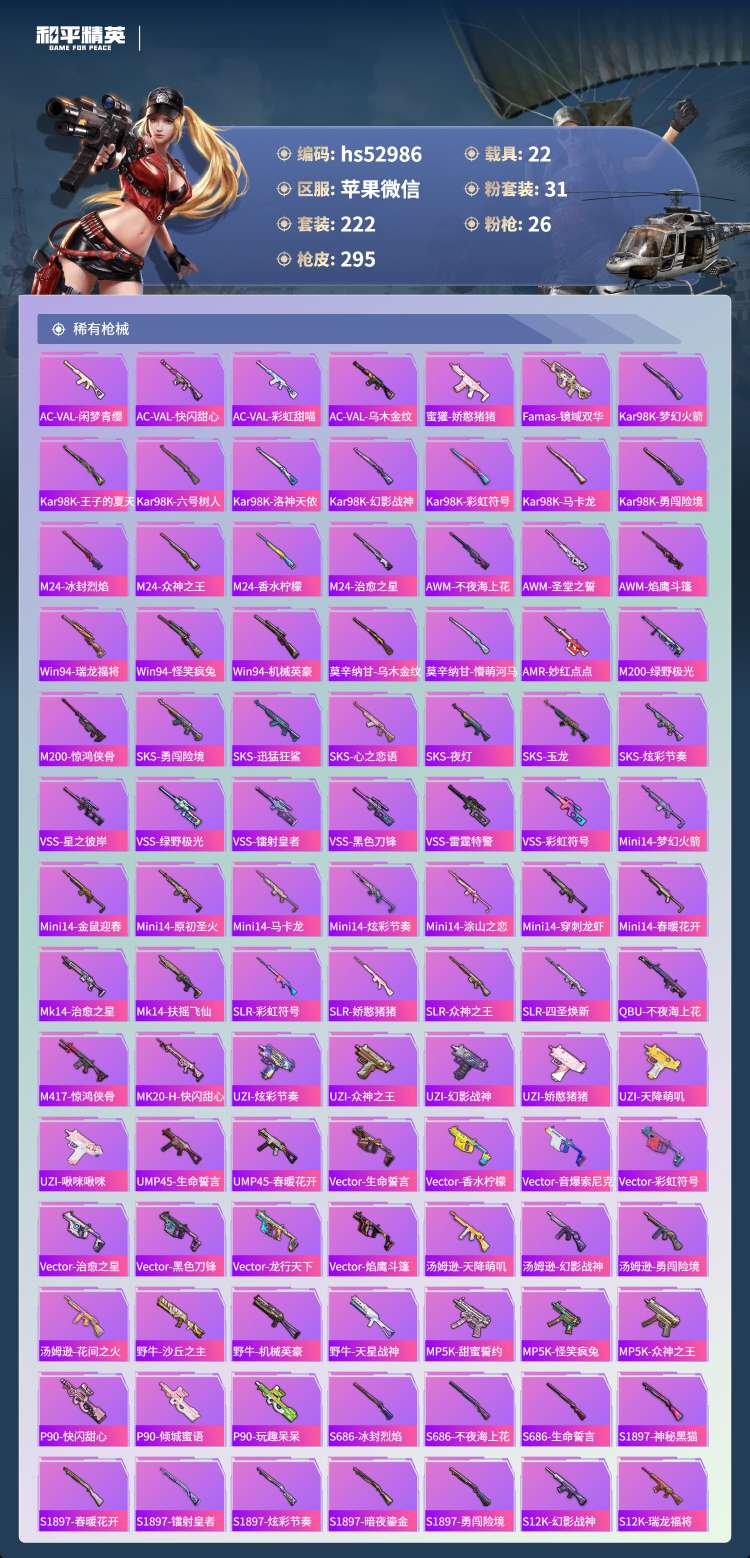 hs52986 苹果微-10王牌印记-4红装-31粉装-26特效枪-22载具-191321热力值-