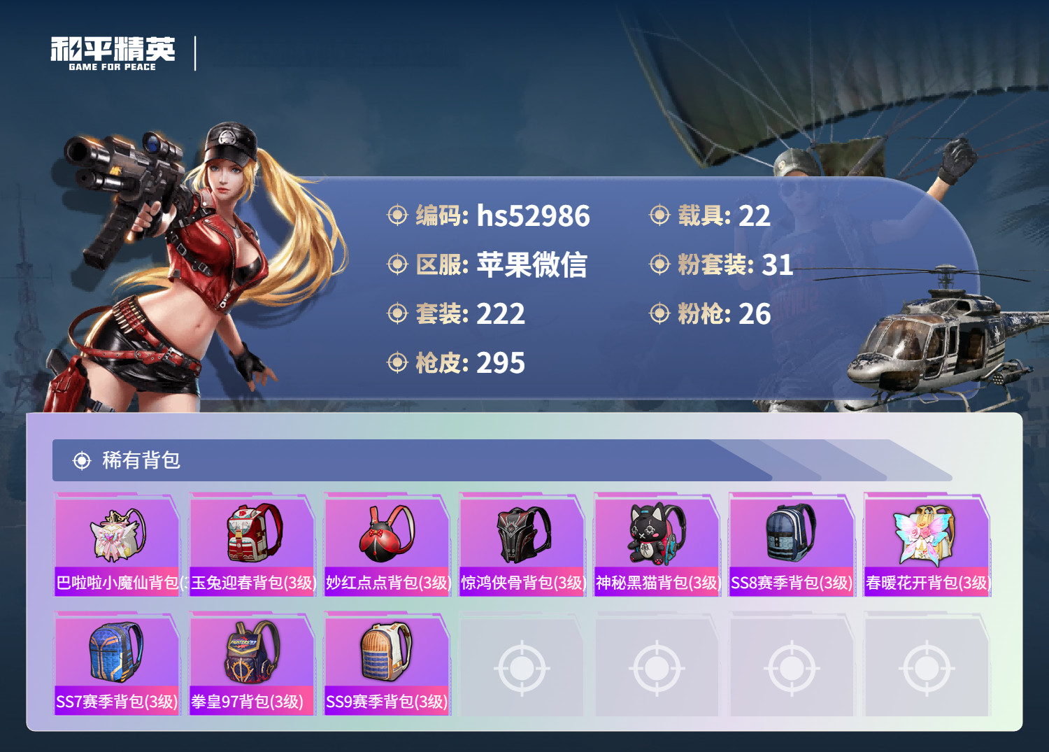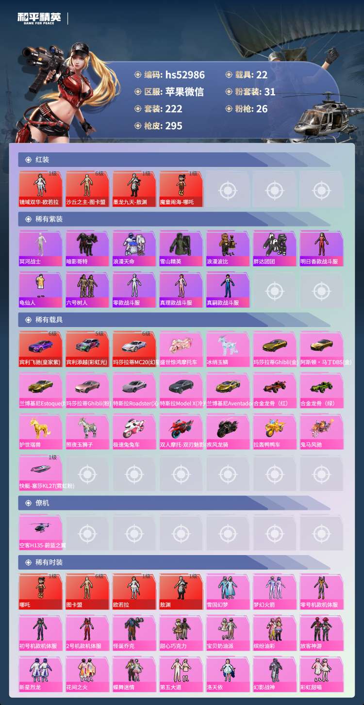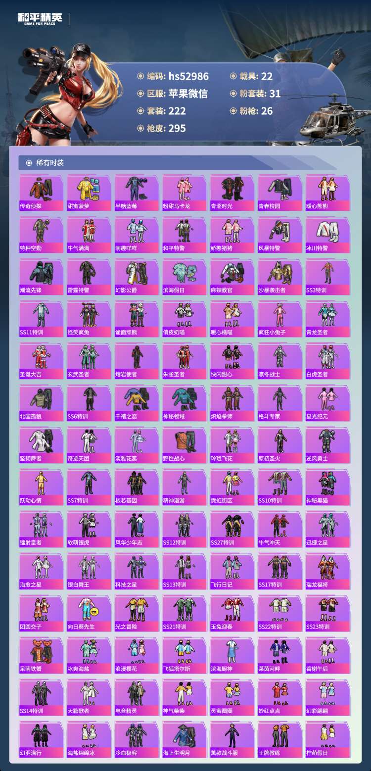hs52986 苹果微-10王牌印记-4红装-31粉装-26特效枪-22载具-191321热力值-