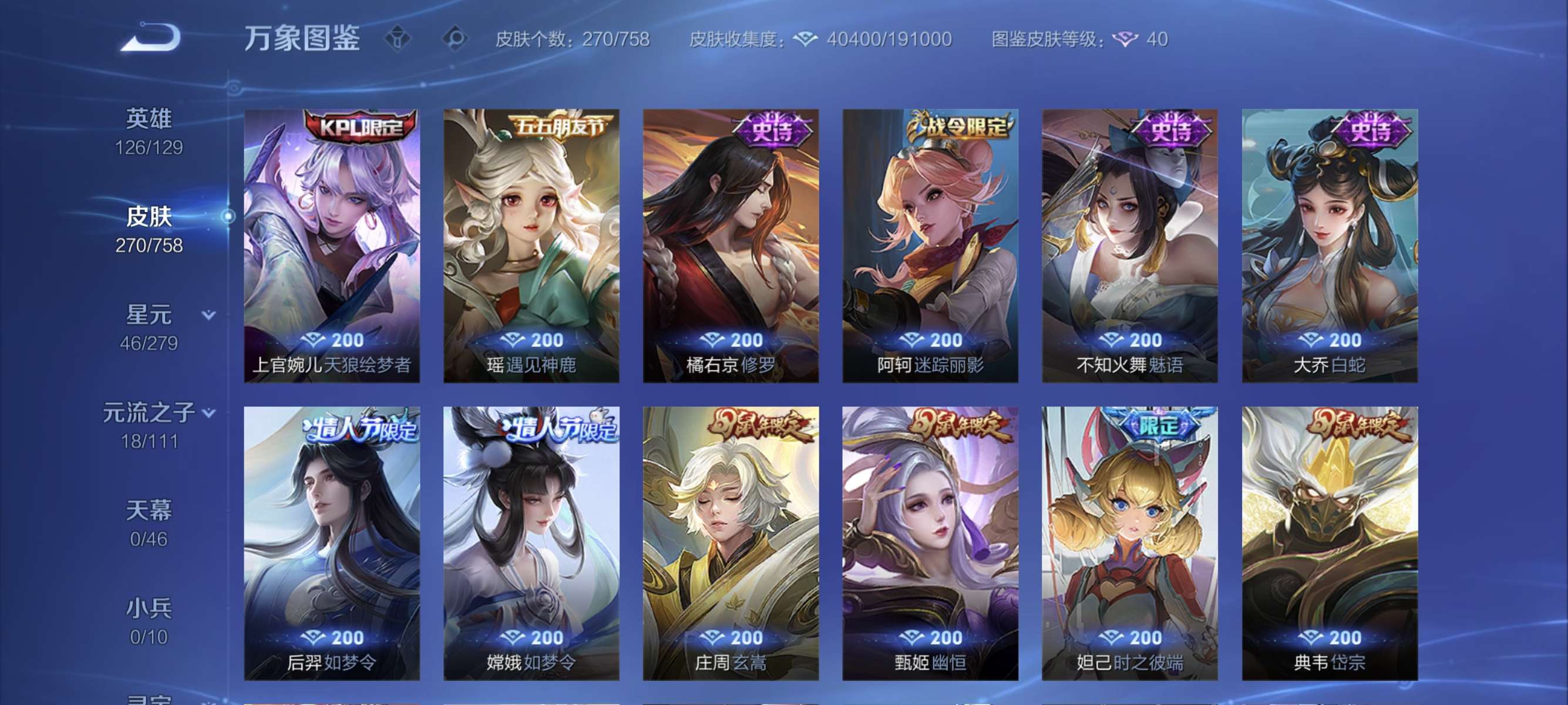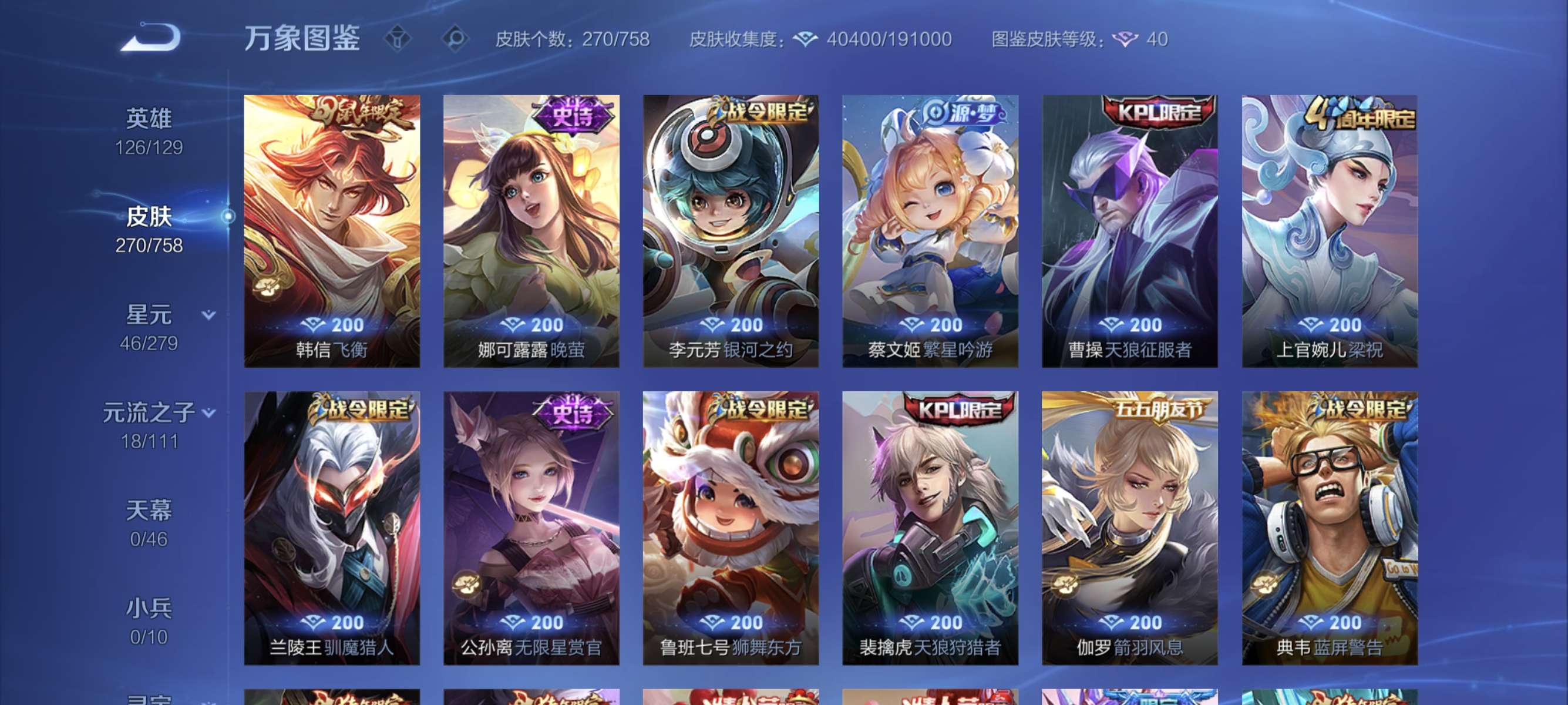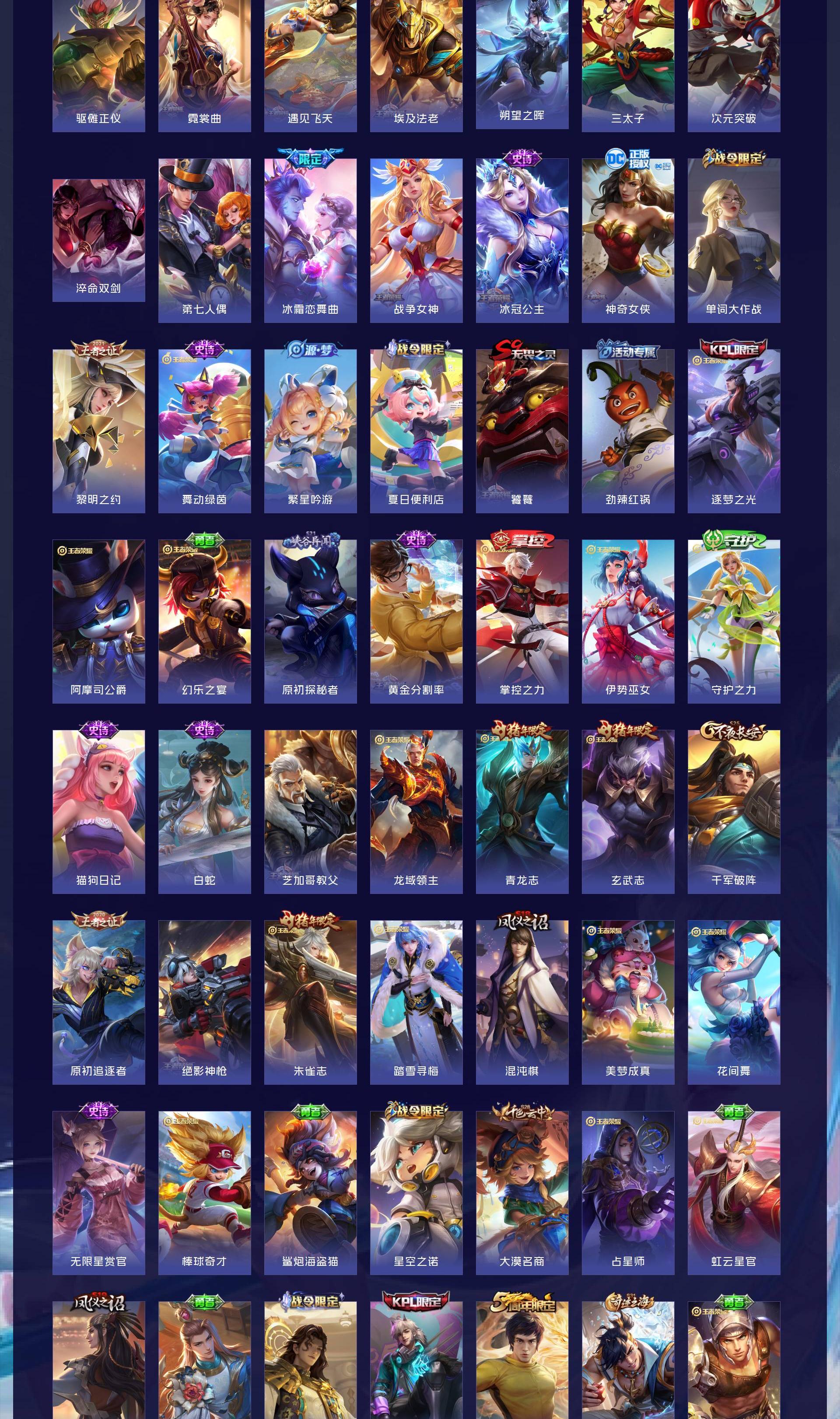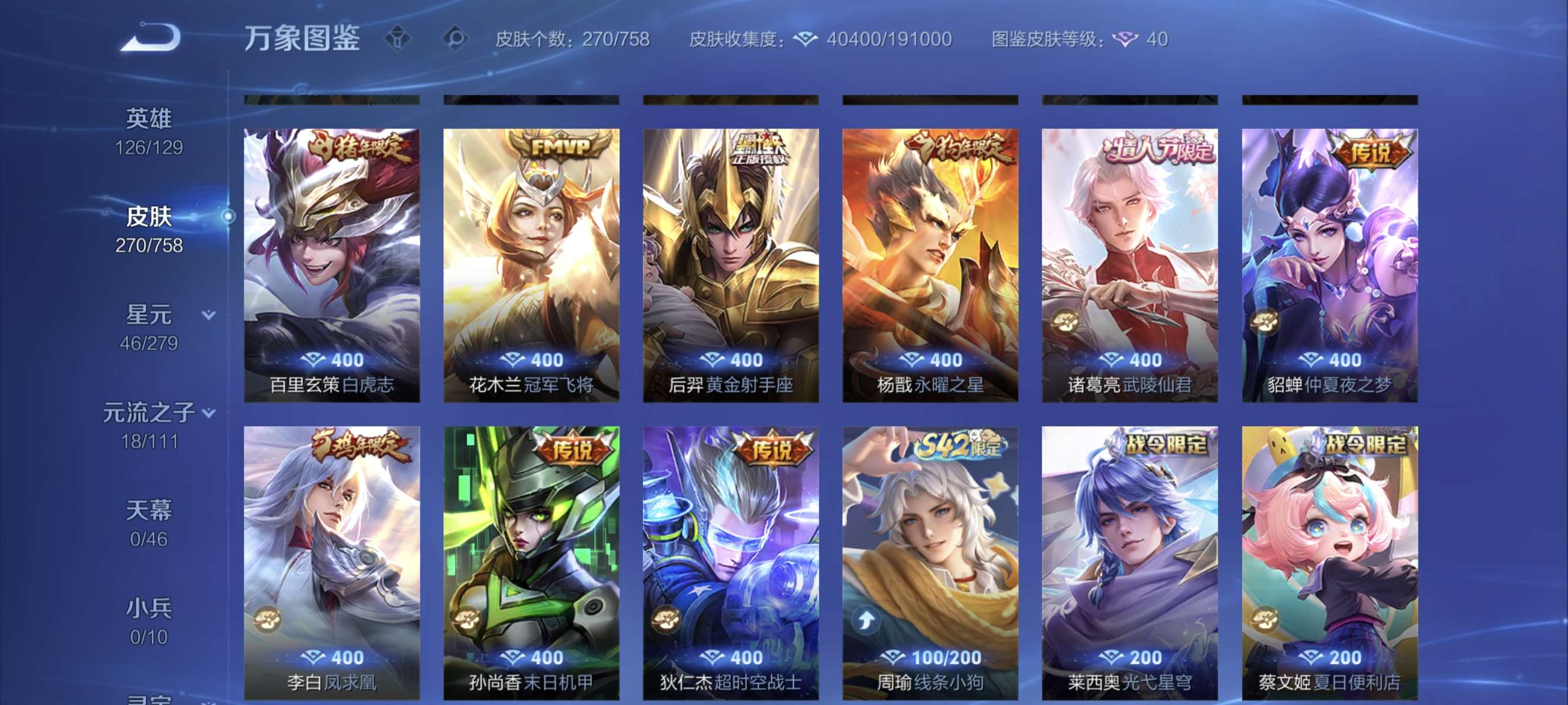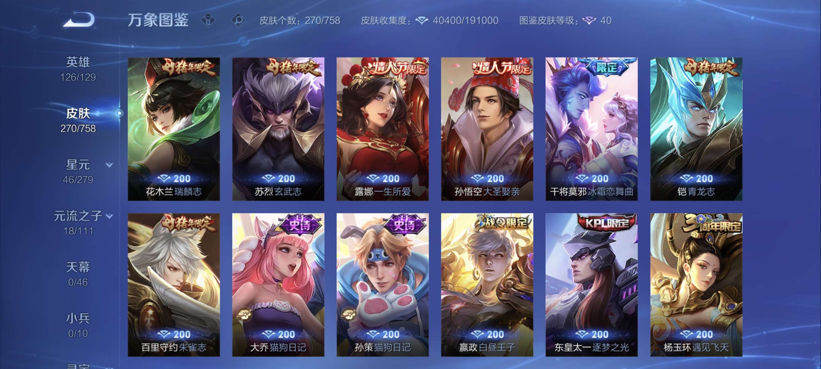 V8 皮肤270 英雄129 至尊星耀 荣耀典藏1 星传说2 传说20 其他皮肤255