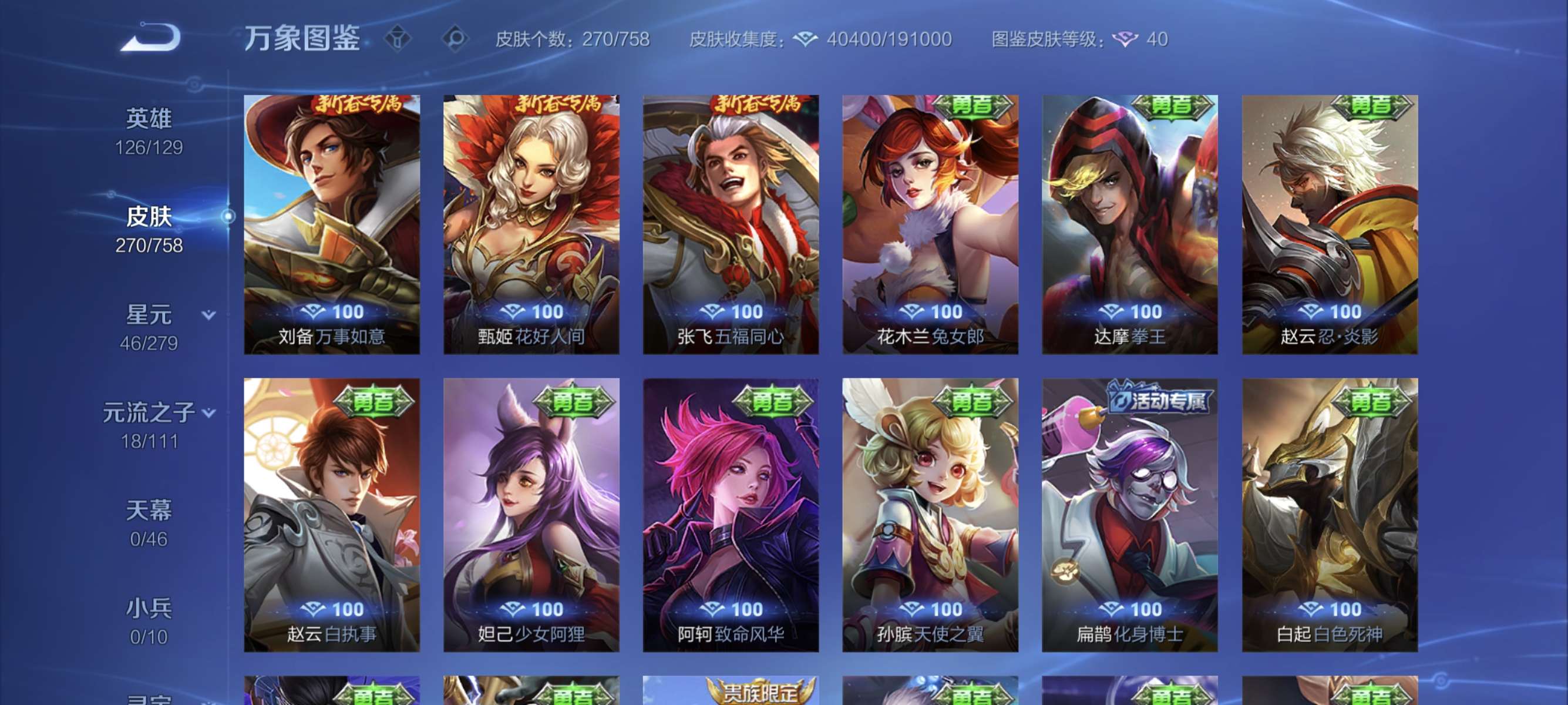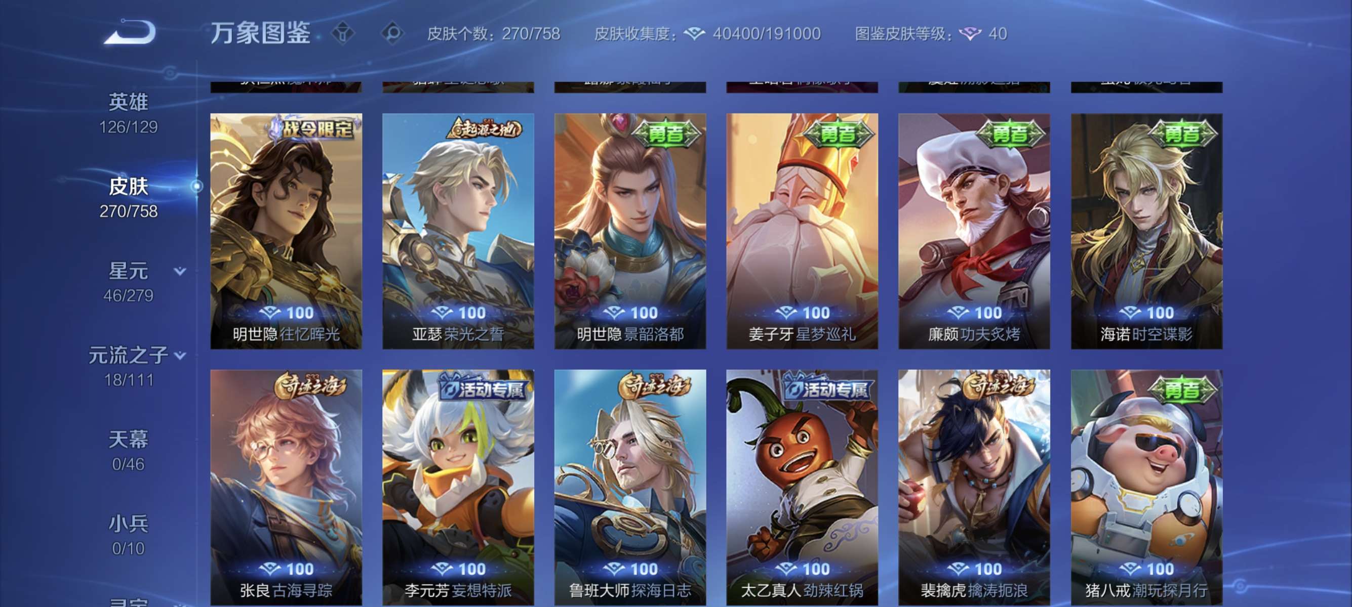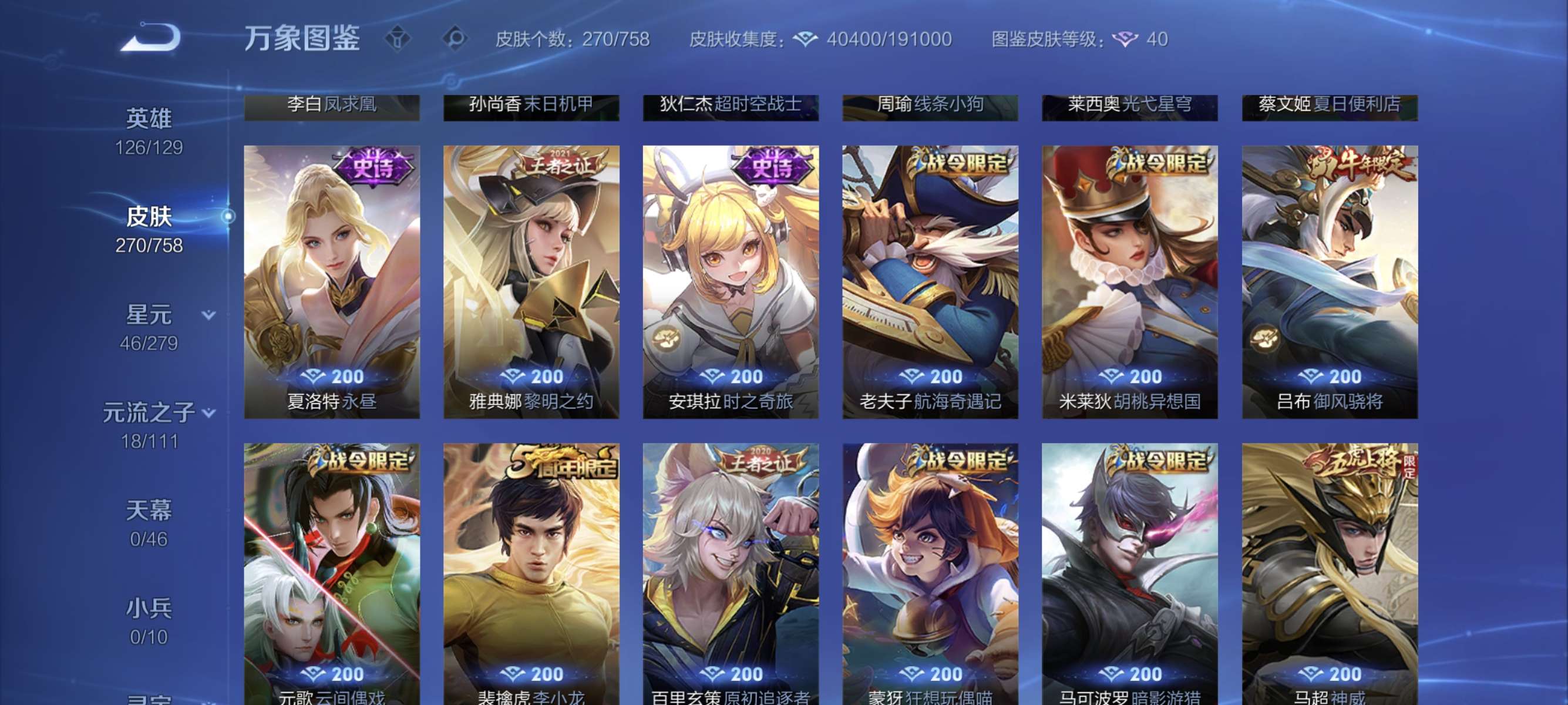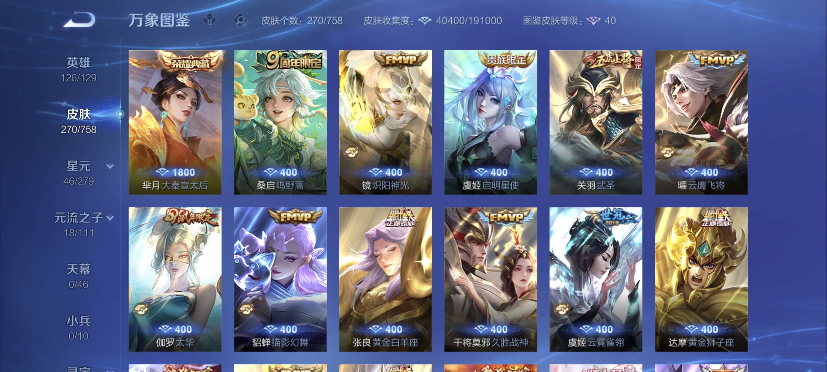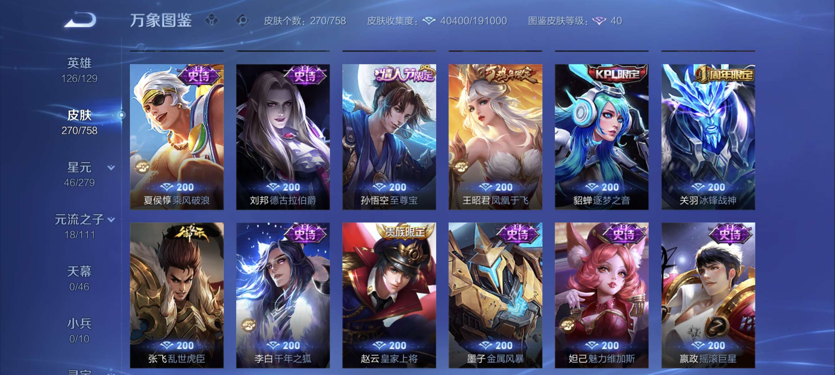 V8 皮肤270 英雄129 至尊星耀 荣耀典藏1 星传说2 传说20 其他皮肤255