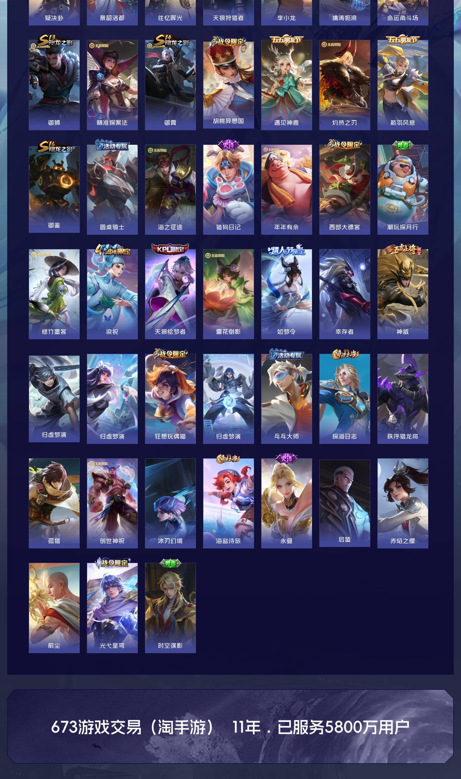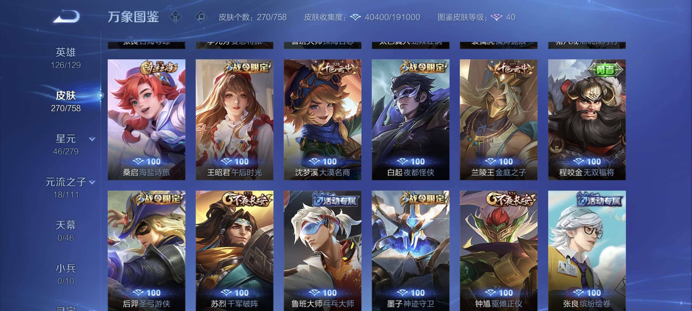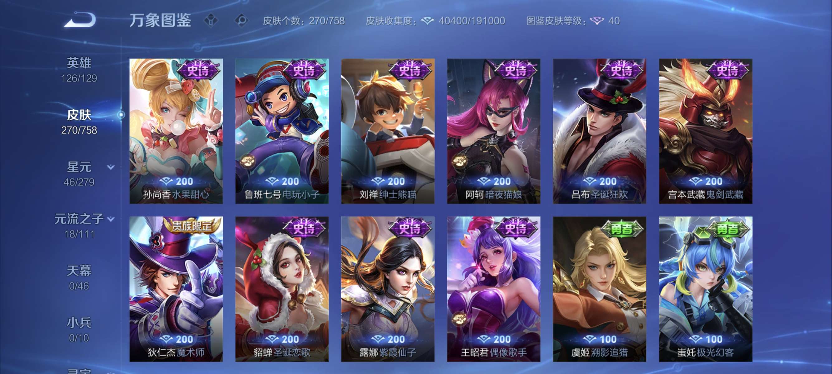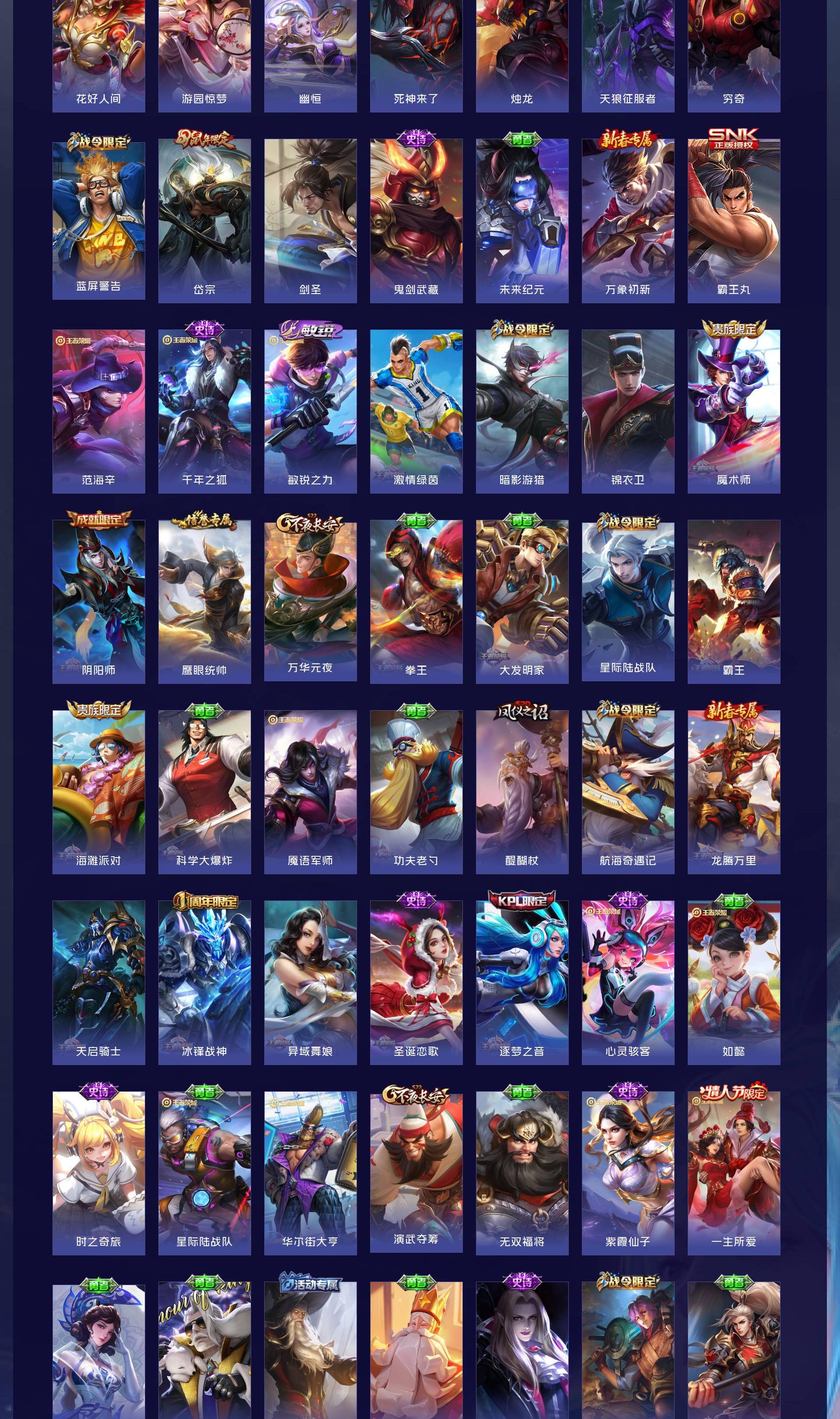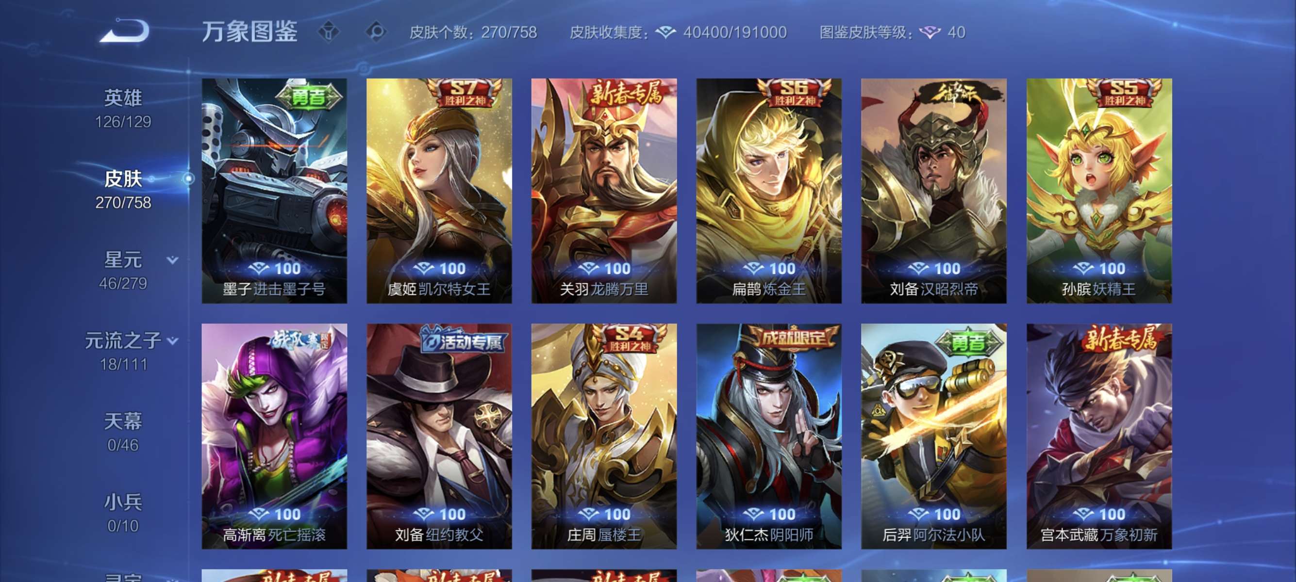 V8 皮肤270 英雄129 至尊星耀 荣耀典藏1 星传说2 传说20 其他皮肤255