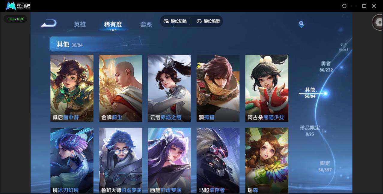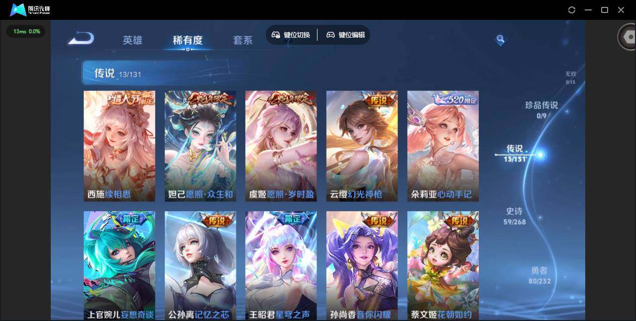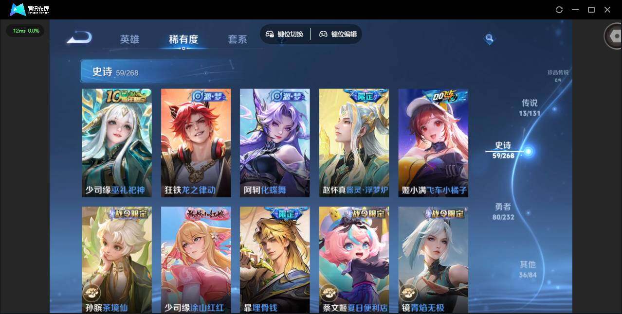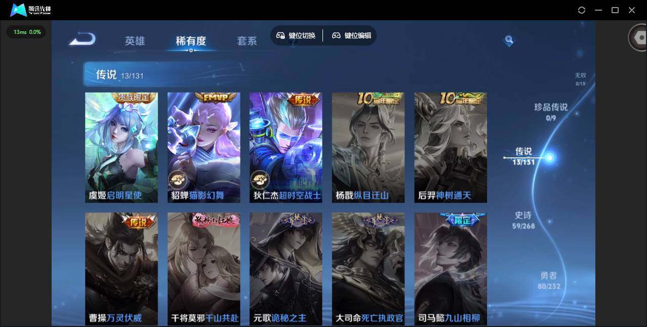 /实名: 可修改 贵族等级: V8 英雄数: 125 皮肤数: 189 荣耀水晶: 幻阙歌 传说皮: 猫影幻舞,超时空战士-狄仁杰,花朝如约,音你闪耀,记忆之芯,妄想奇谈,朵莉亚心动手记,幻光神枪,续相思 限定皮: 魔法小厨娘,时之奇旅-妲己,星穹之声,五谷丰年,神器·万象笔,山海·碧波行,愿照·众生和,愿照·岁时盈