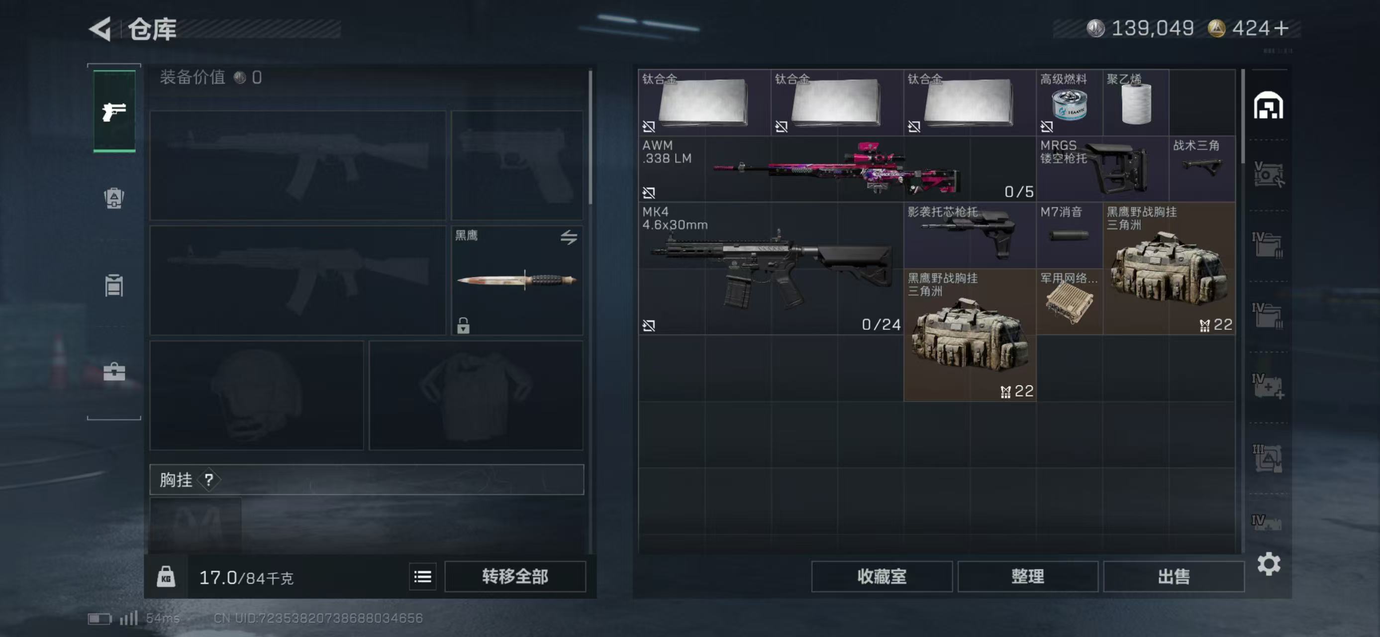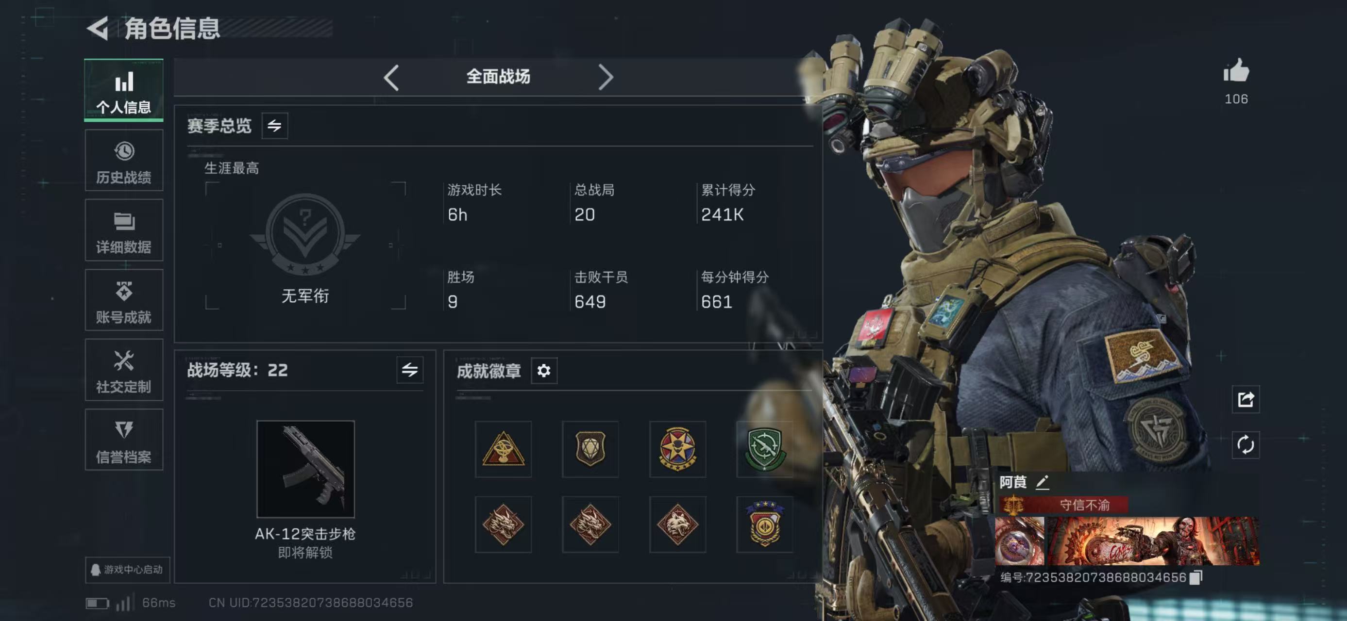 总资产87.35M,哈夫币 139.05K,战场等级:22 列兵,行动等级:60 钻石,角色皮肤5,