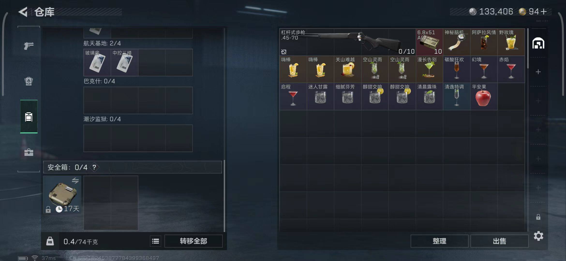总资产(M):6M/哈夫币(K):133K/哈夫币(K):133K/传说枪皮数:16/全面战场等级: