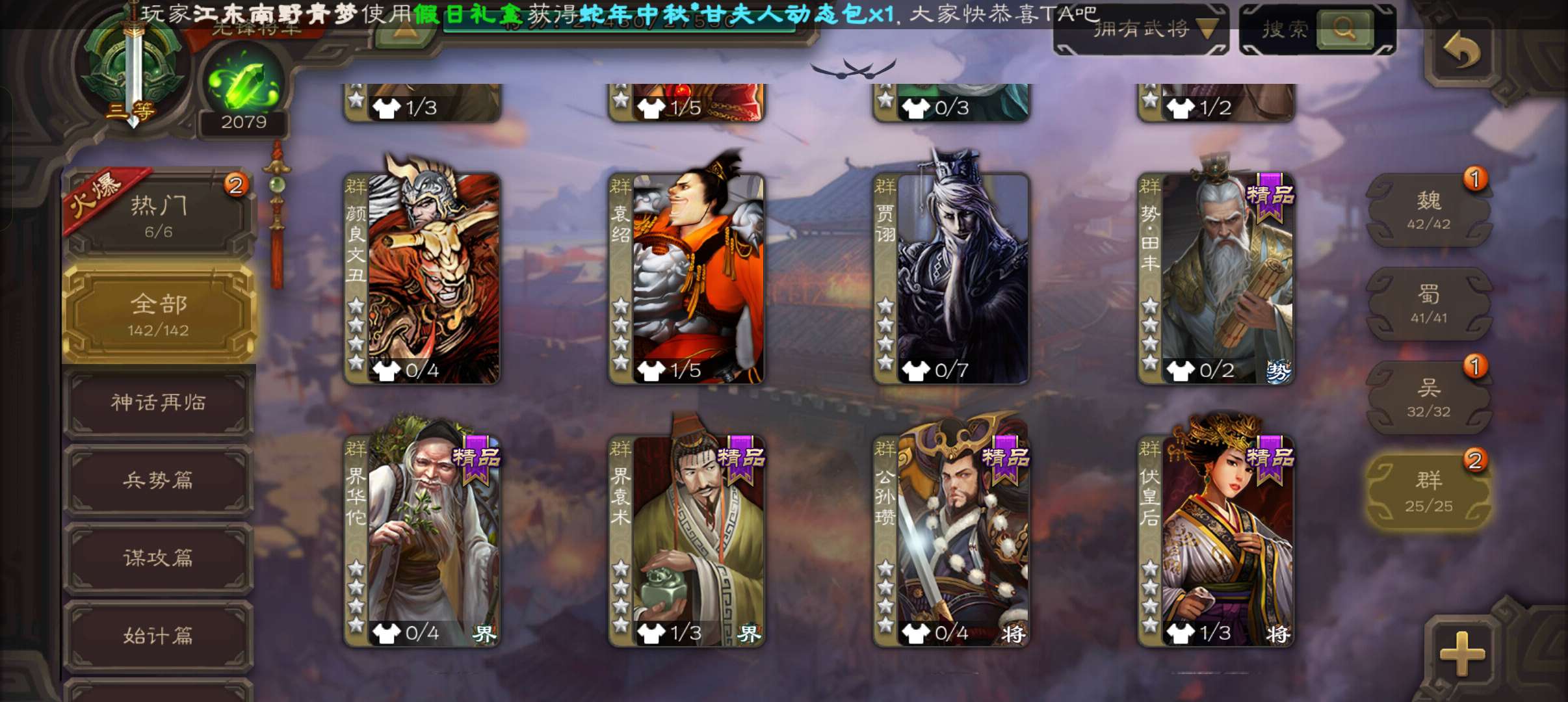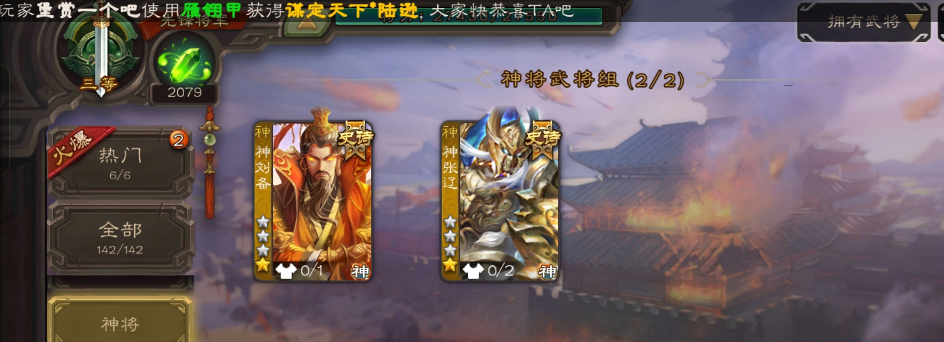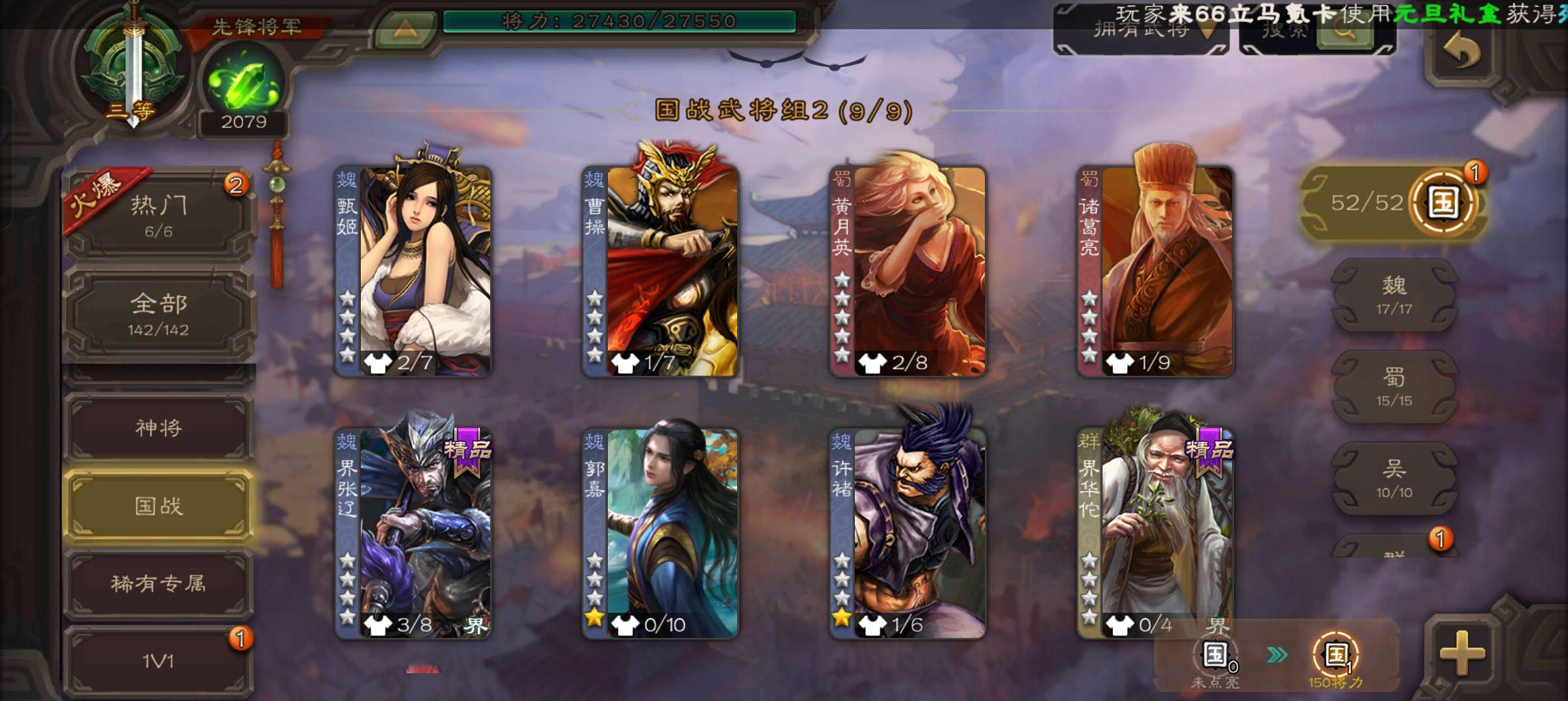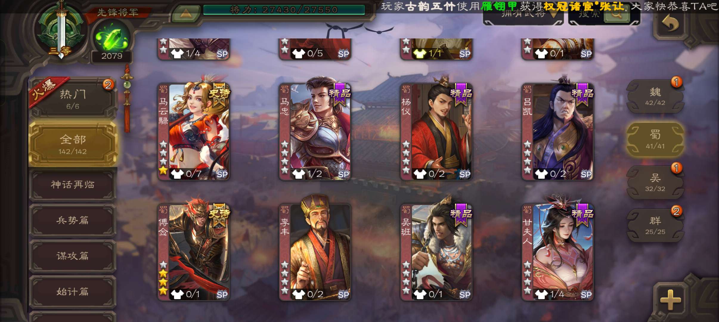 5史诗先锋,2千魂,傅佥回廊动态王元姬神刘备神张辽马云騄,甘夫人势陈到势田丰界孙权谋小乔142将