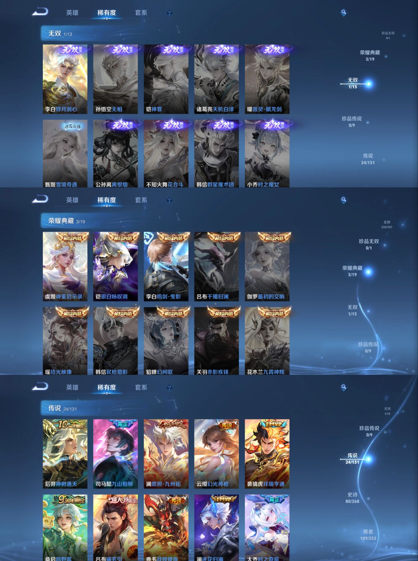 MWZ104476【v8 1无双 3典藏 24传说 3星传说(星际治安官 幽冥火 幽冥之眼)】安卓Q-232皮肤-127英雄 【无双皮肤】 碎月剑心 【典藏皮肤】 神鉴启示录 鸣剑·曳影 银白咏叹调 【传说皮肤】 神树通天 浮生妄 鸣野蒿 时之奇旅 逐花归海 九山相柳 战鼓燎原 曦玄引 幻光神枪 祥瑞亨通 愿照·九州拓 深海之息 无双飞将 地狱之眼 炽阳神光 飞鸢探春 异界灵契 乞巧织情 游龙清影 云鹰飞将 启明星使 黄金白羊座 时雨天司 【史诗皮肤】 蔬乡物语 蔬乡物语 破空之剑 茶境仙 星